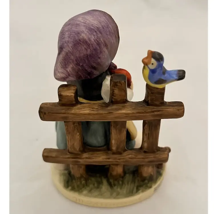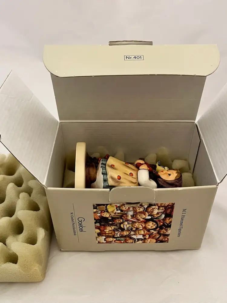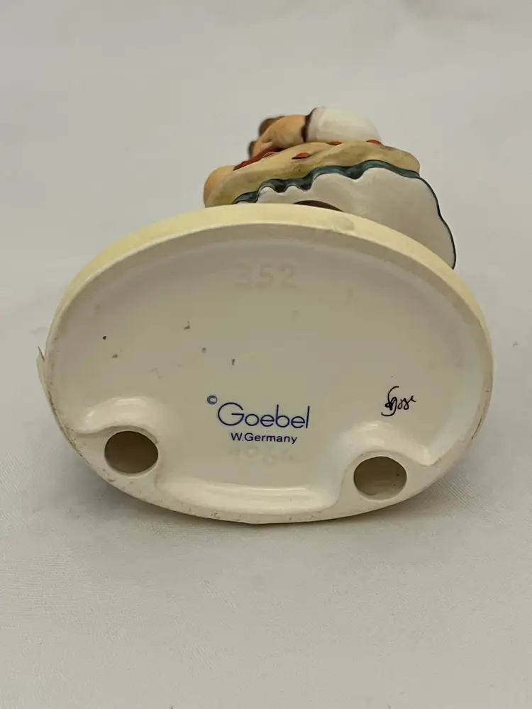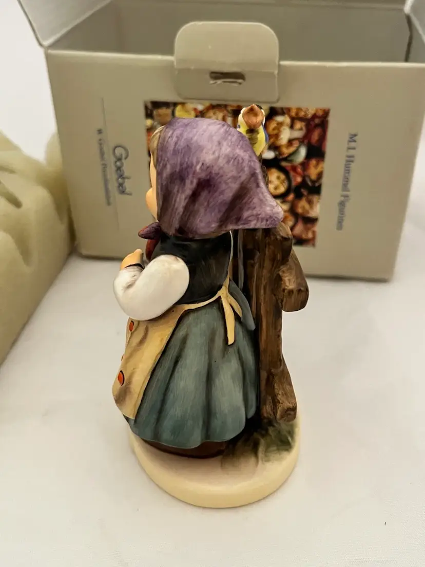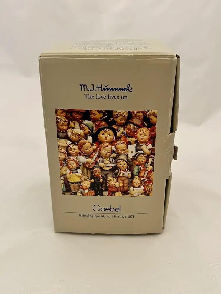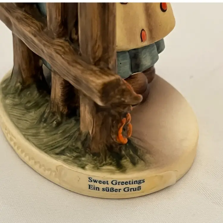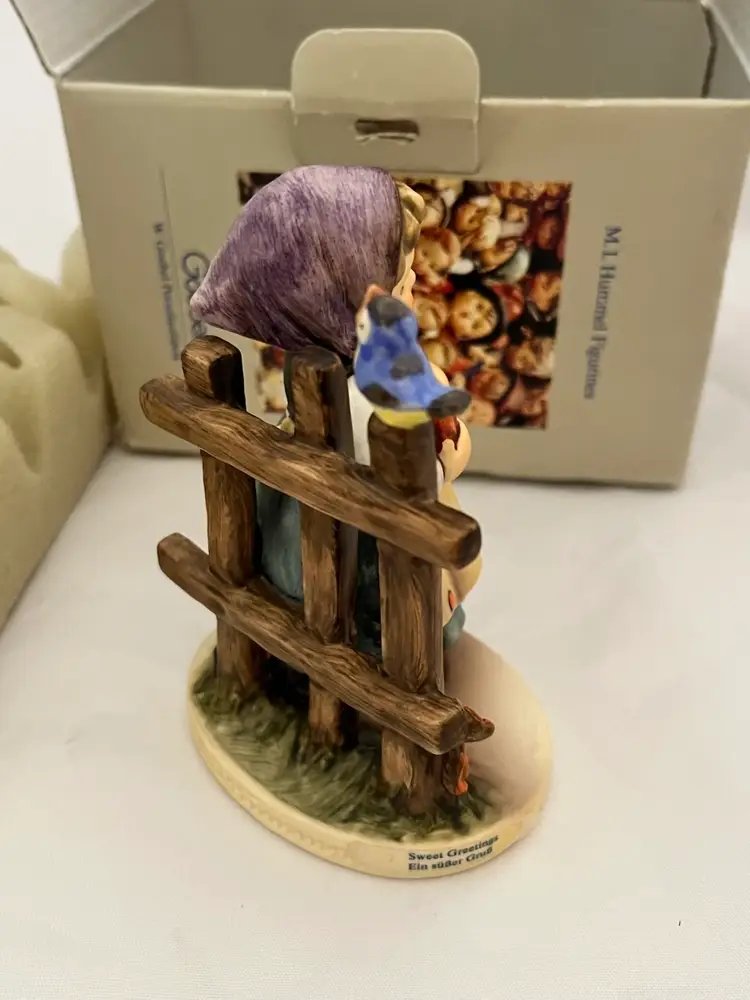 Vintage Goebel Hummel figurine from 1964 features a charming girl holding a heart-shaped balloon, titled "Sweet Greetings". Comes in its original box.