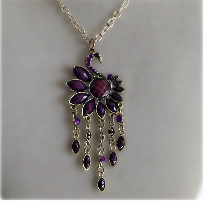 Vintage gold and purple stone peacock pendant necklace. The pendant measures 1 1/2” x 3”. The gold chain measures 20”. Materials are metal, glass and plastic.