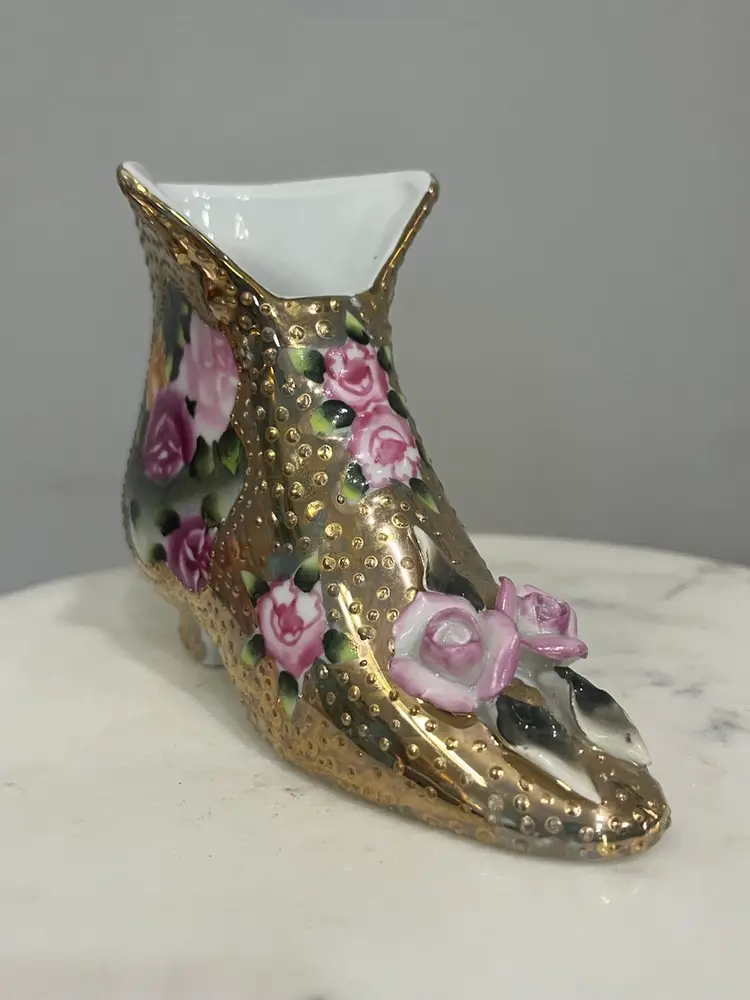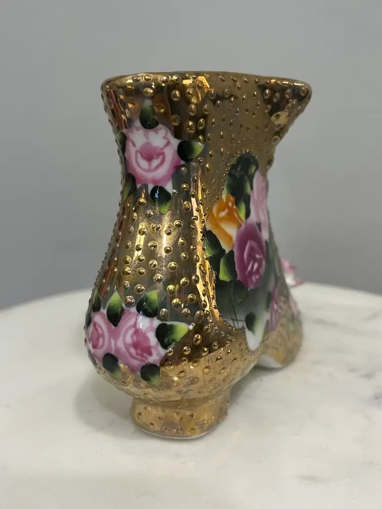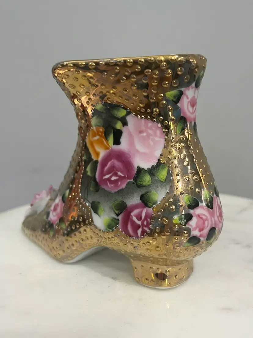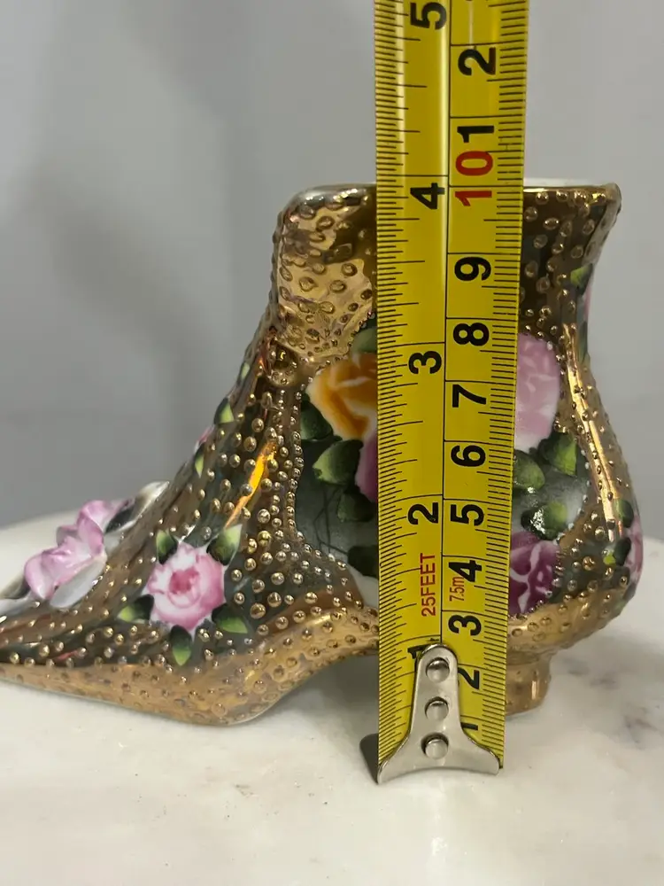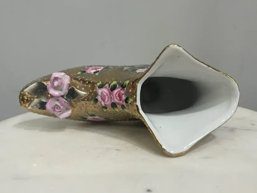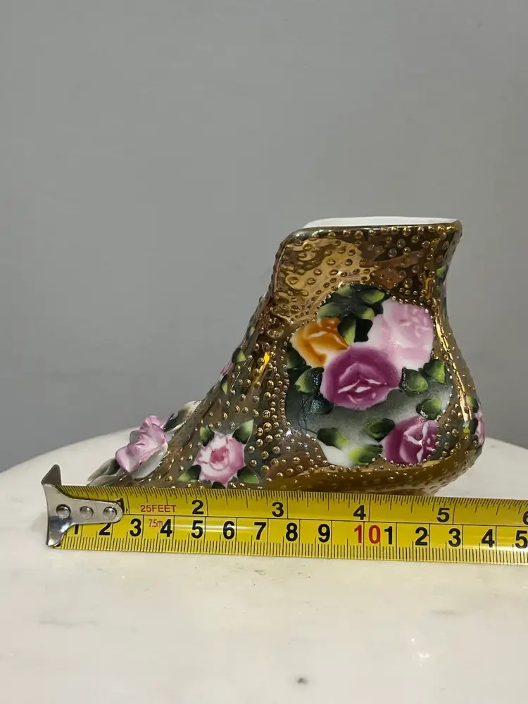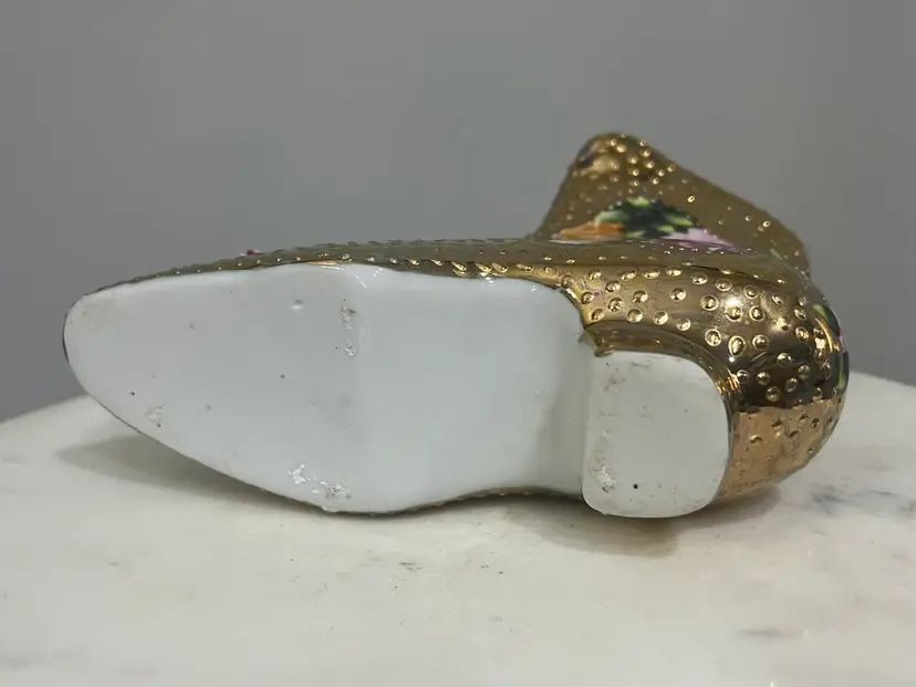 In decent preowned condition. Some fading to some of the gold details as shown. A few small “chips” to some of the raised bumps as shown. Please review all photos for details. Measures 4” tall and 5.5” long. Message me with any questions.