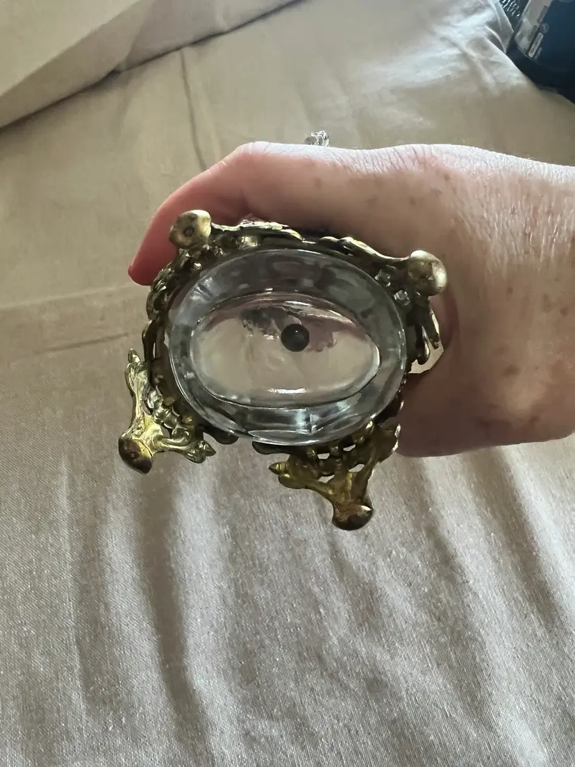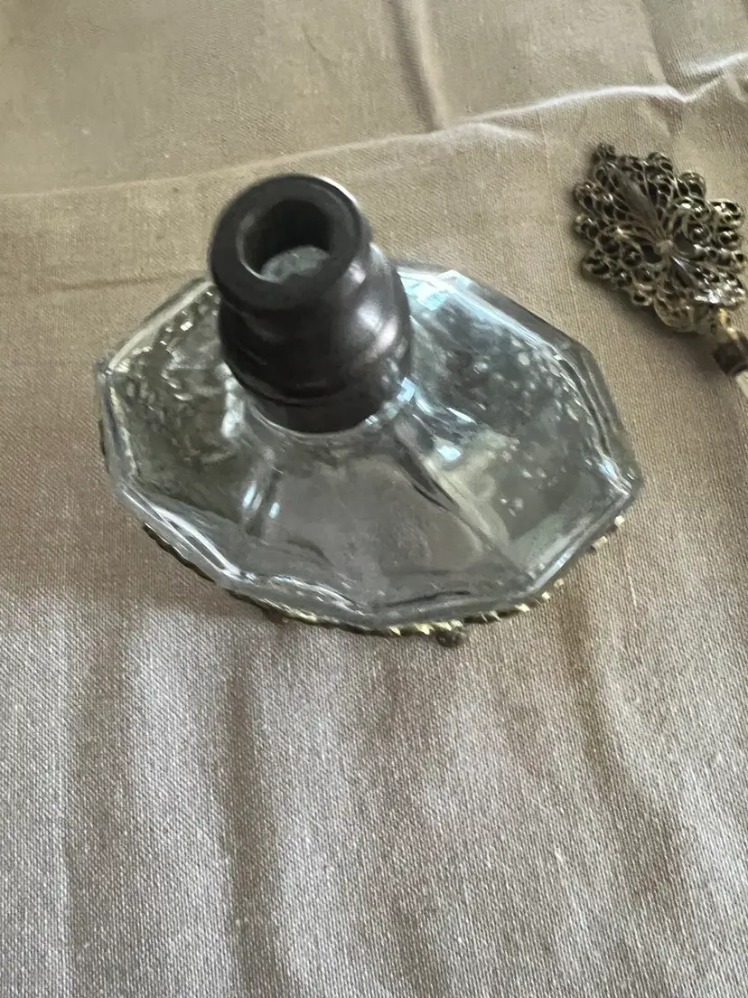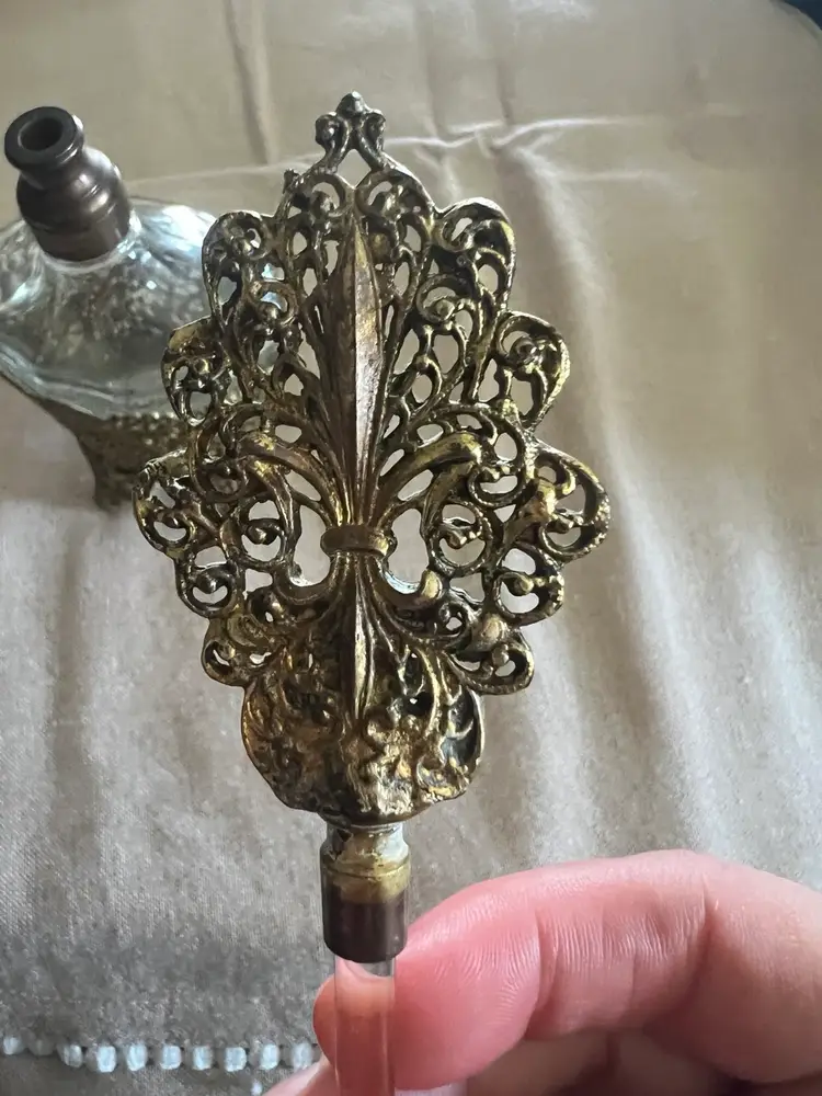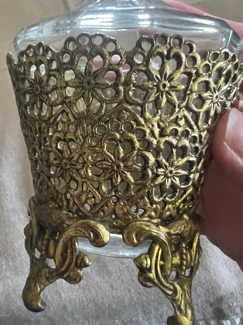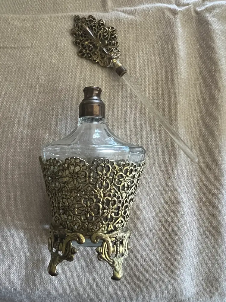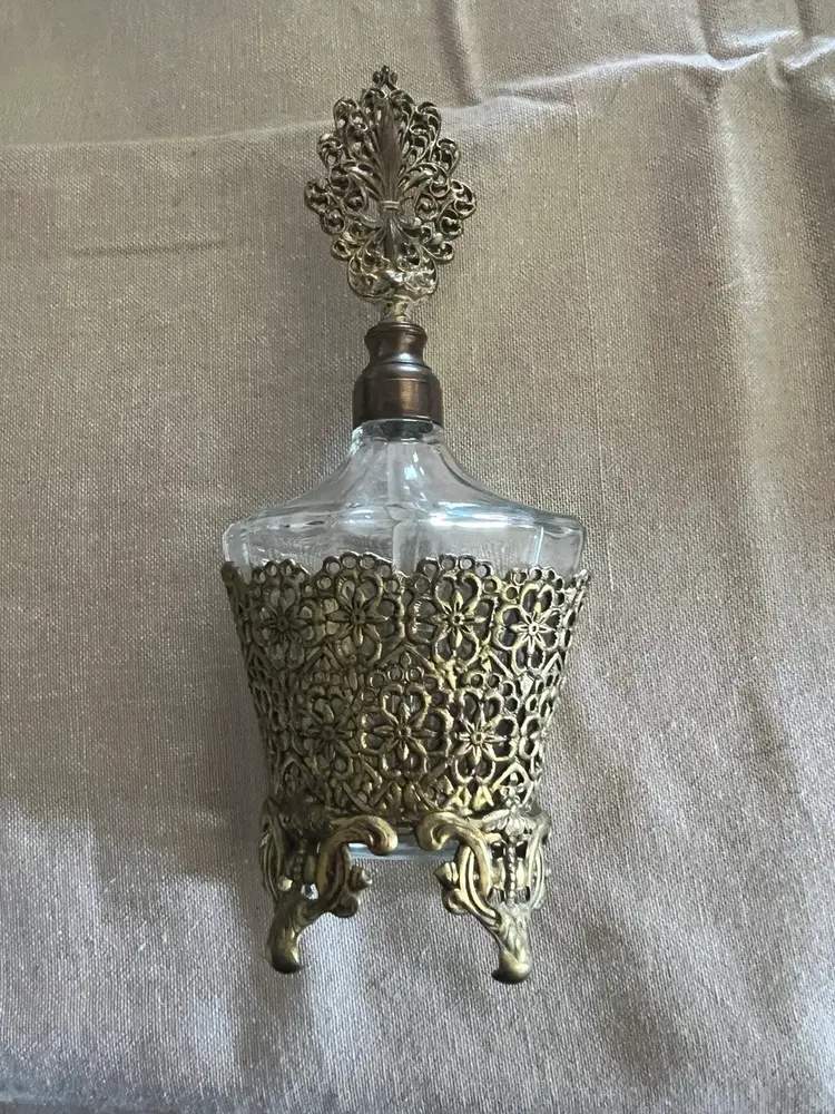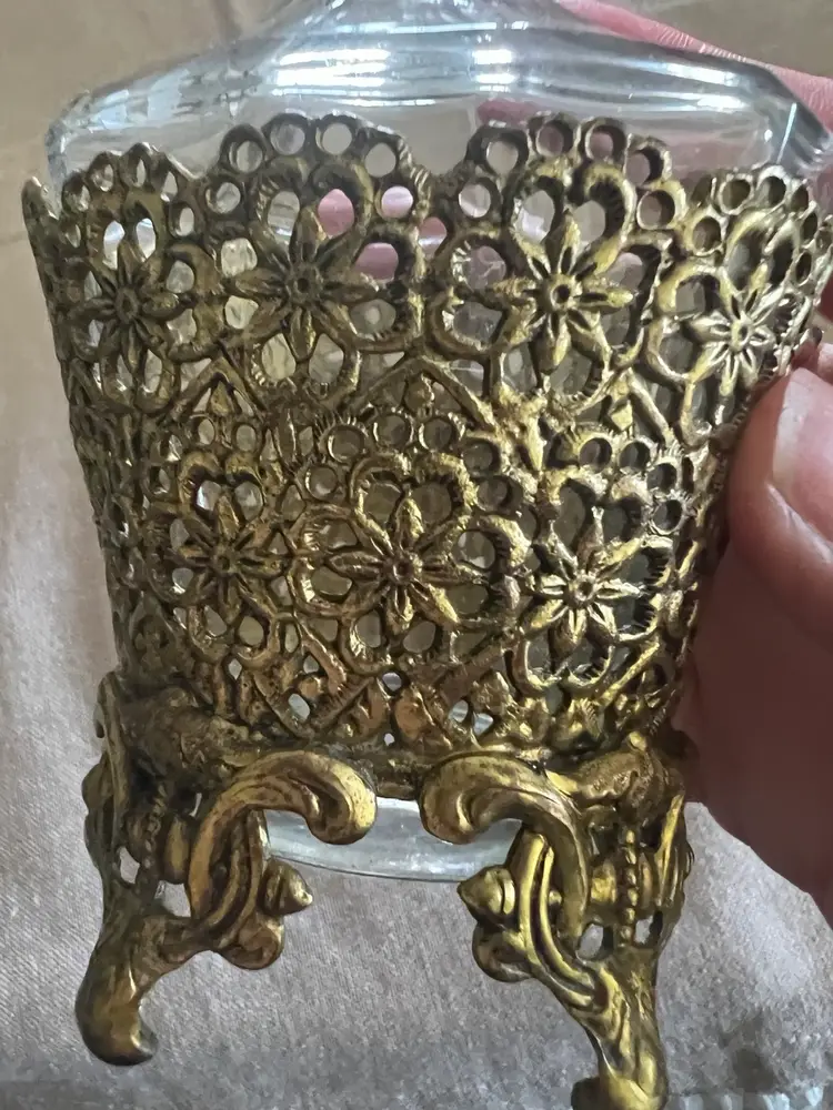 Hollywood regency hello! ๐ Vintage 24K Gold Plated 7.75โ Ormolu Filigree Perfume Vanity Bottle w/ Glass Daube. Overall great vintage condition, no chips cracks etc! Made in Germany Aprox., 8in X 4in