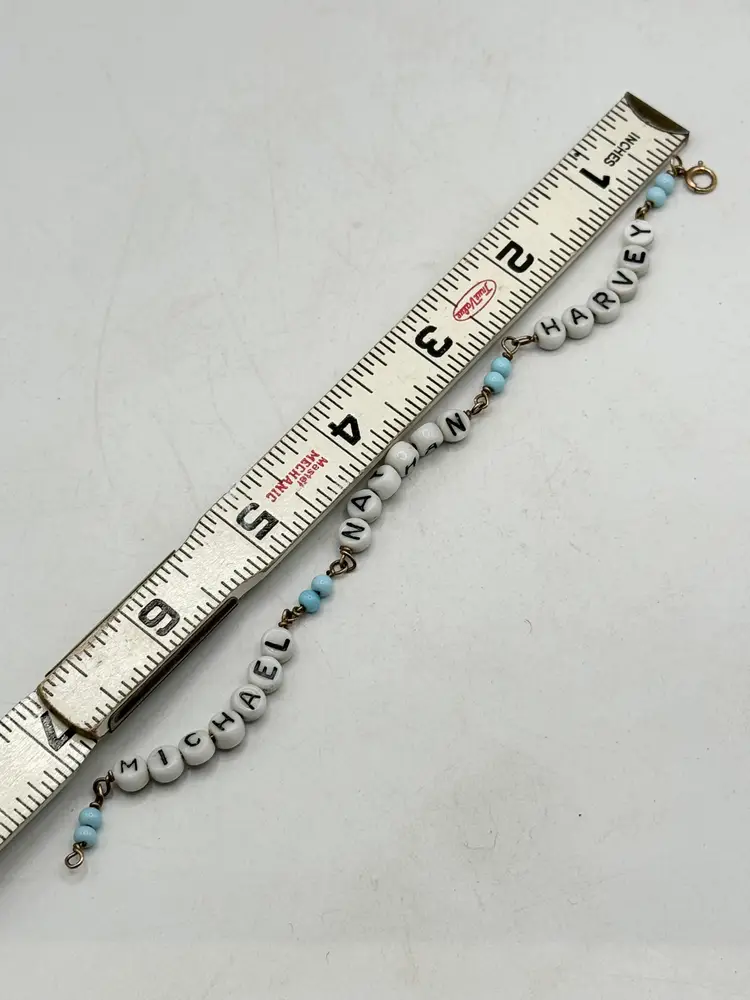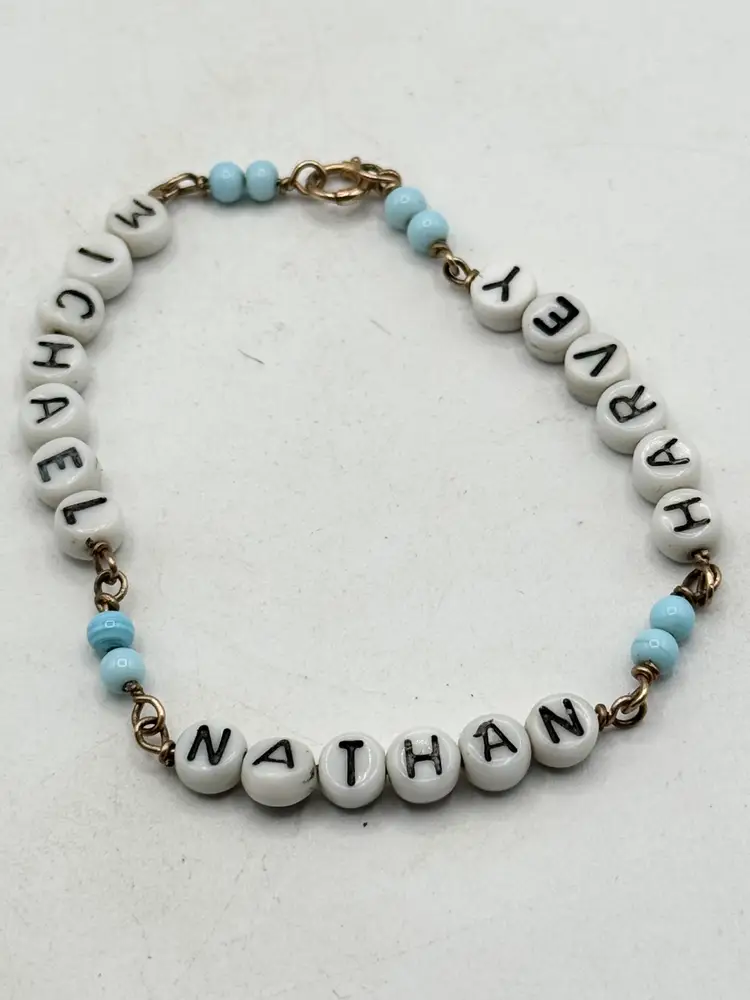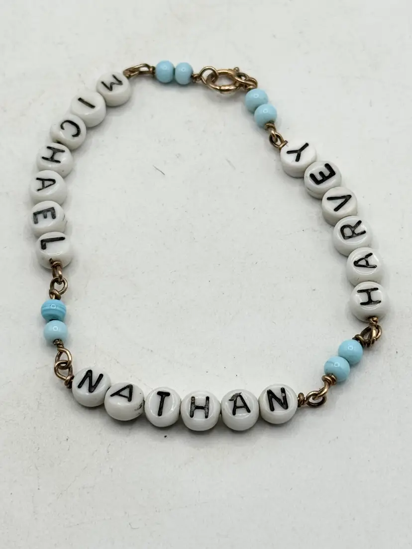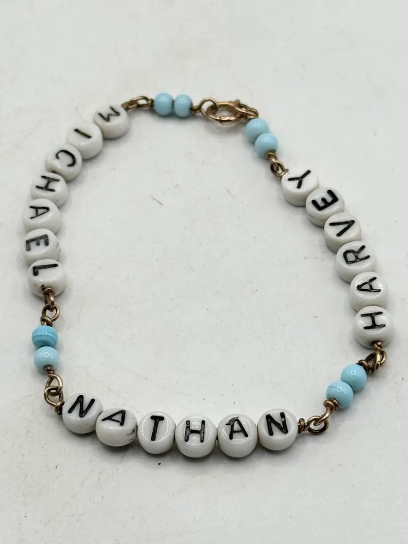 Vintage gold filled beaded name bracelet. Clasp signed 1/20 12k gf. Names read Harvey, Michael, Nathan. Beads and chain link. Vintage bracelet. MN54G.
