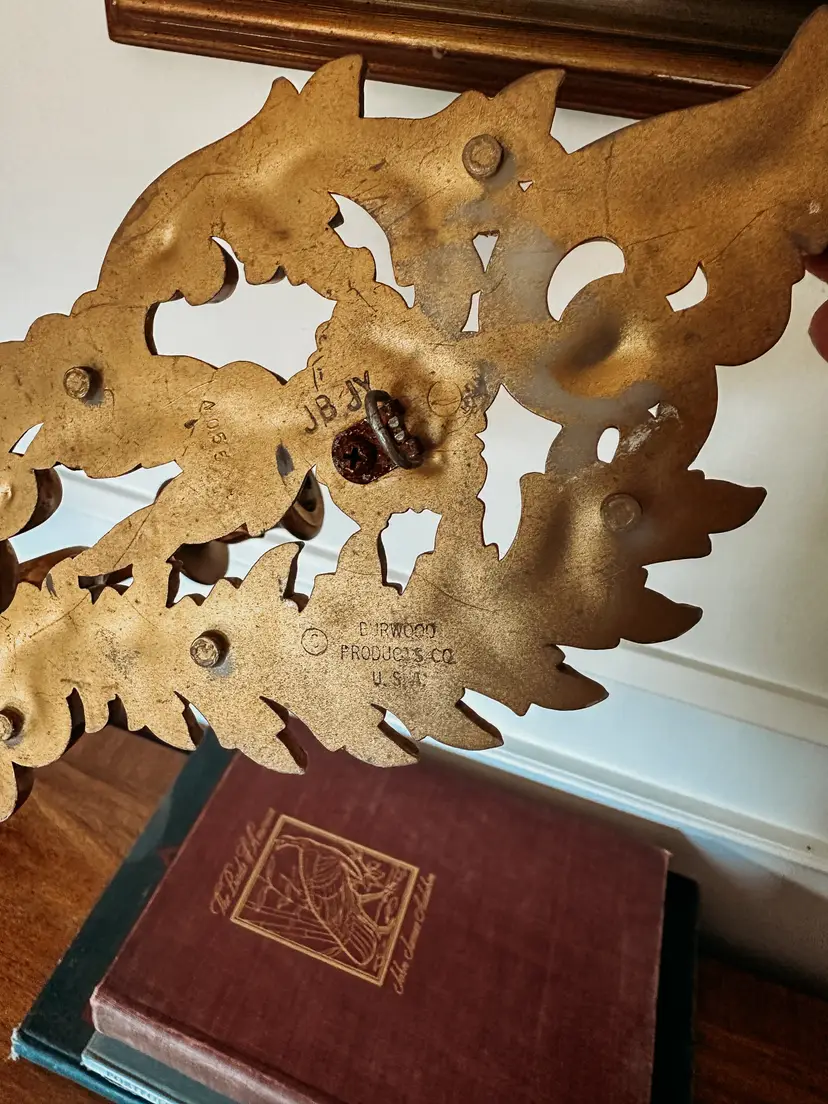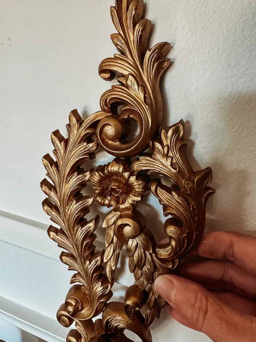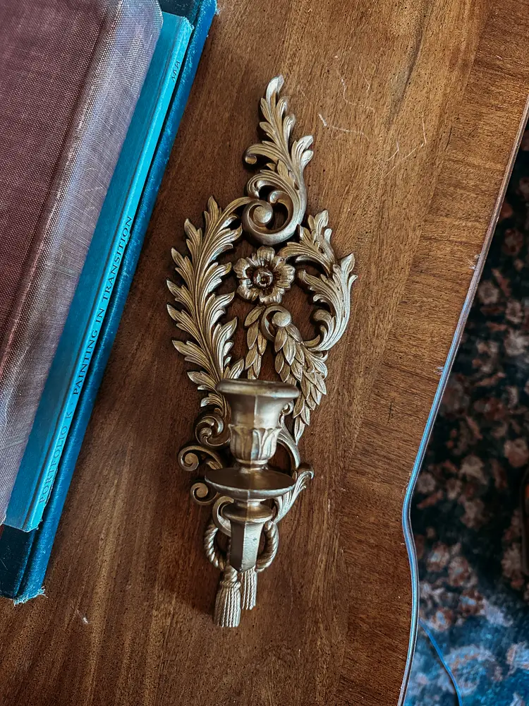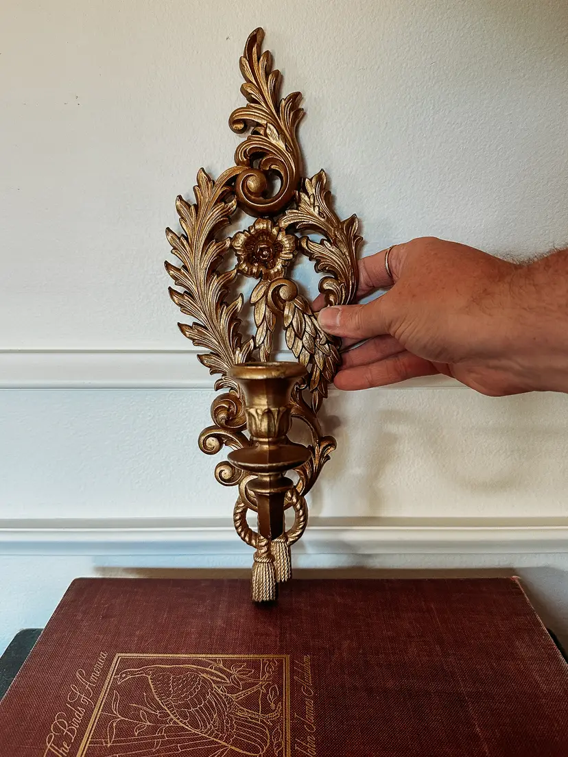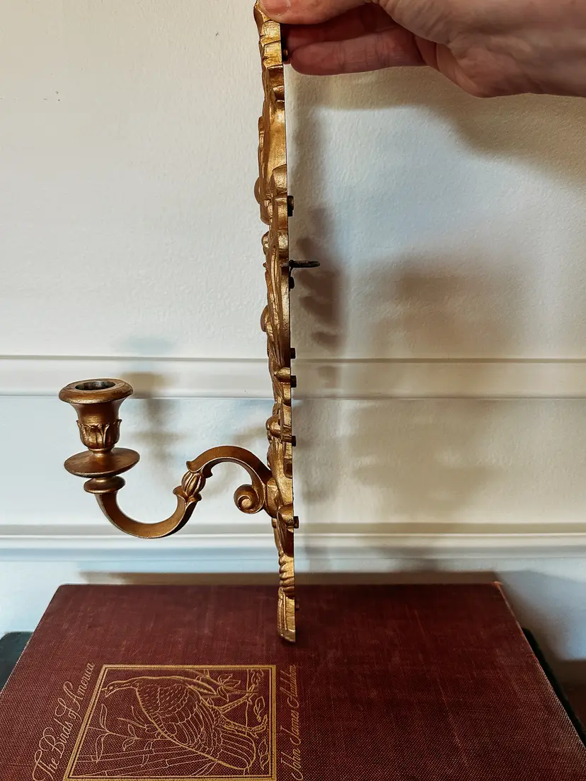 This gold colored wall candle sconce is from the 1960s and absolutely fabulous This screams Hollywood Regency with its ornate floral leaves and elegant rope detail.