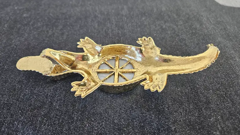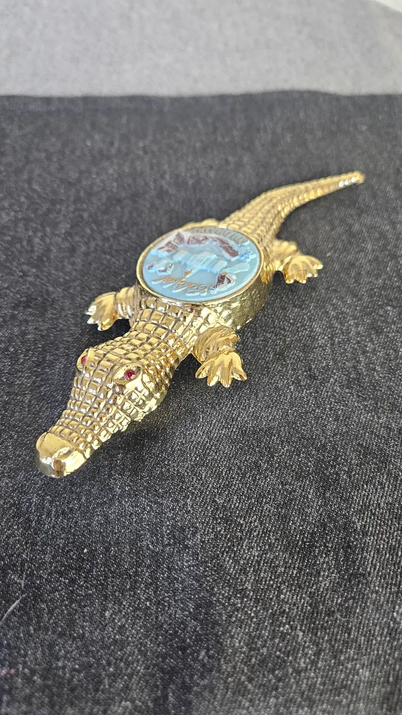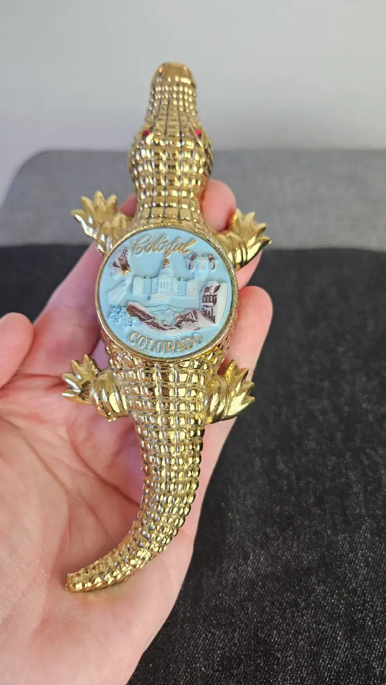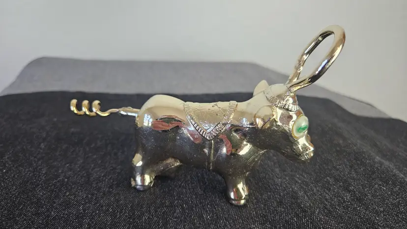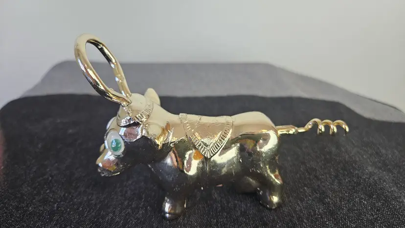 Unique items for your retro home bar or vintage barware collection! These gold plated bottle opens are functional but mostly fun, hearkening back to the 1950s and 1960s when kitsch and glitz was in. Alligator with rhinestone eyes is a "Colorful Colorado" souvenir. Bull with googly eyes is made in Japan and has both a bottle opener and a corkscrew tail. In good pre-owned condition. May have small scratches/scuffs due to use.