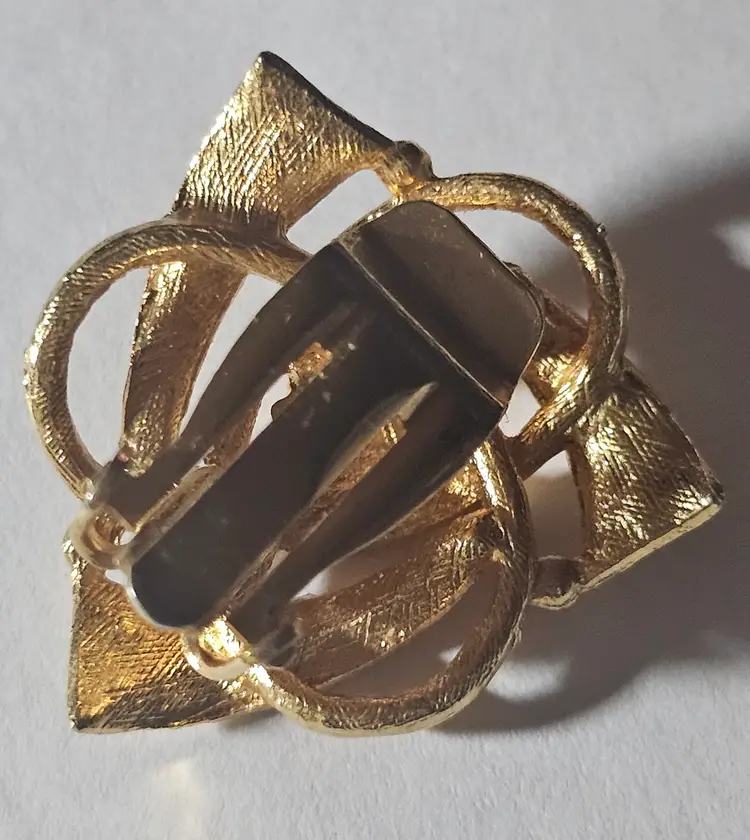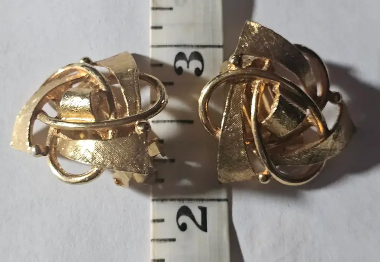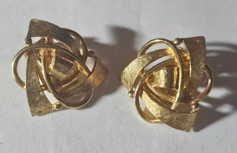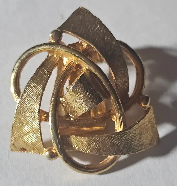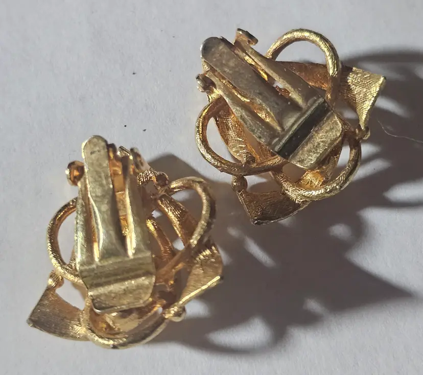 These Vintage Gold Tone Atomic Triangle Woven Open Work Clip On Earrings are a stylish and unique addition to any jewelry collection. The clip-on closure makes them easy to wear, while the retro design adds a touch of nostalgia to your outfit. Crafted with gold base metal, these earrings feature a geometric triangle shape with intricate woven detailing. Perfect for those who appreciate vintage jewelry with a modern twist.