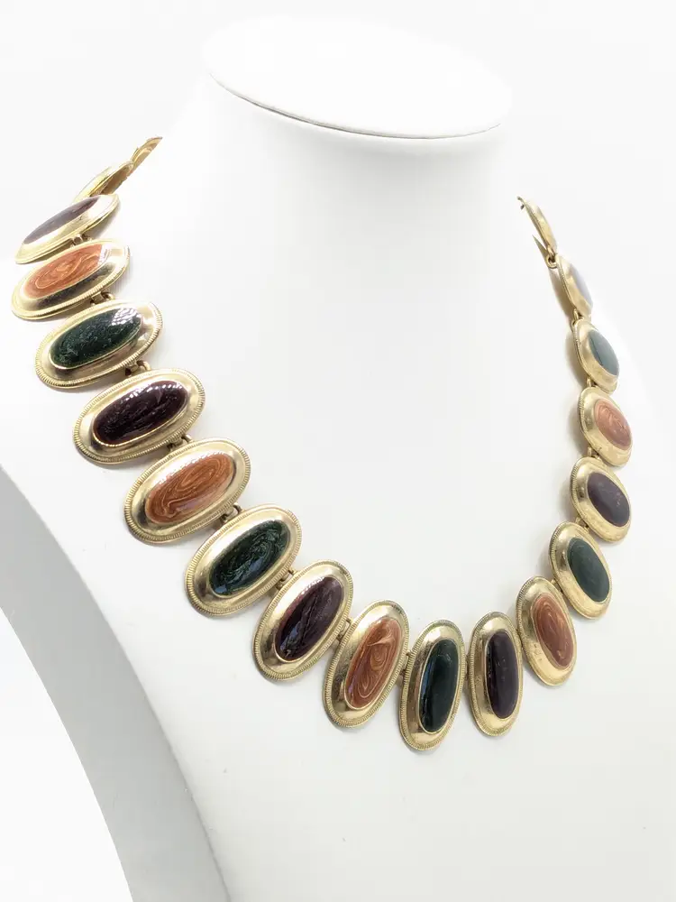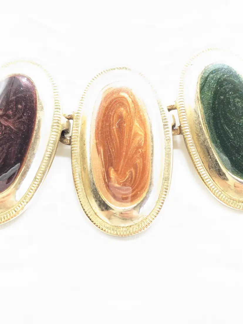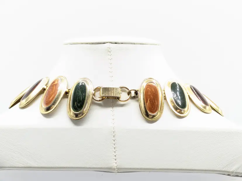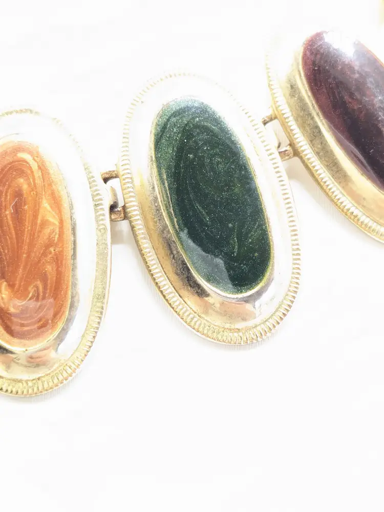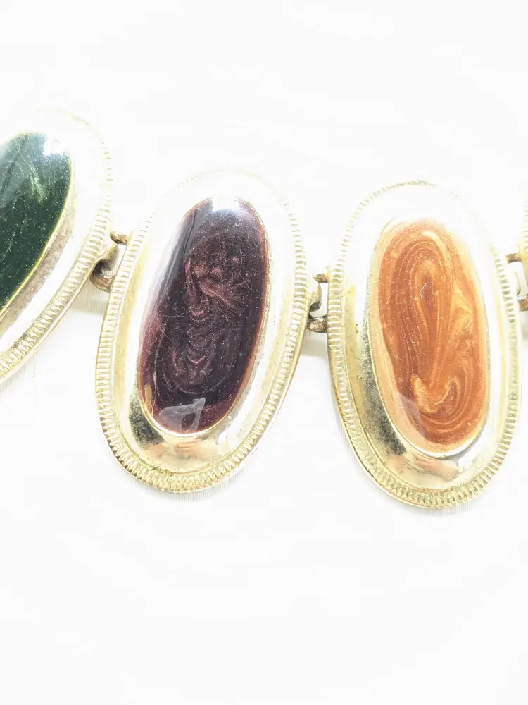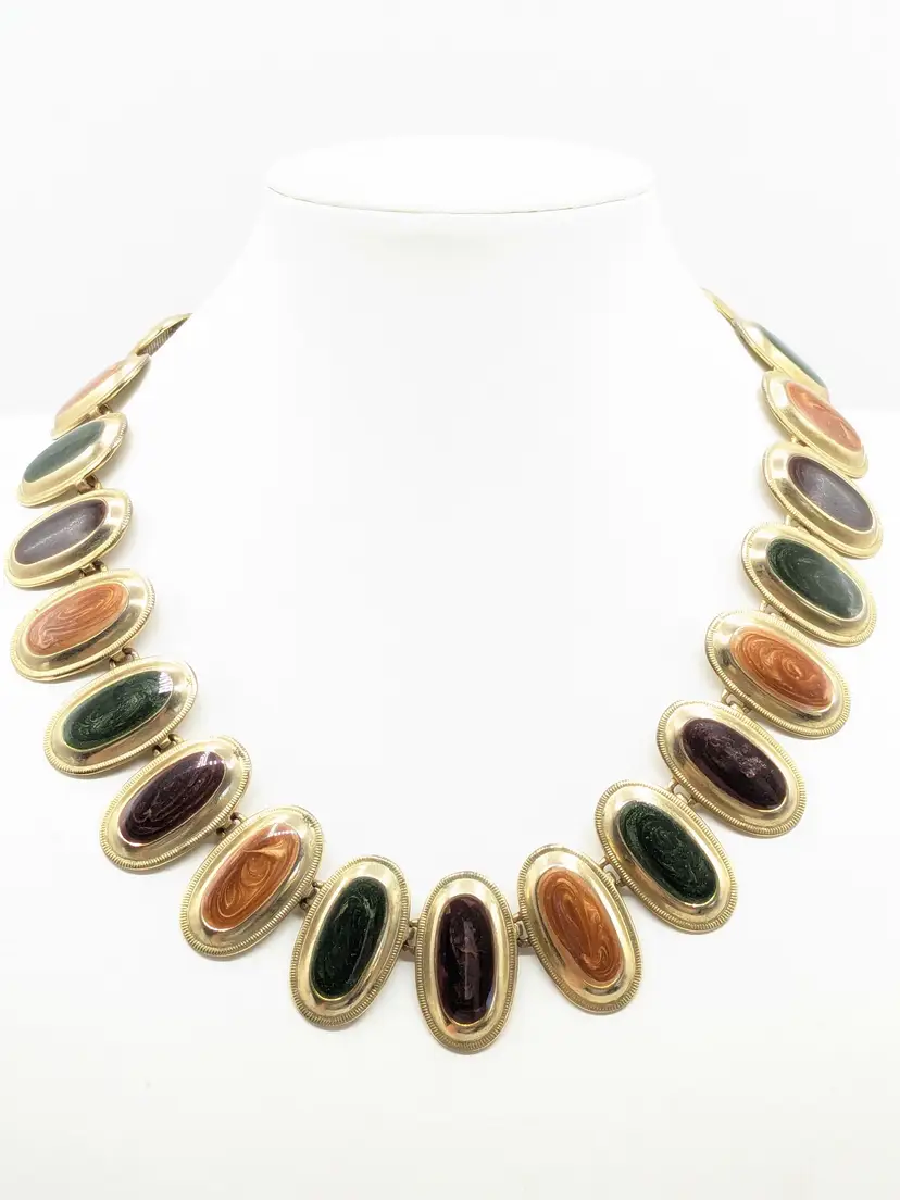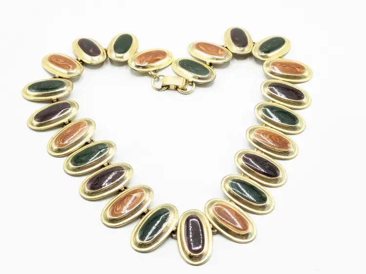 Good condition with some discolor on the back of necklace. Great colors for fall, orange, burgundy, and green enameled marbled look. Fold over clasp. Measures 17 1/2" and 1 1/8" wide. EN3