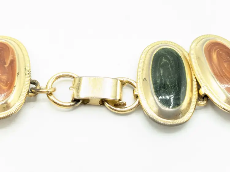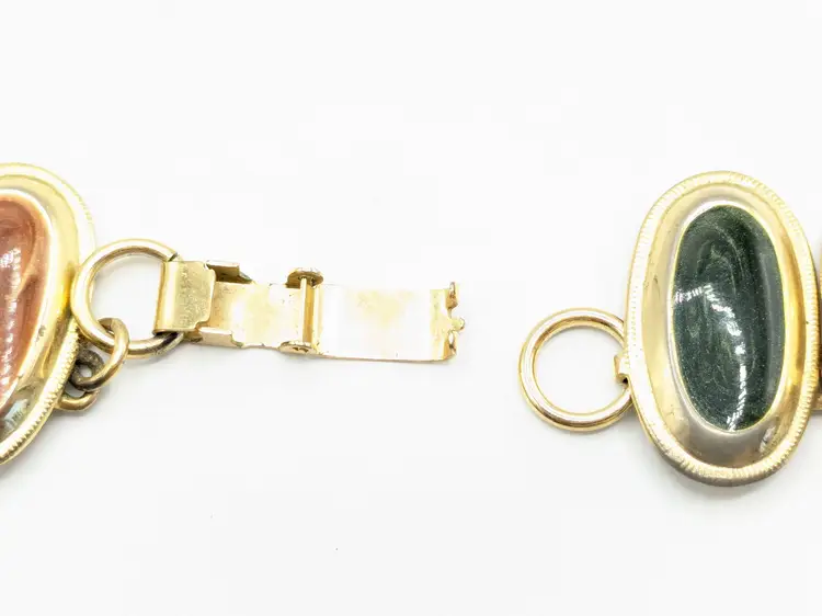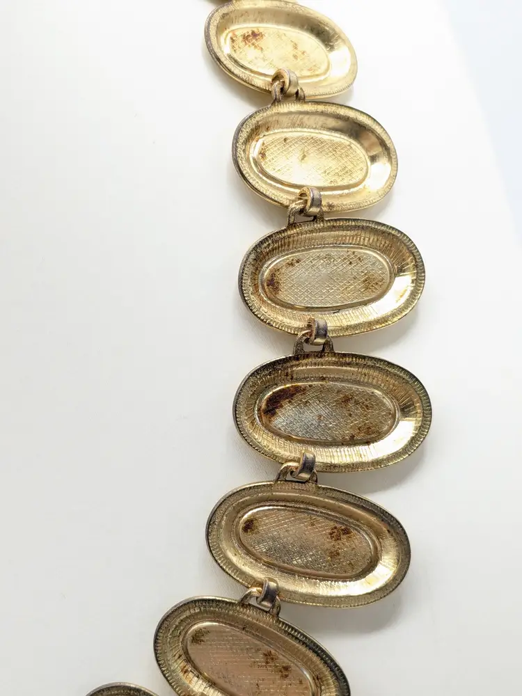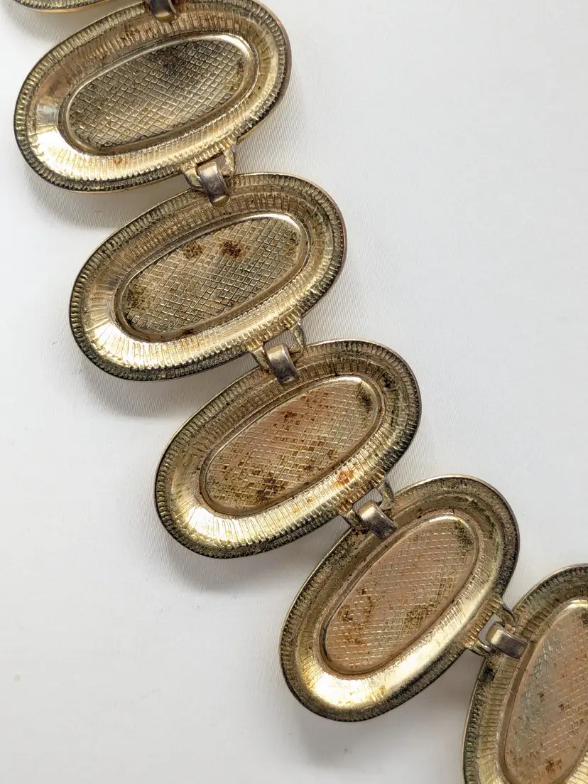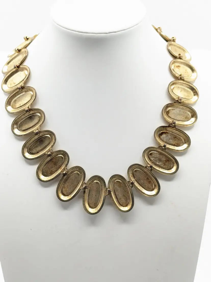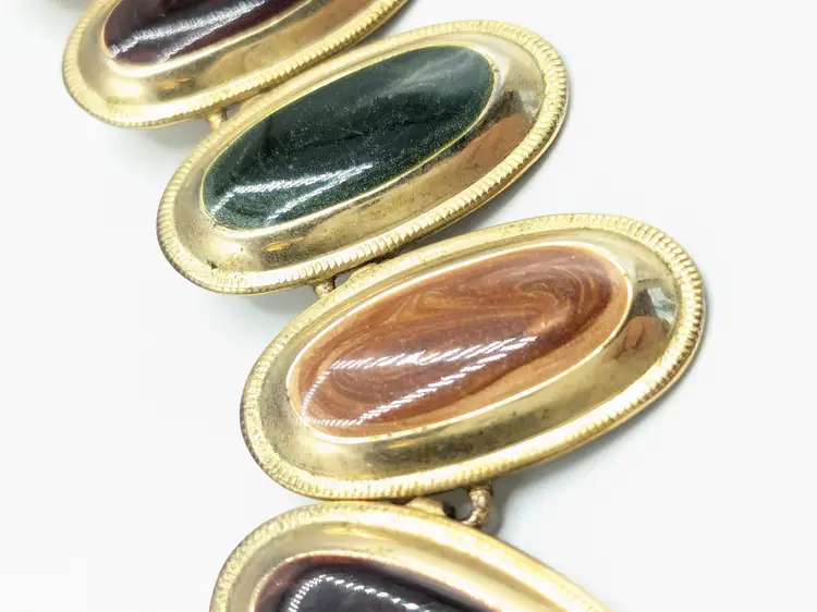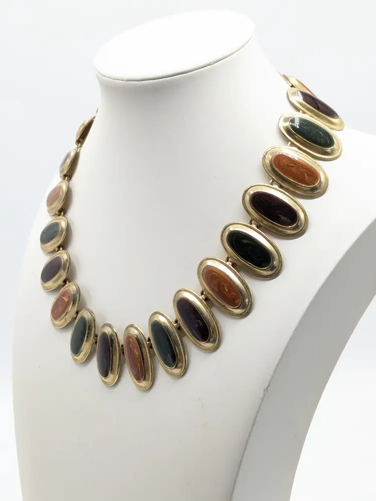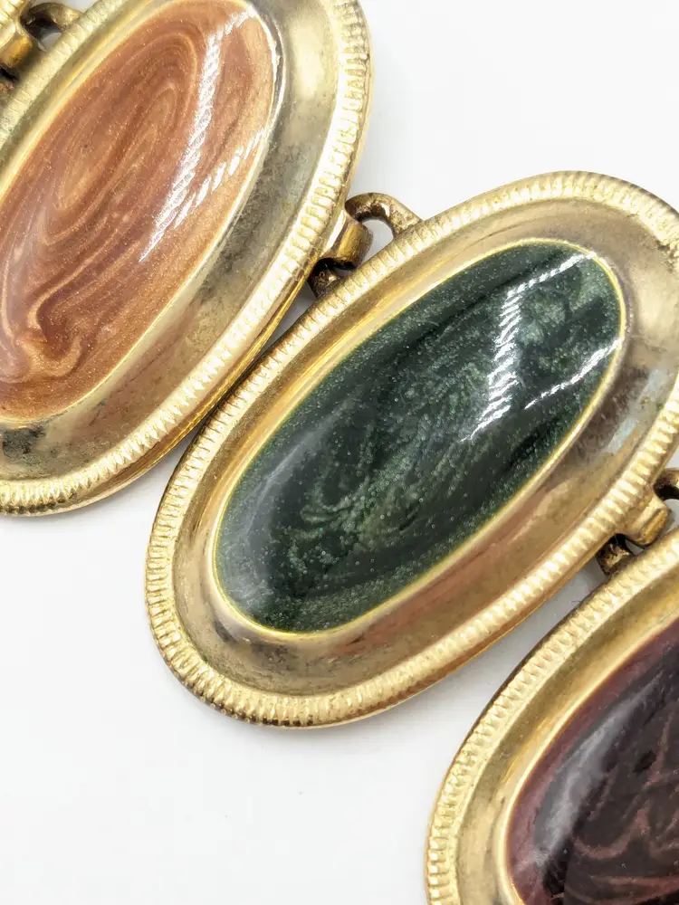 Good condition with some discolor on the back of necklace. Great colors for fall, orange, burgundy, and green enameled marbled look. Fold over clasp. Measures 17 1/2" and 1 1/8" wide. EN3