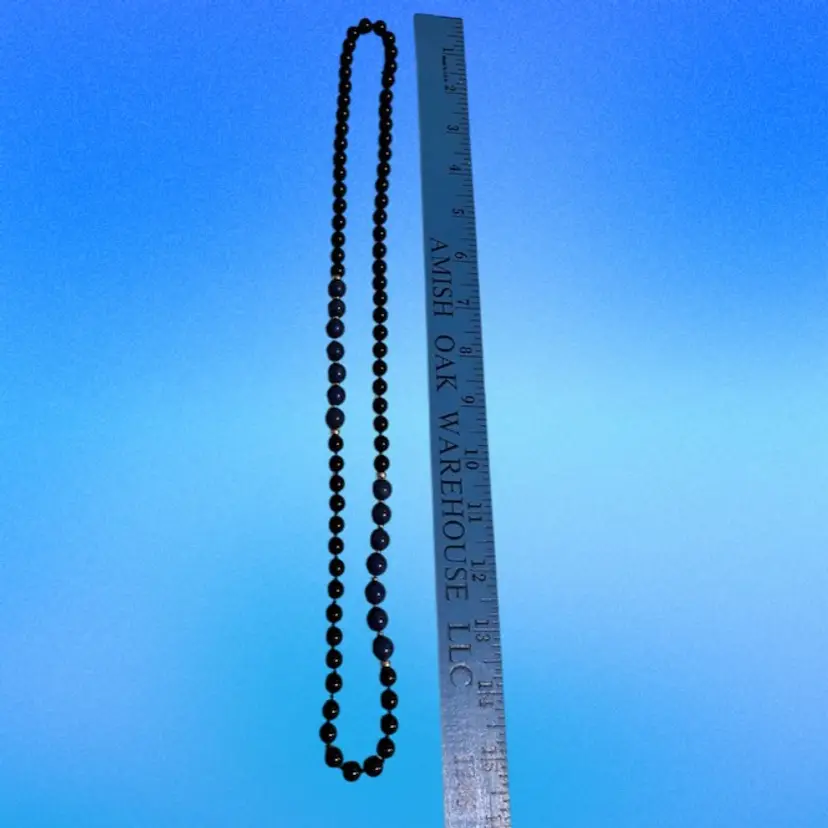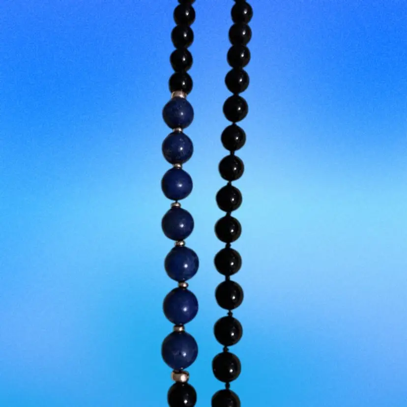 This vintage gold tone necklace features a unique moon-shaped pendant adorned with black onyx, lapis lazuli, and rhinestones. The beads are meticulously crafted and set in a prong setting, giving the piece an elegant and feminine look. The necklace is 18 inches long and made with natural gemstones, adding a touch of charm and sophistication to any outfit. Perfect for those who appreciate intricate details and vintage-inspired jewelry.