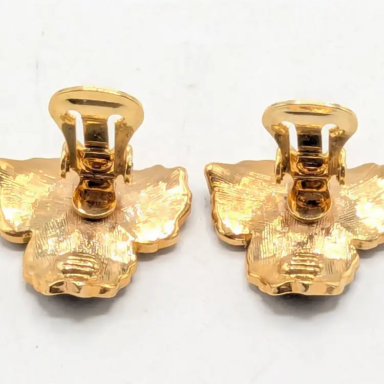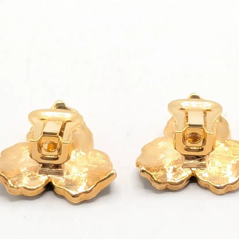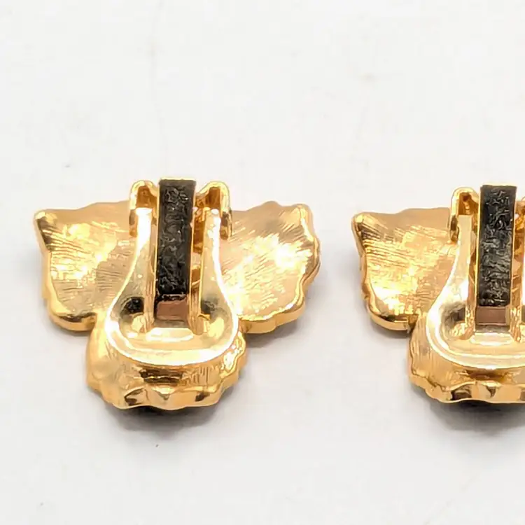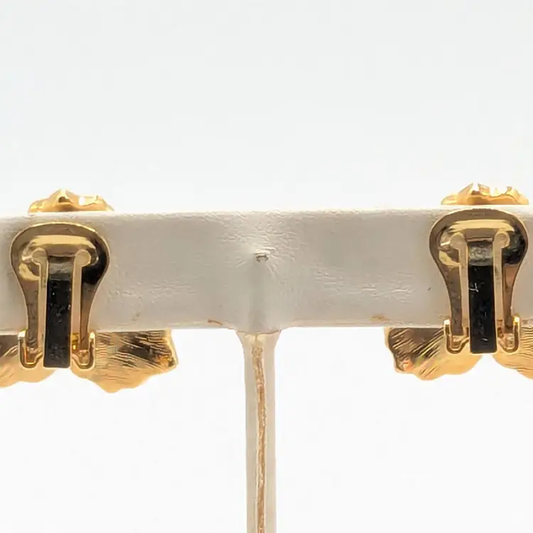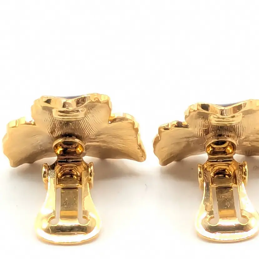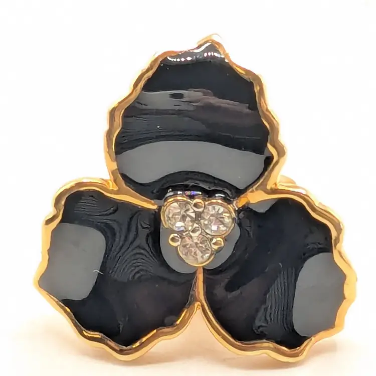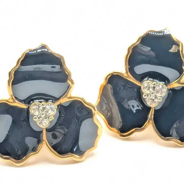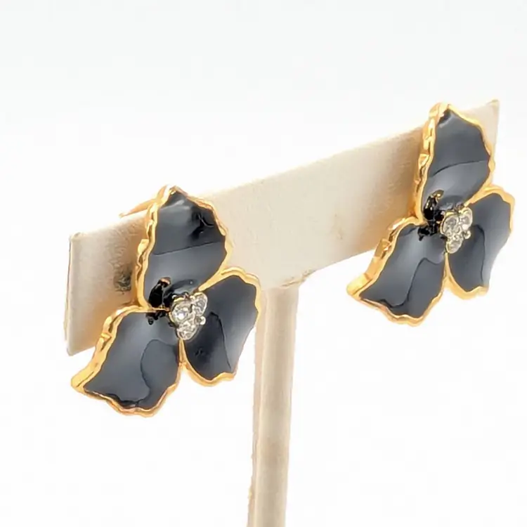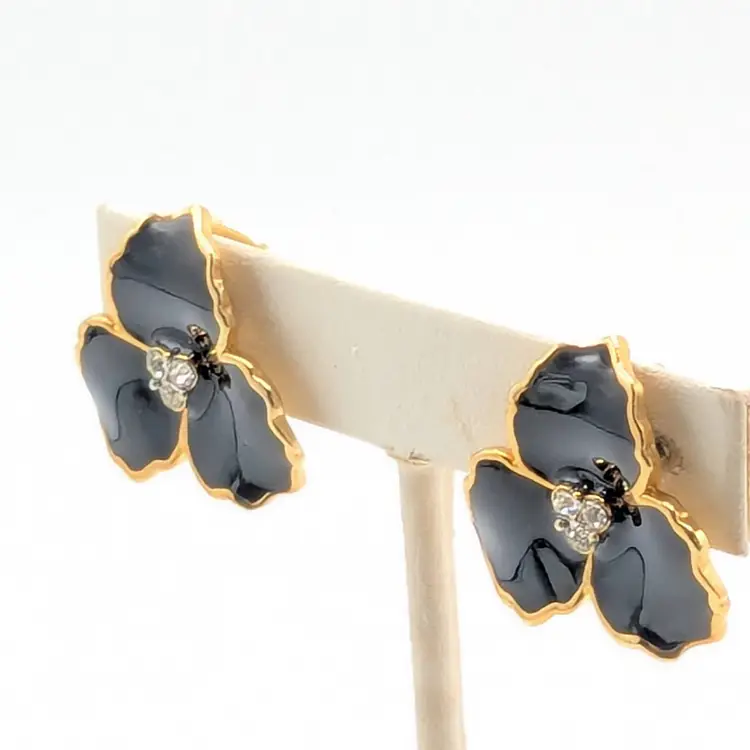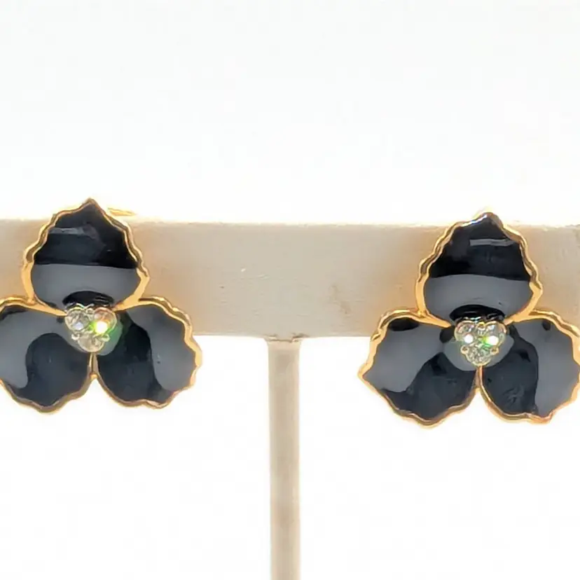 Beautiful! Good condition. Gold tone is bright and shiny. Black enamel petals with center comprised of 3 small rhinestones. Clip-on earrings. Measures 1". EN3