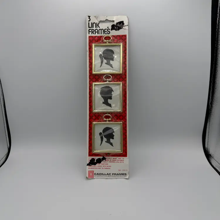 Vintage Set of 3 Gold Tone Cadillac Link Frames. Hooks with Glass Fronts. New Old Stock. Measures Approximately 2 1/4" Across.