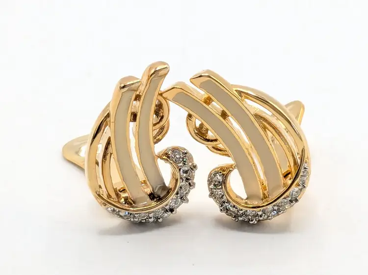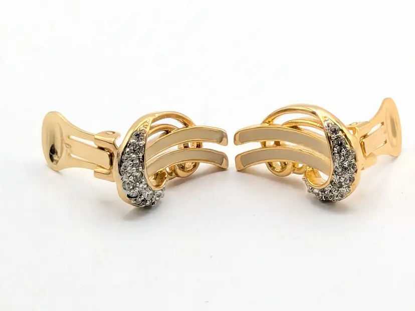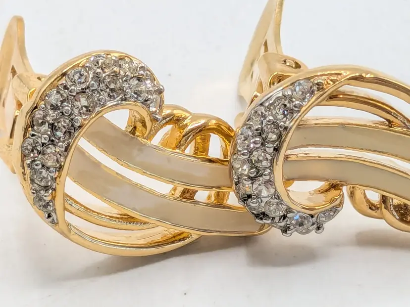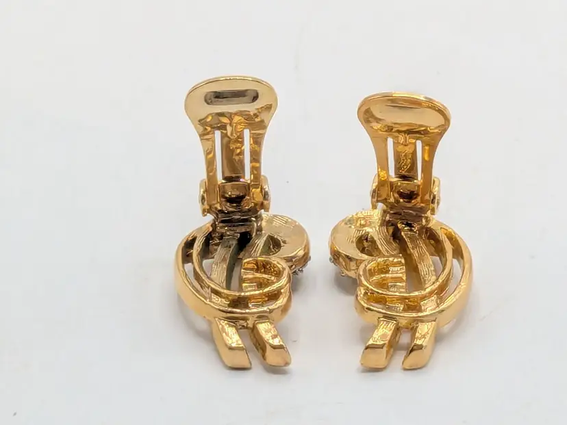 Good condition. Gold tone is bright and shiny with no colour loss. Rhinestones are all present and sparkly. Clip on earrings. Measures 1" in length and 5/8" wide. EN3