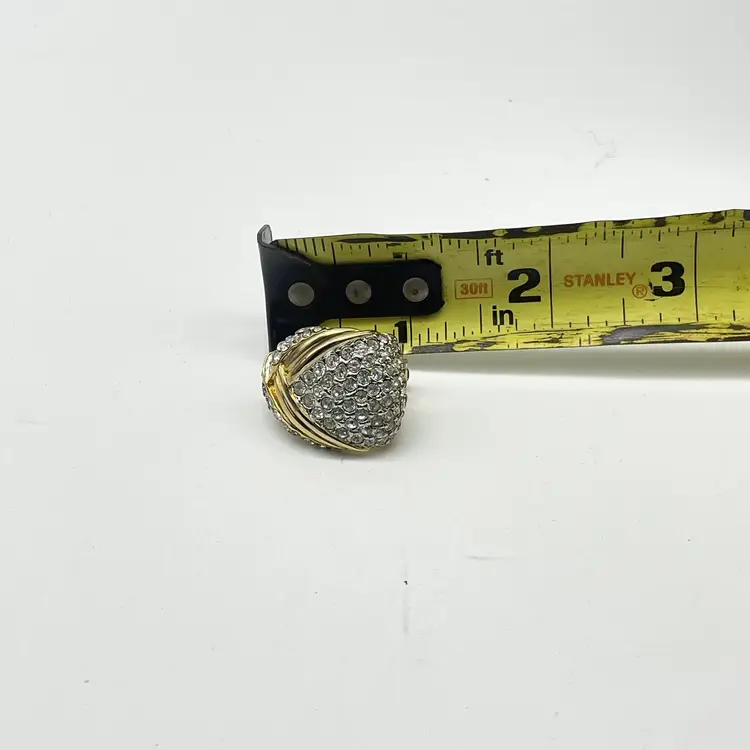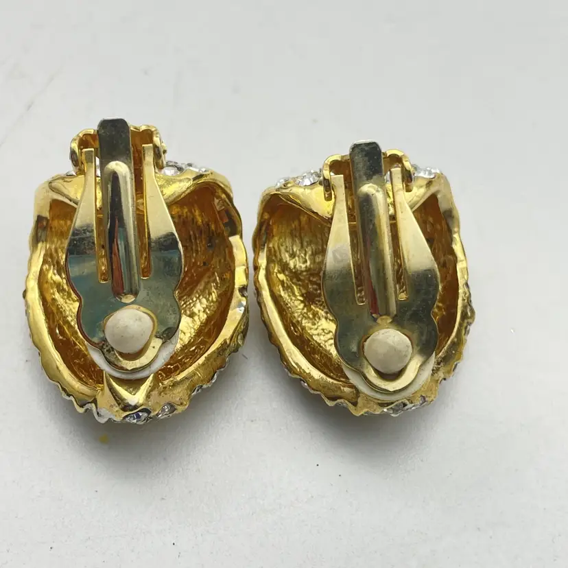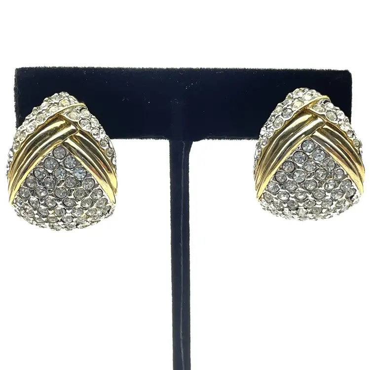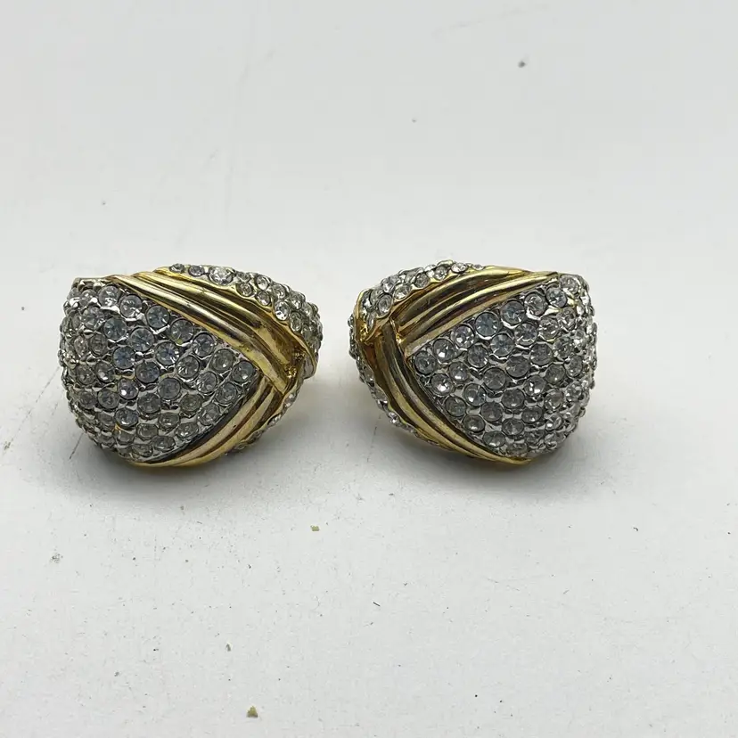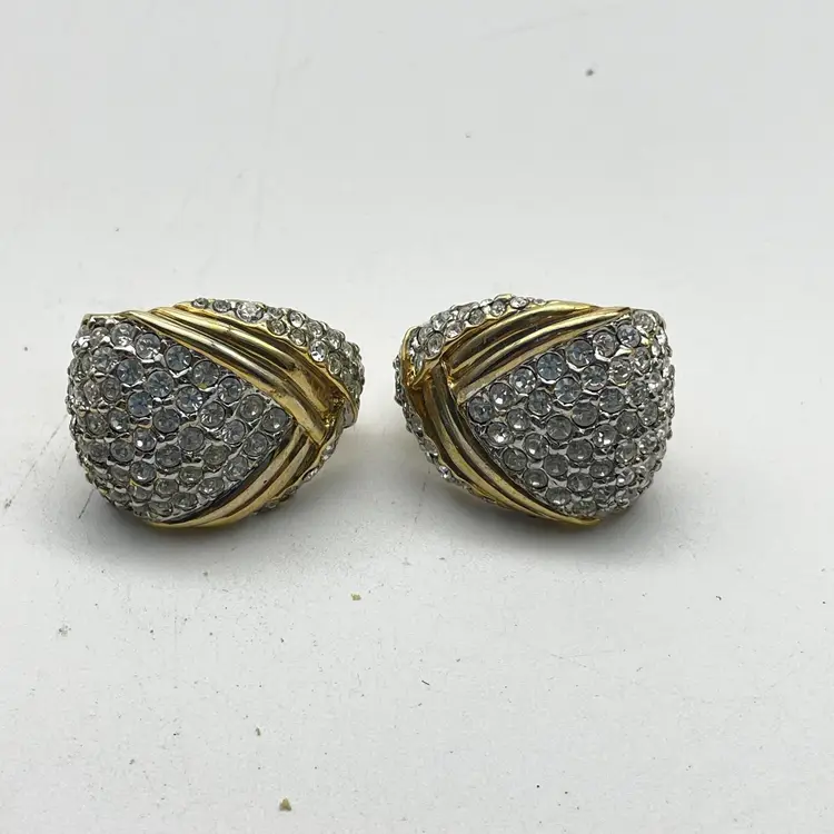 Vintage Gold Tone Crystal Clip On Earrings Pavé Rhinestone Dome 80s Statement Pair