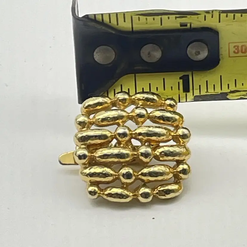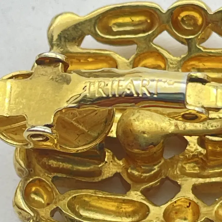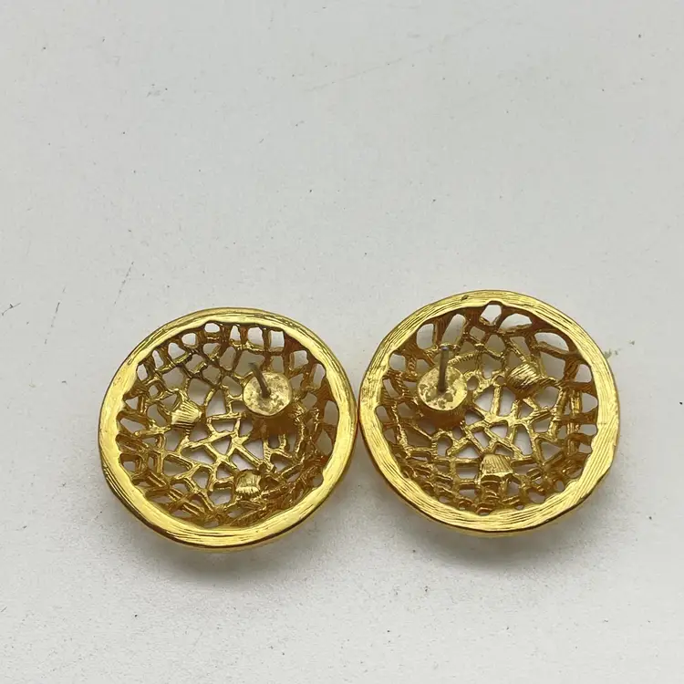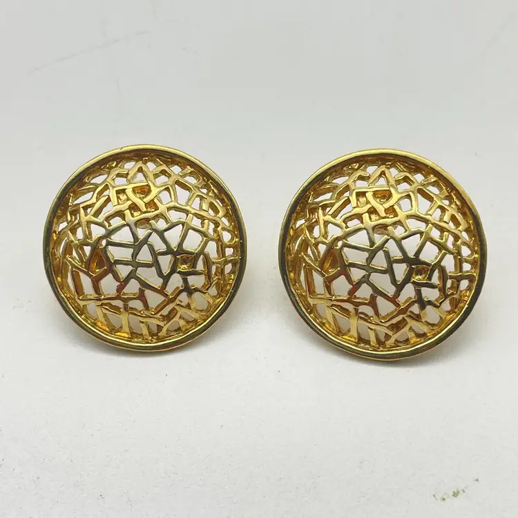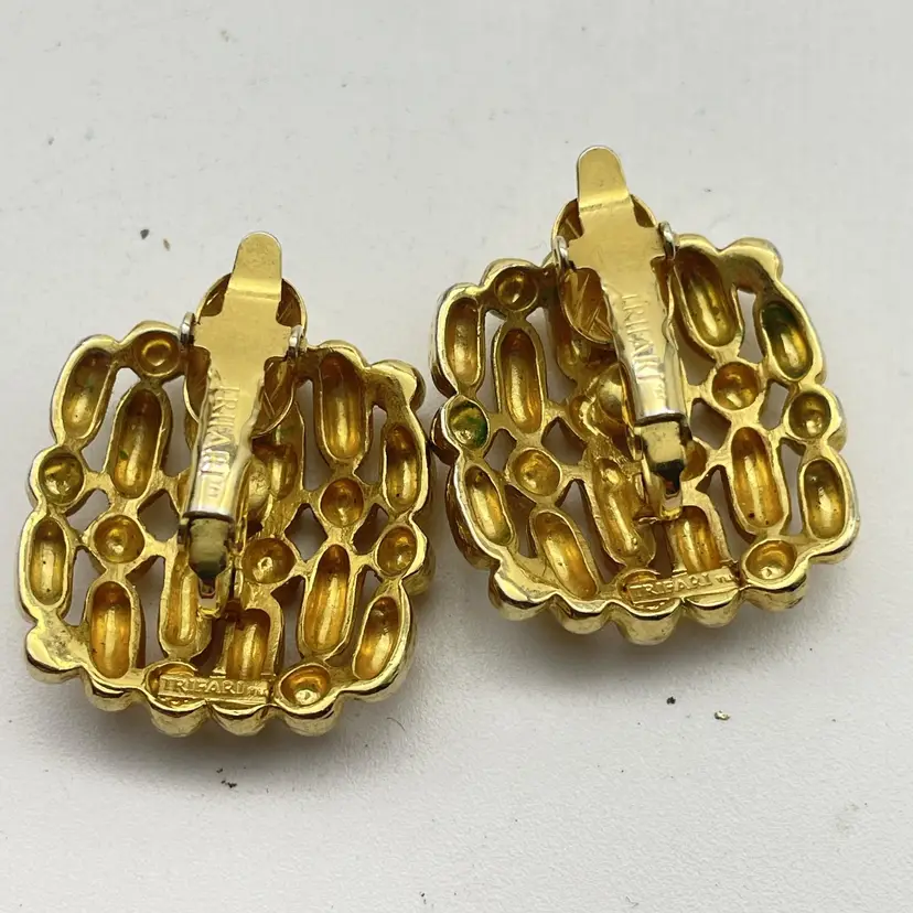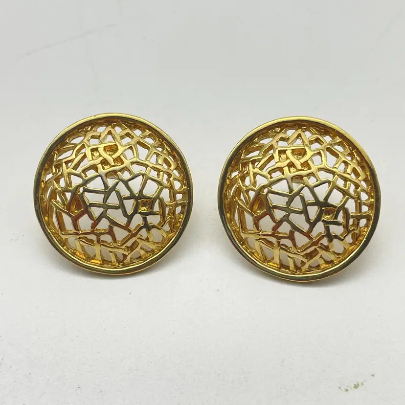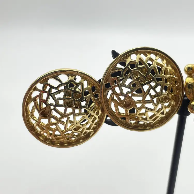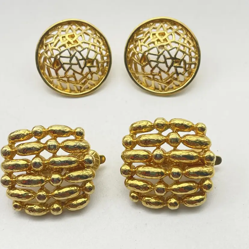 The signed Trifari pair uses clip-on backings; Trifari stamp is present on inside of the clip hardware. The round pair features pierced posts with butterfly backs and an open, filigree mesh design in gold tone. Size: Trifari clip-ons are approx. 1" square (see photo with ruler for reference), round dome earrings approximately 1" diameter. Both pairs are constructed from gold tone metal alloy with detailed texturing and openwork geometric designs. Classic vintage costume jewelry, perfect for evening or retro styles. Great set for collectors or wearers of vintage designer earrings. Era: Likely 1960s-1980s based on style and signature. Both pairs included. No original boxes or papers.