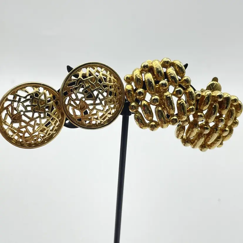 Vintage Gold Tone Earrings Lot of 2 Textured Beaded Dome Stud and TRIFARI Clips