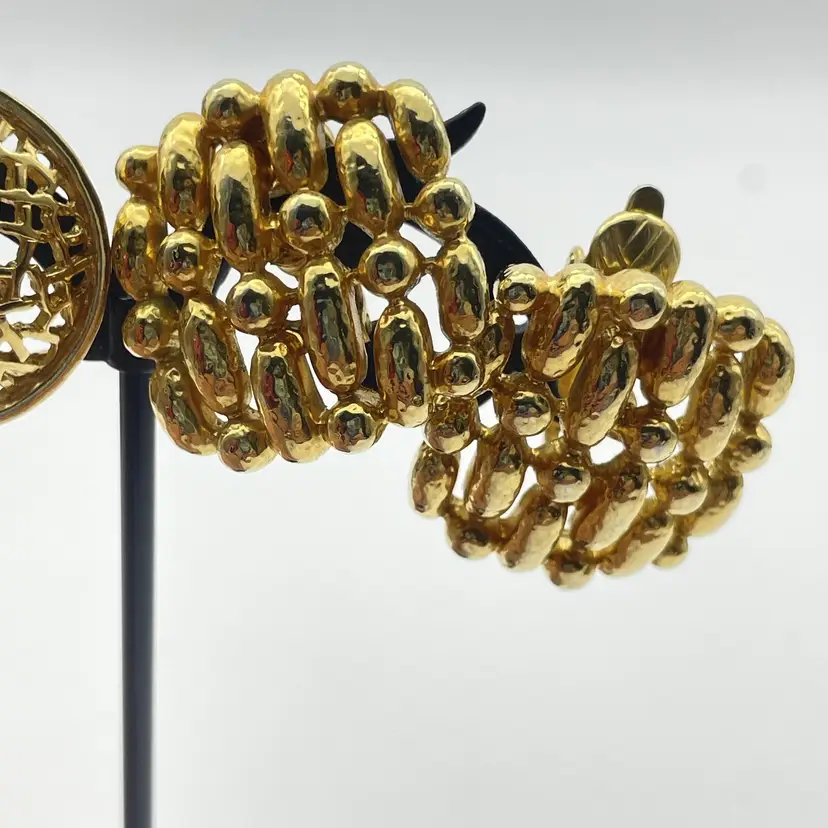 Includes two pairs of earrings: one pair signed Trifari (clip-on, square shape with hammered beaded design), and one unsigned pair (round dome-shaped, pierced posts with open, abstract lattice design).