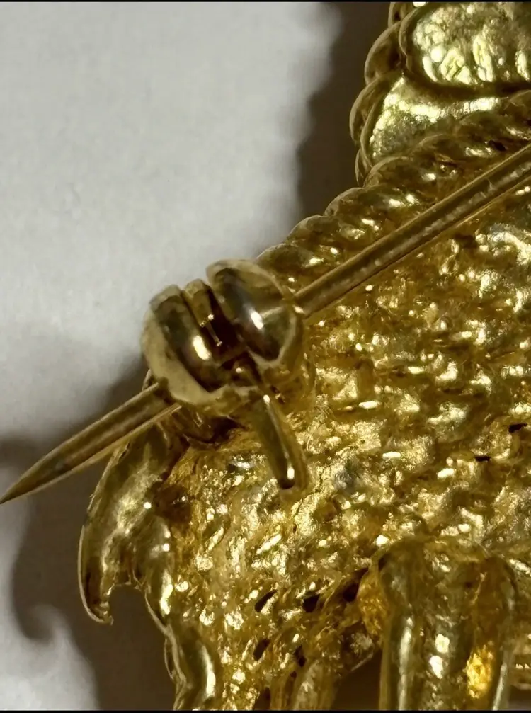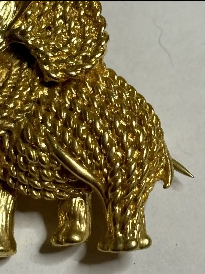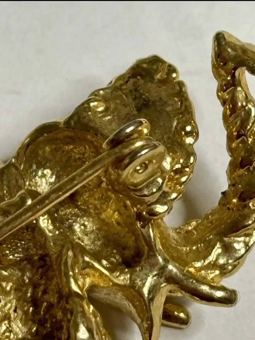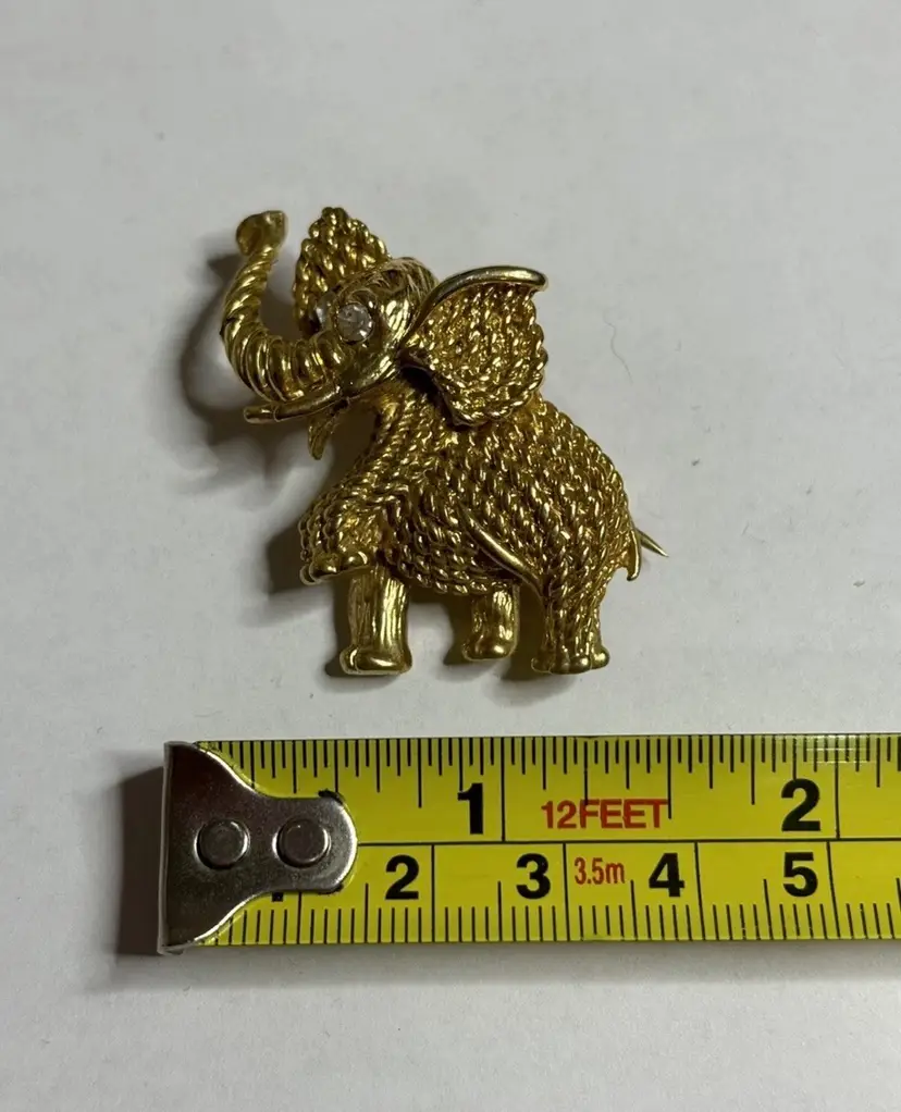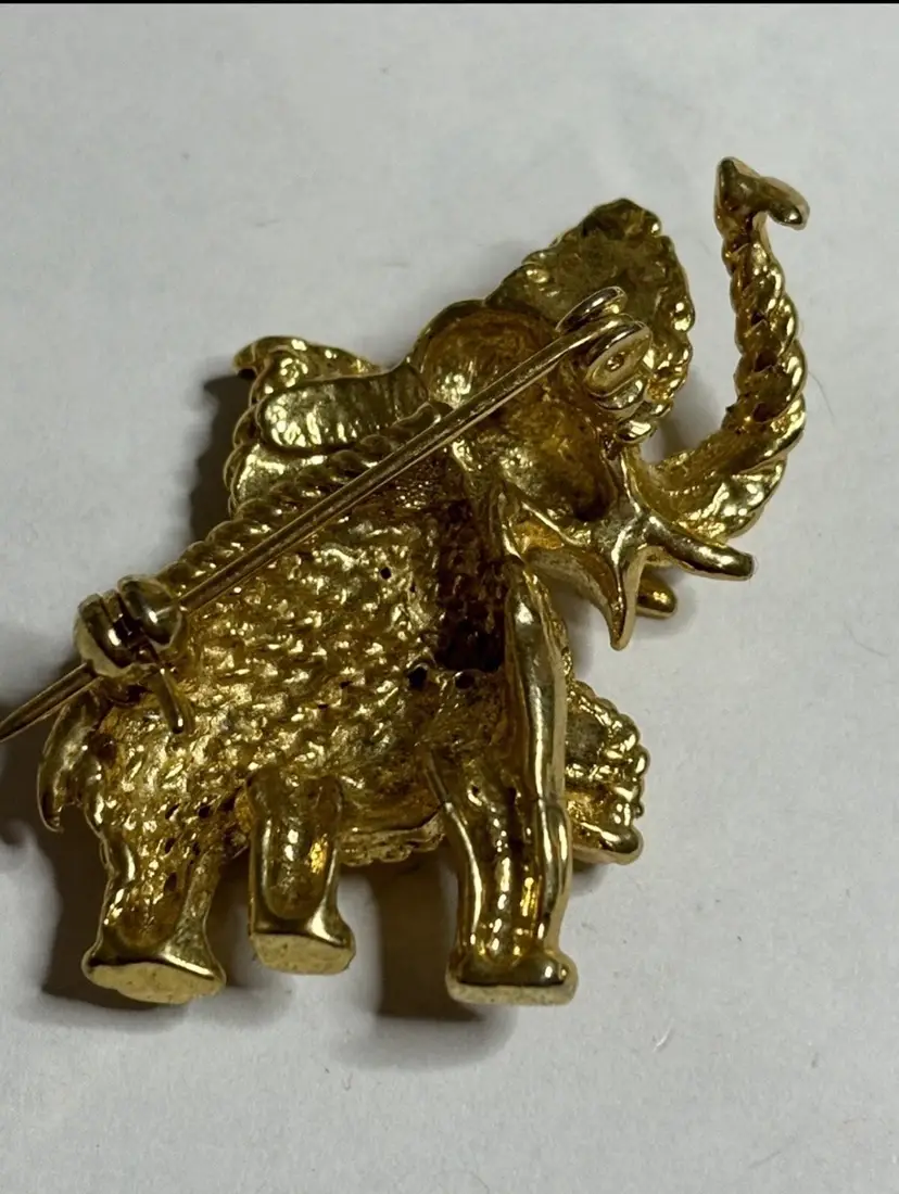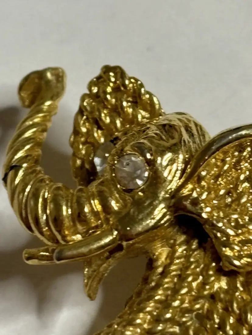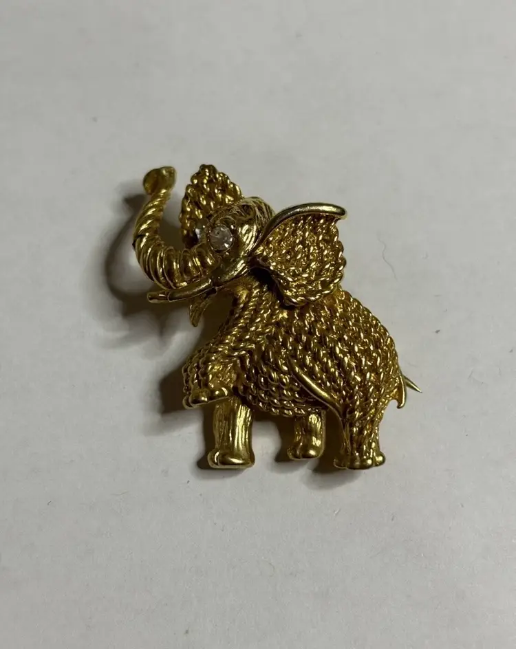 Add a touch of glam to your outfit with this stunning elephant brooch. The brooch features clear rhinestone eyes that sparkle in the light. Crafted in a gold tone, this brooch is perfect for any animal lover or collector. The intricate details on the elephant's body make it a unique addition to any jewelry collection. Ideal for adding a touch of elegance to any outfit, this brooch is perfect for both casual and formal occasions.