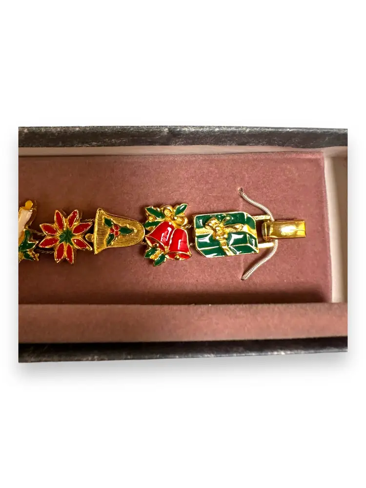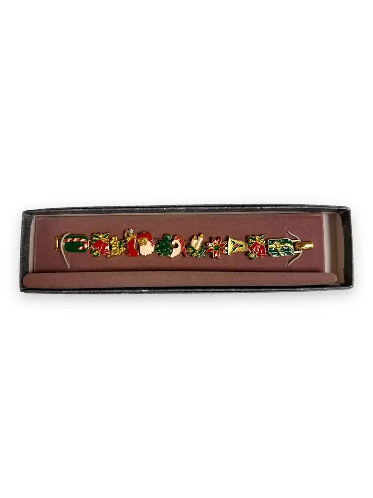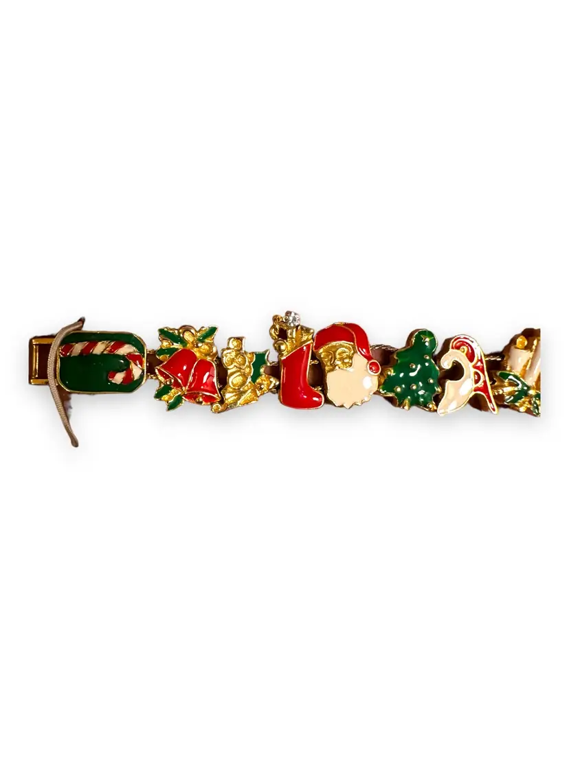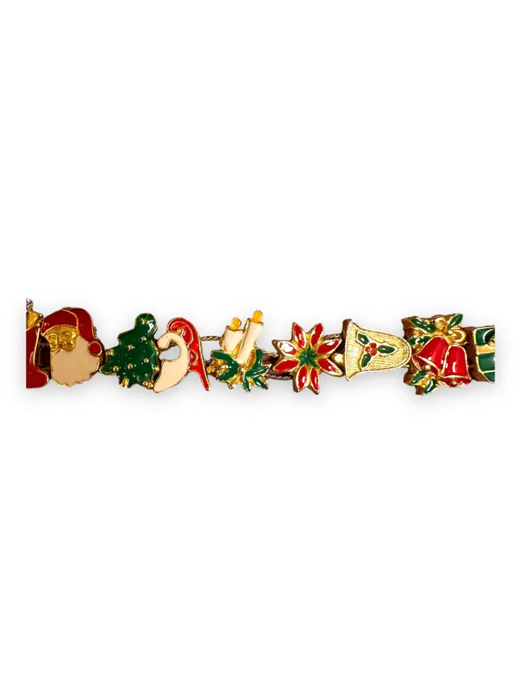 Enhance your Christmas spirit with this vintage slide charm bracelet. The bracelet features a fold-over closure and a beautiful gold tone. The enamel and metal material ensure durability and charm. The bracelet measures 7 inches in length and is adorned with a variety of Christmas-themed charms, including Santa, Candy Cane, Poinsettia, Present, Bell, and Sleigh. The vintage bracelet has a Victorian style, perfect for women's fashion. Buy this Christmas-themed slide charm bracelet and add a personal touch to your fashion collection.
