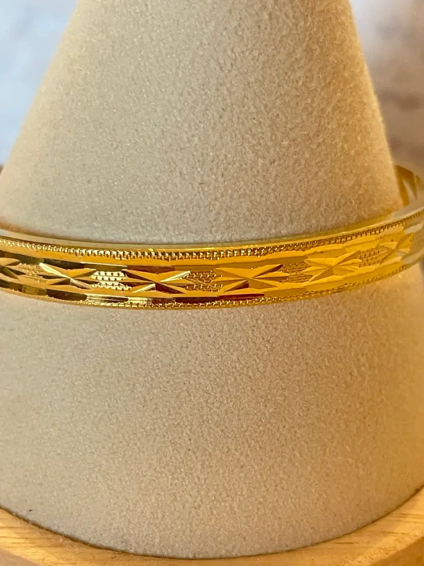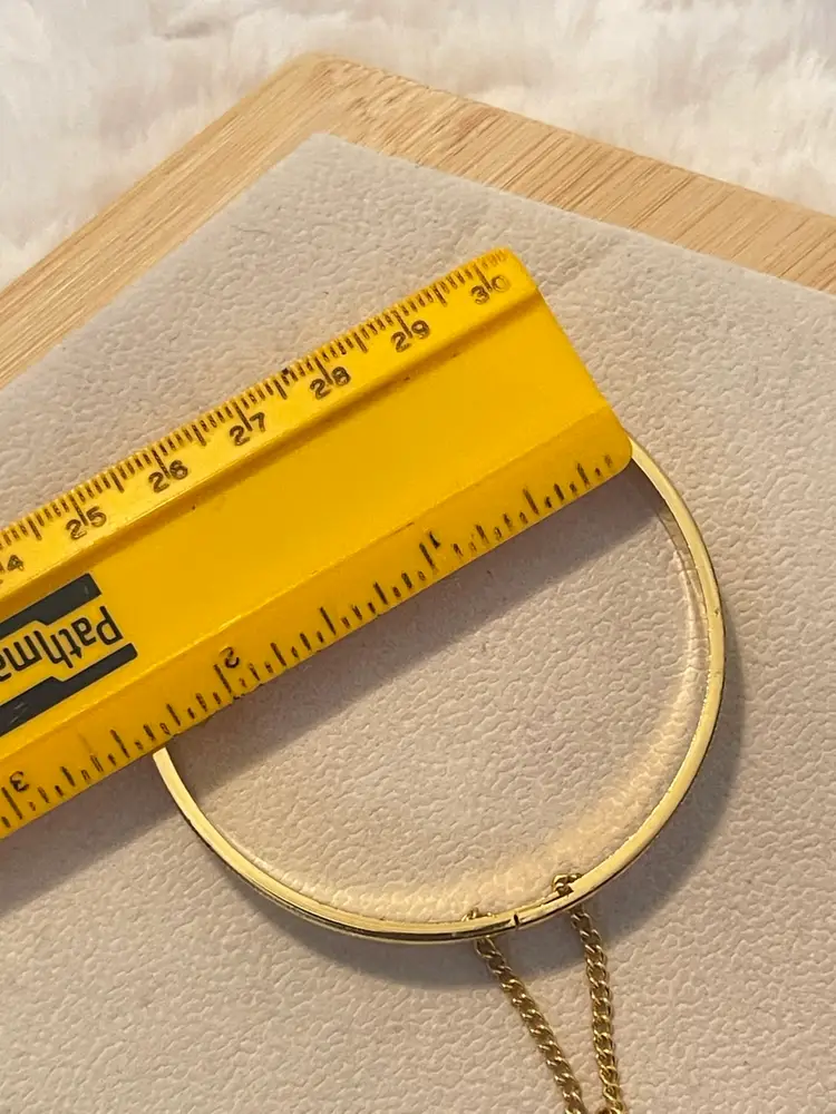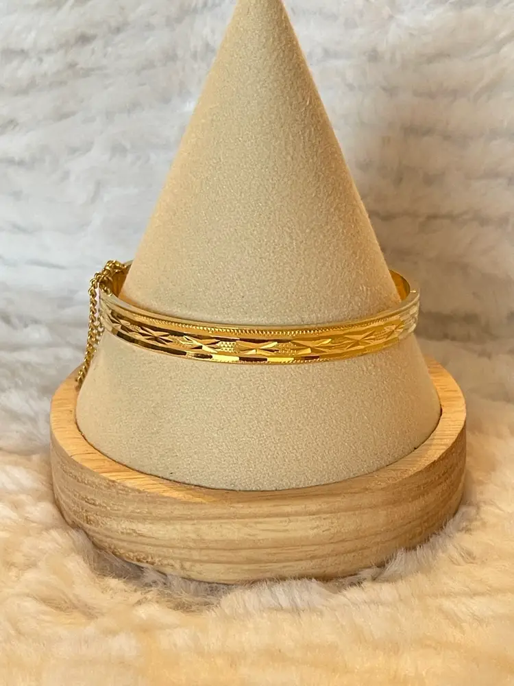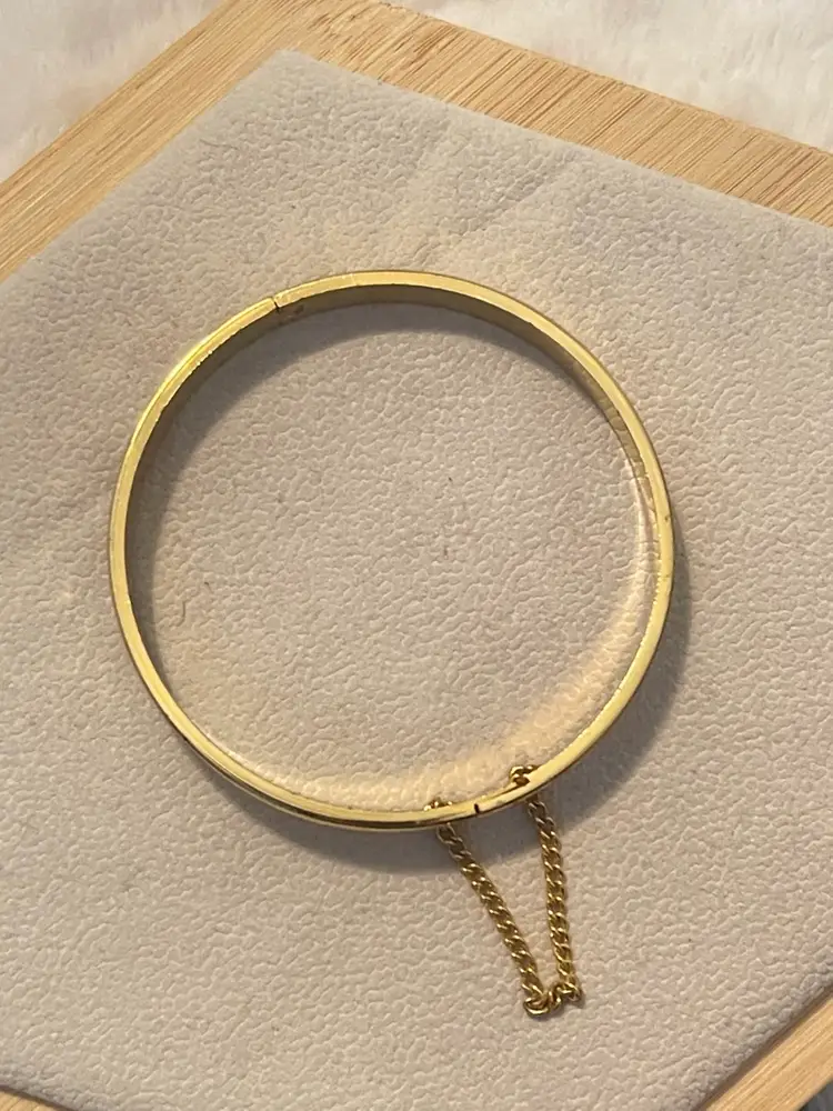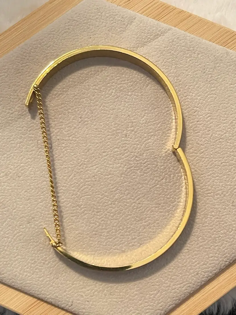 Vintage gold tone hinged bangle bracelet featuring delicate etched detailing and a classic safety chain closure for added security.