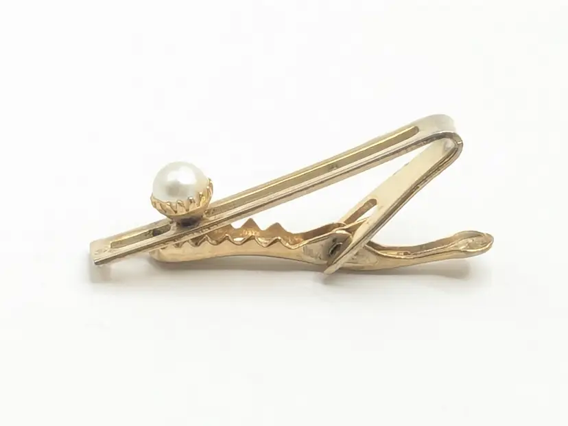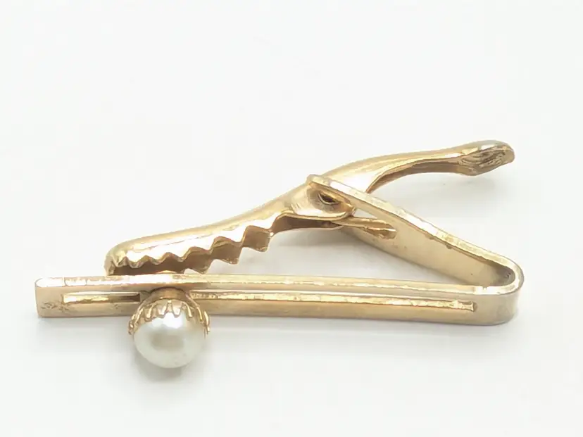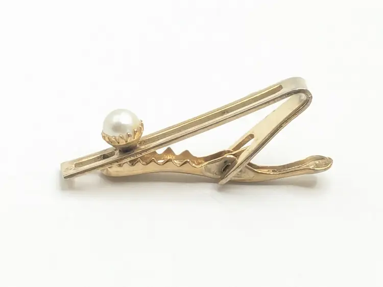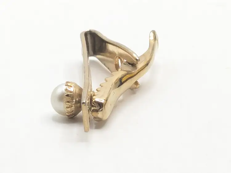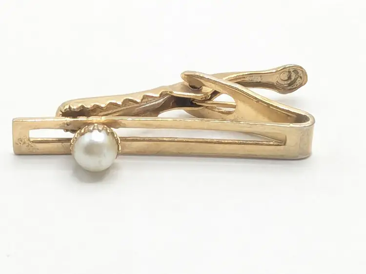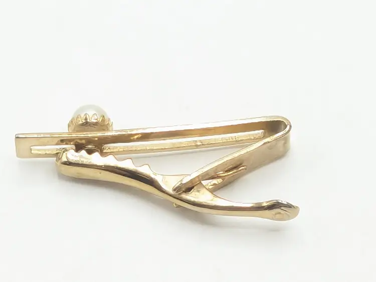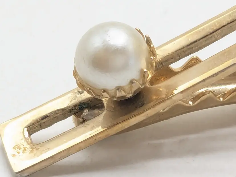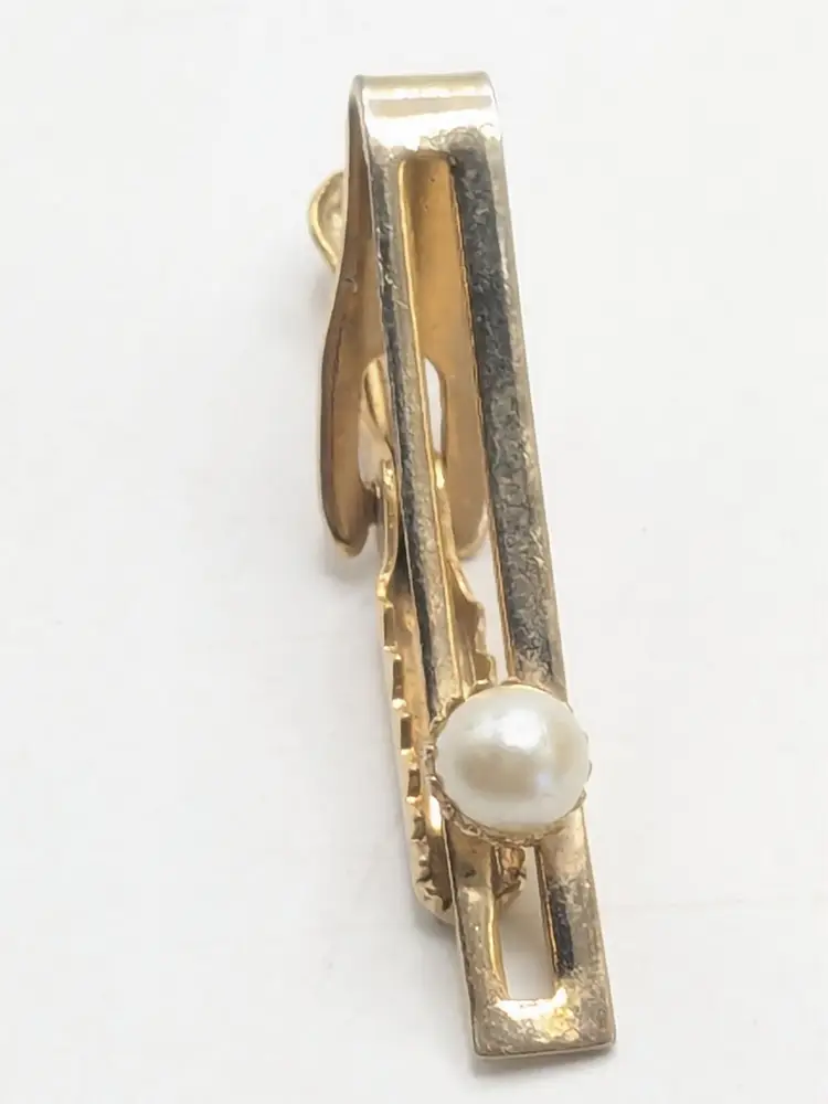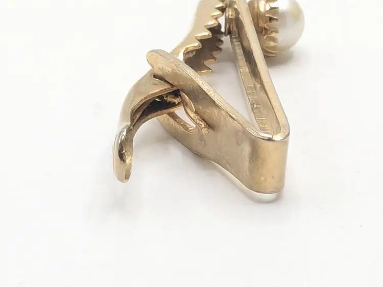 Good condition with no color loss to the gold tone. Faux pearl prong set. Unmarked. Measures 1 1/2" in length. EN2
