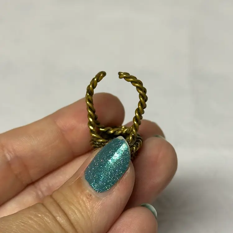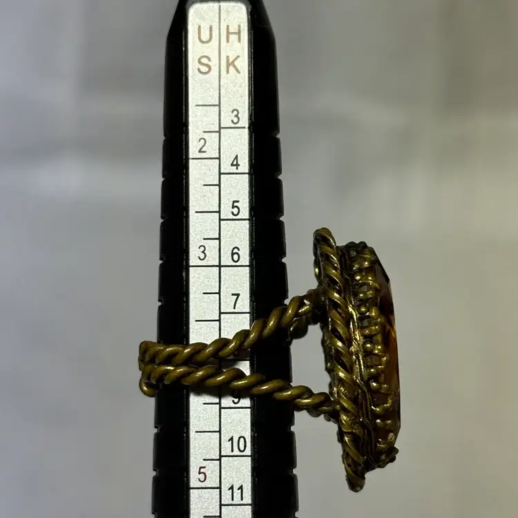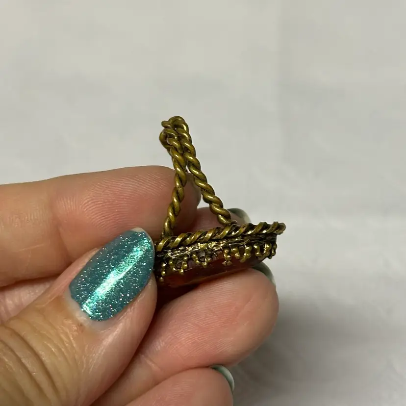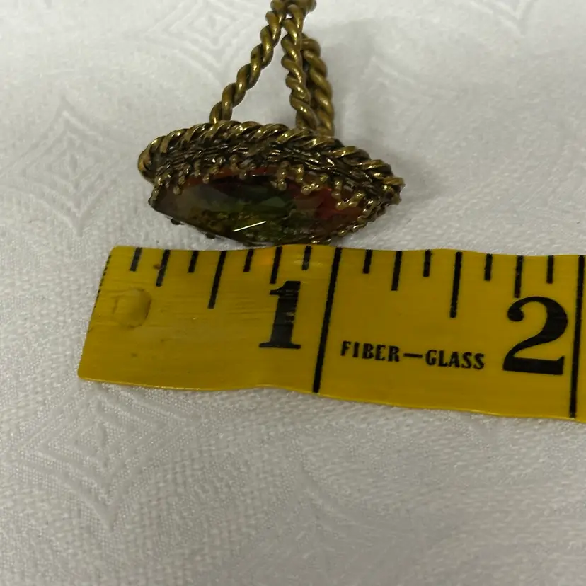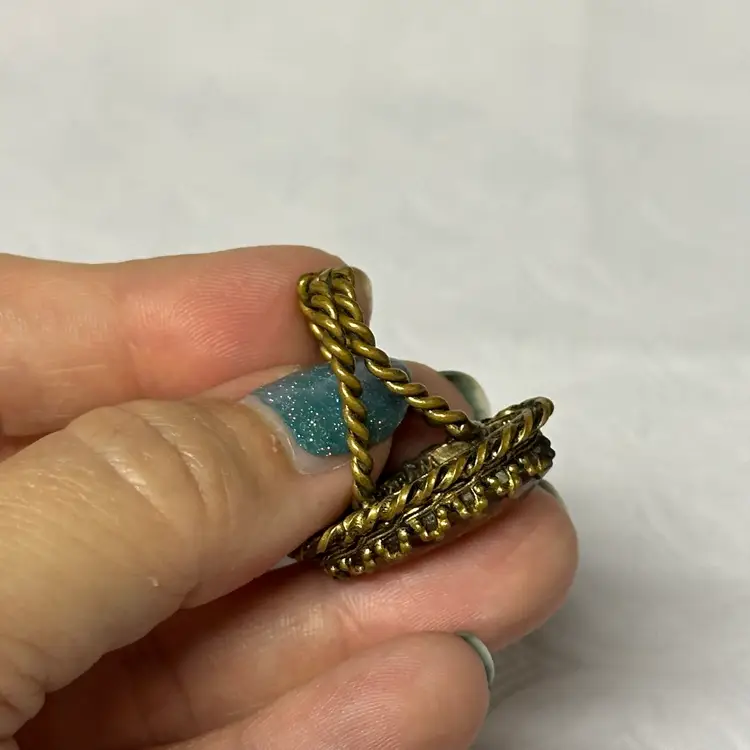 This is pretty. It does have some wear and the braided metal ring is not a perfect circle. Overall still nice. Please see photo for exact sizing.