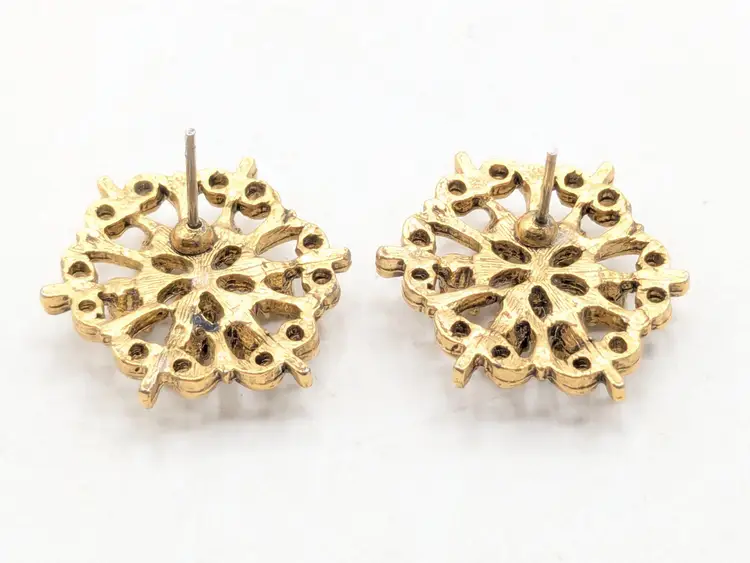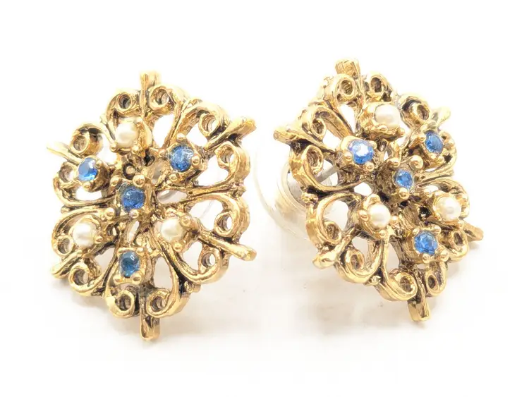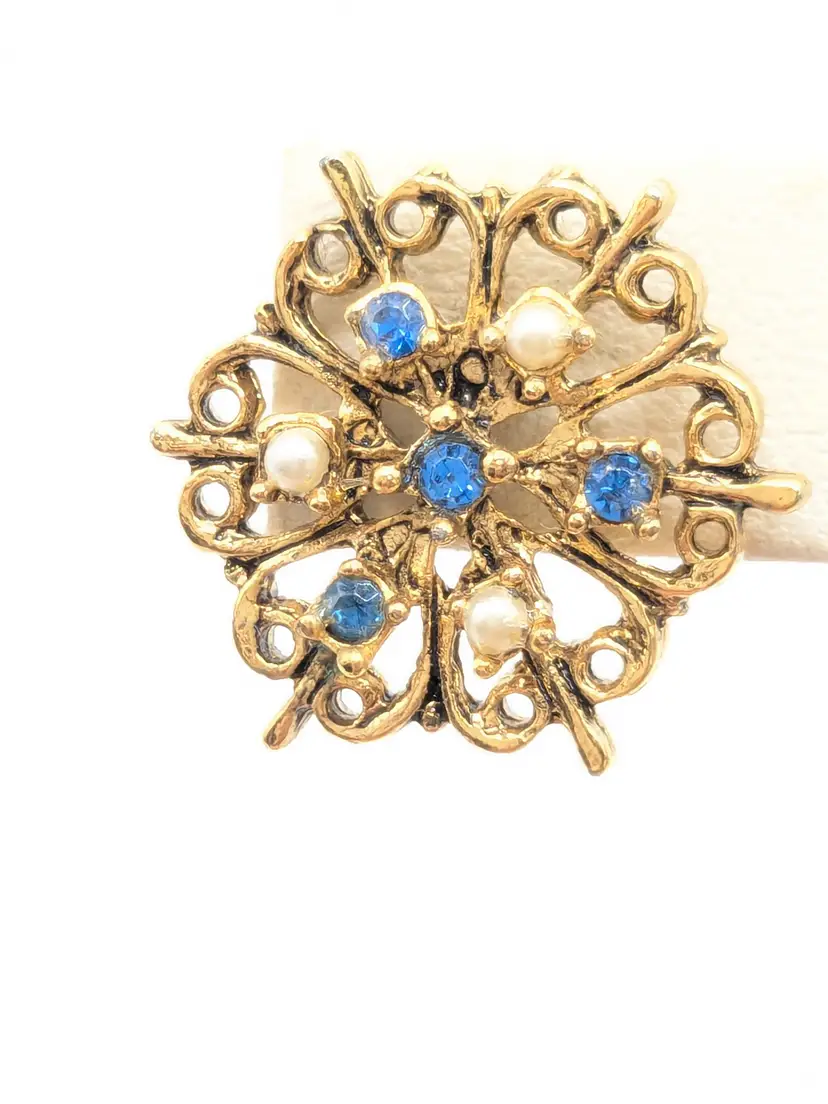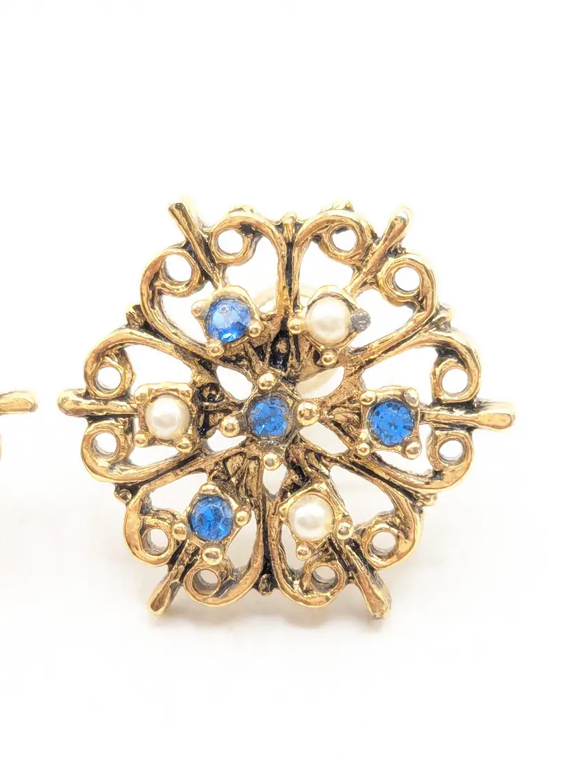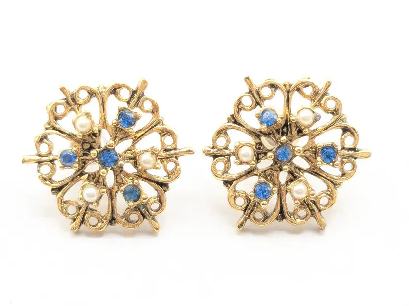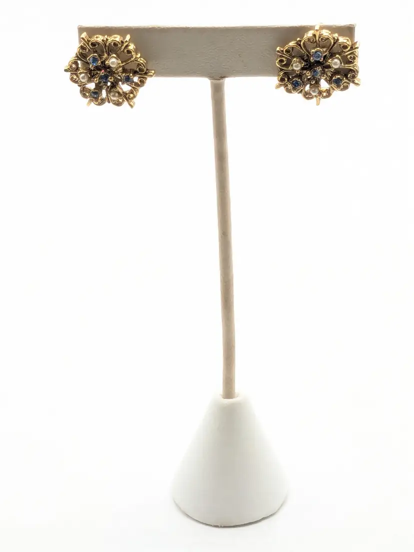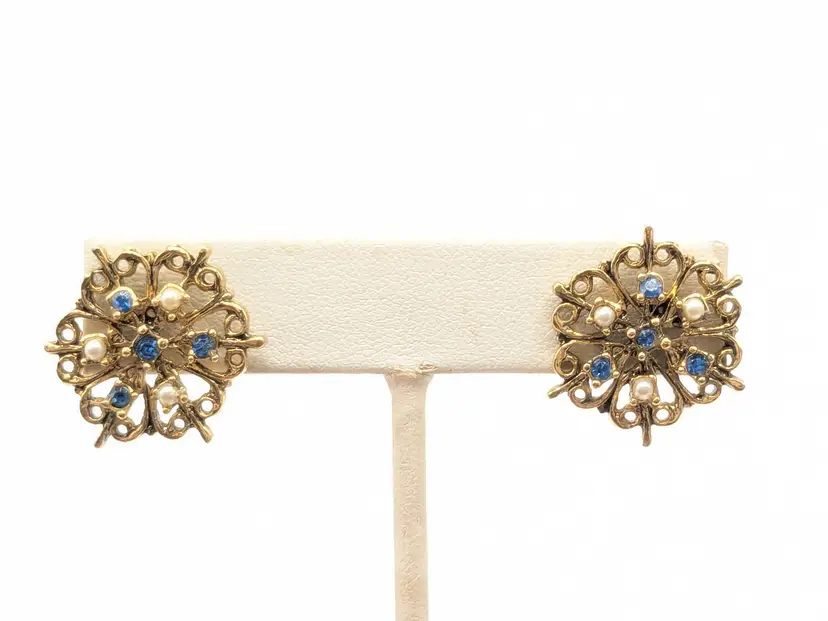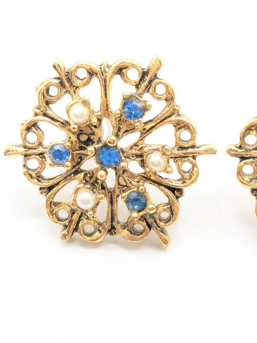 Good condition. Features intricate filigree design with sparkling blue rhinestones and faux pearls. Pierced earrings. Measures 1". wen