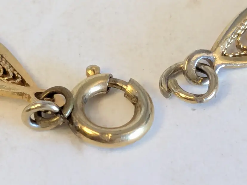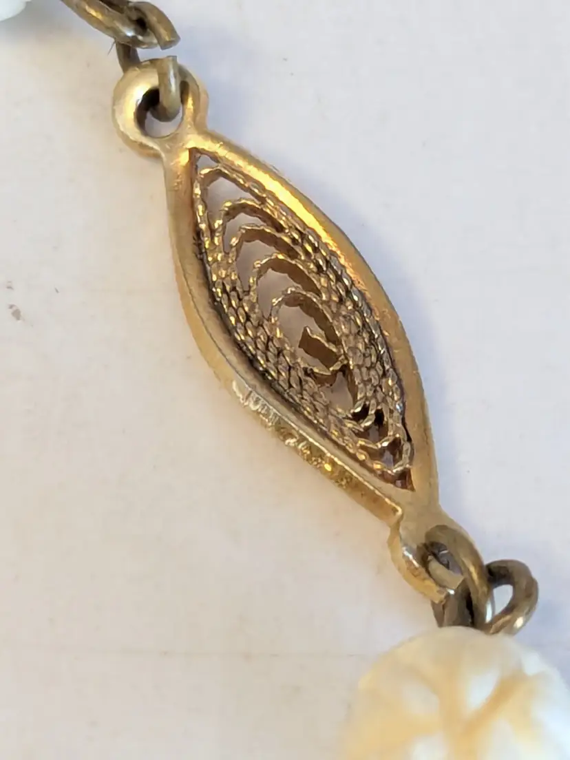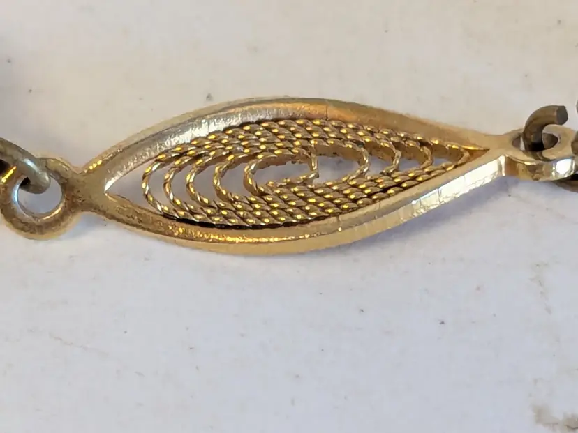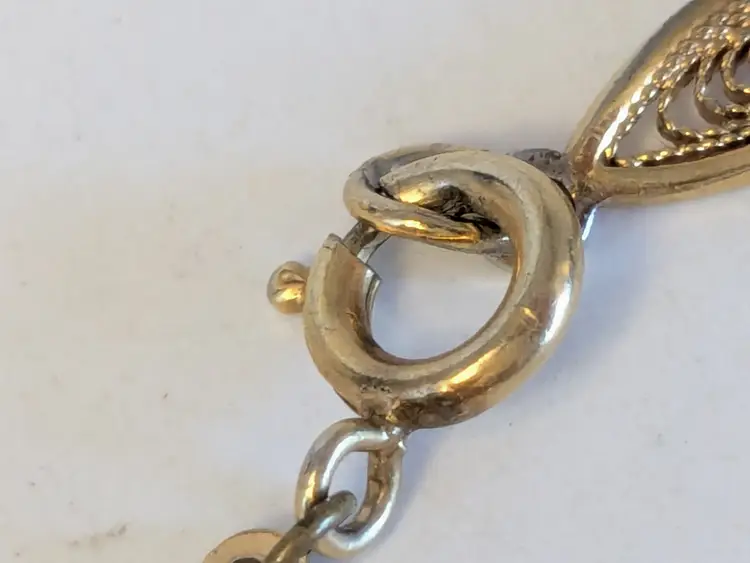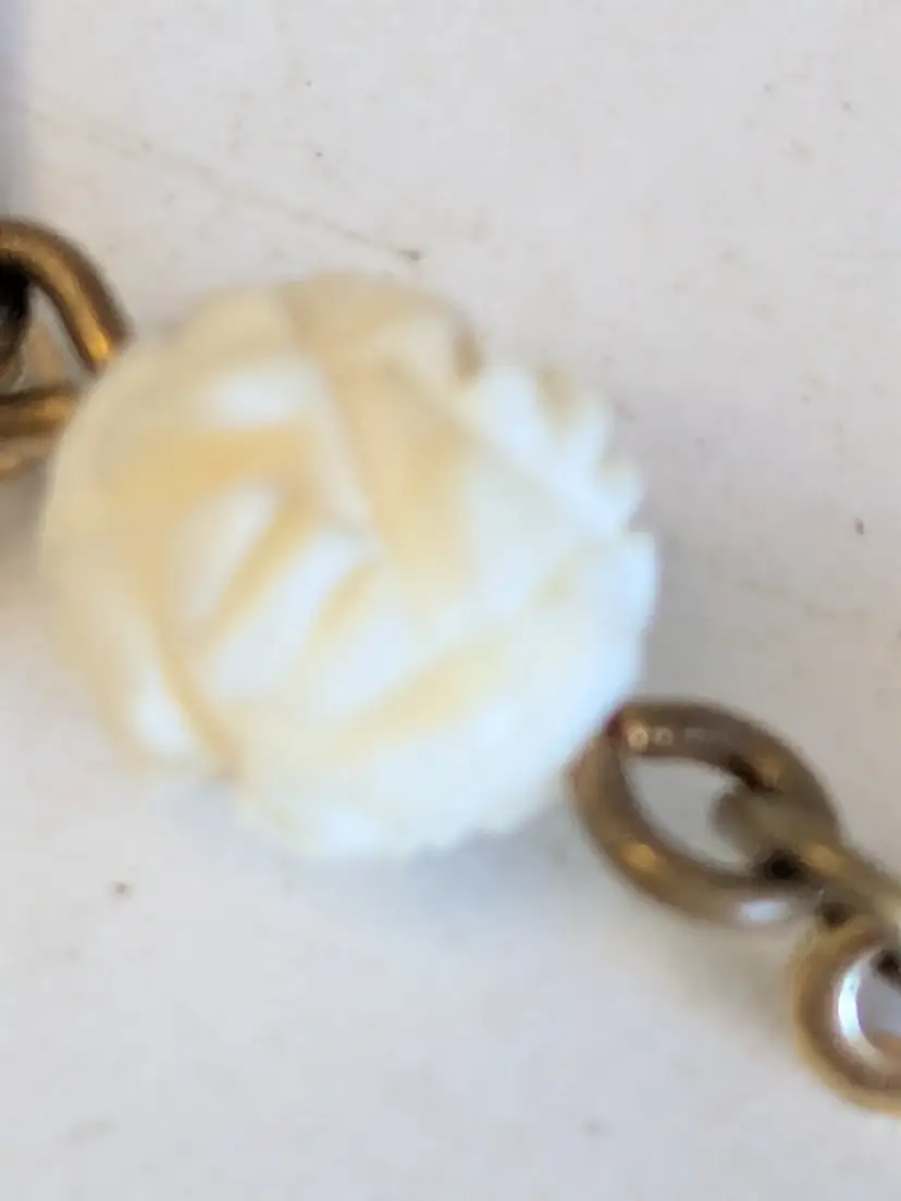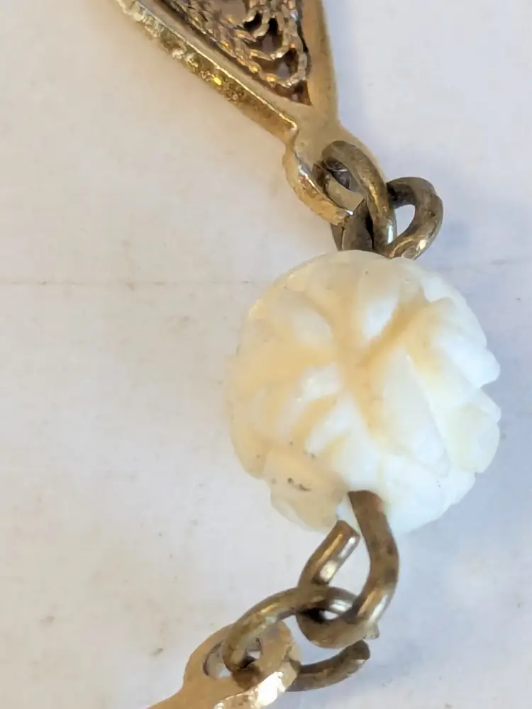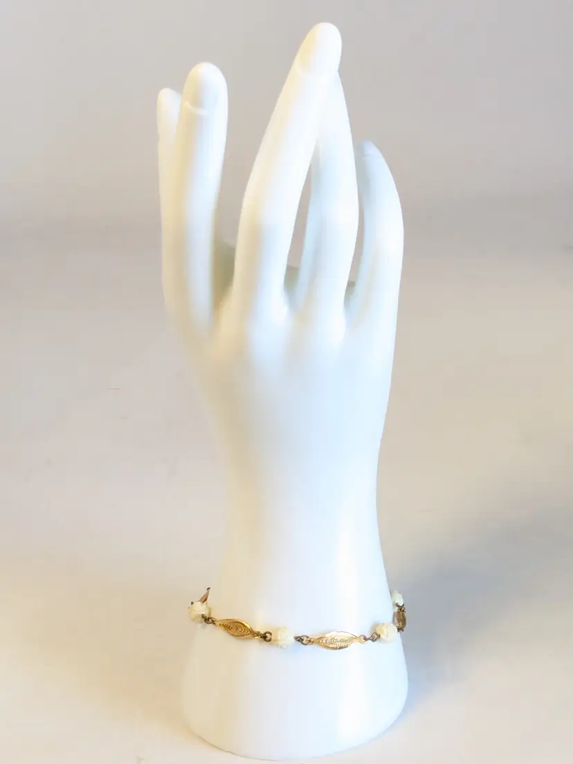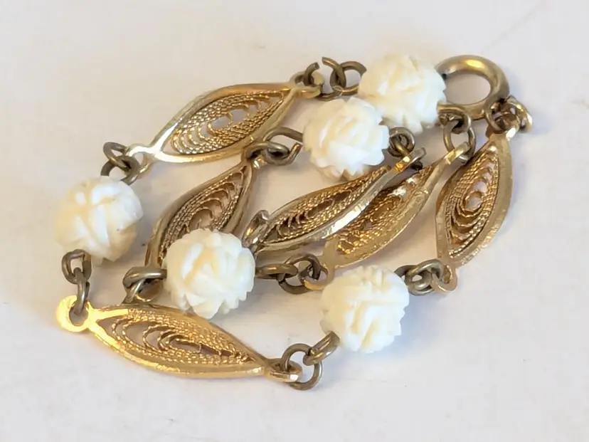 Classic and dainty bracelet. Good condition. Gold tone is good with a bit of darkening on links. Features carved resin roses in an ivory color and gold tone filigree. Spring ring clasp. Measures 7 1/4". wen