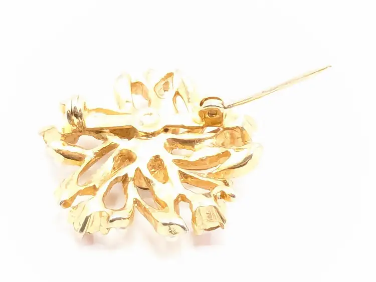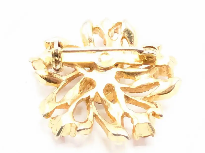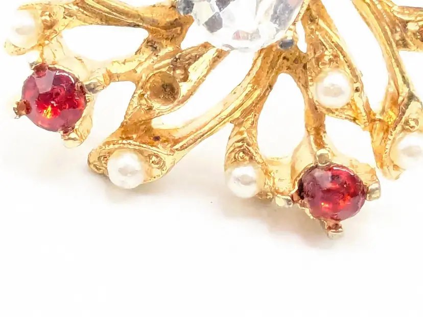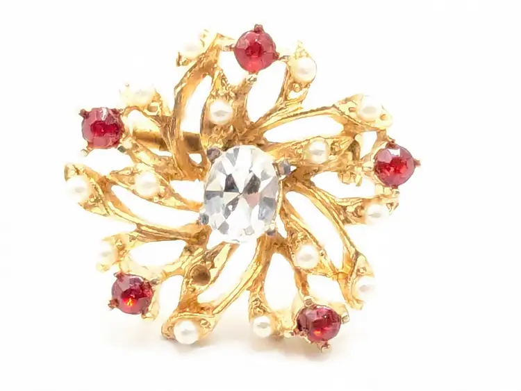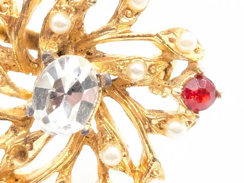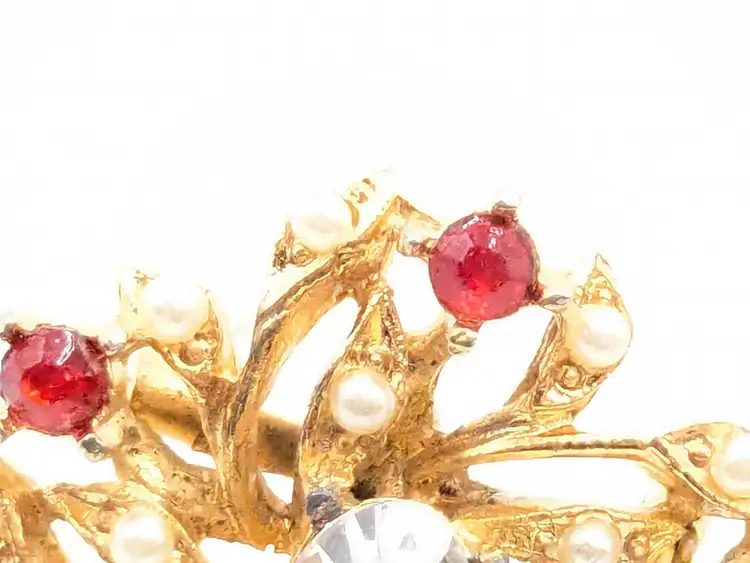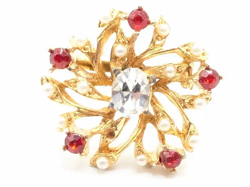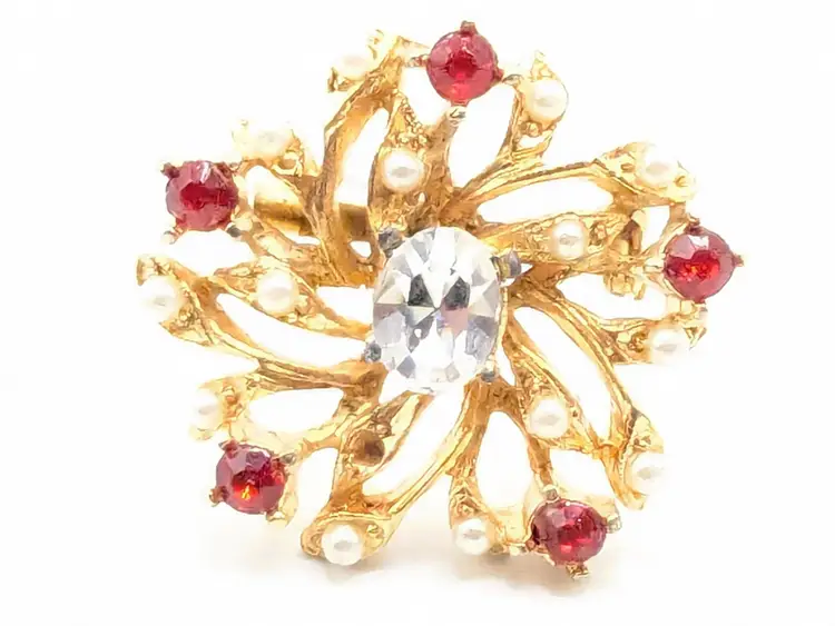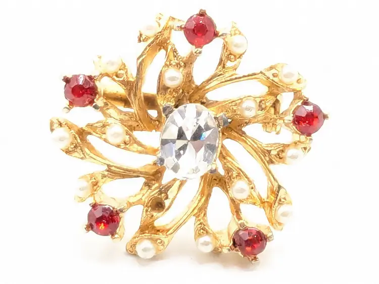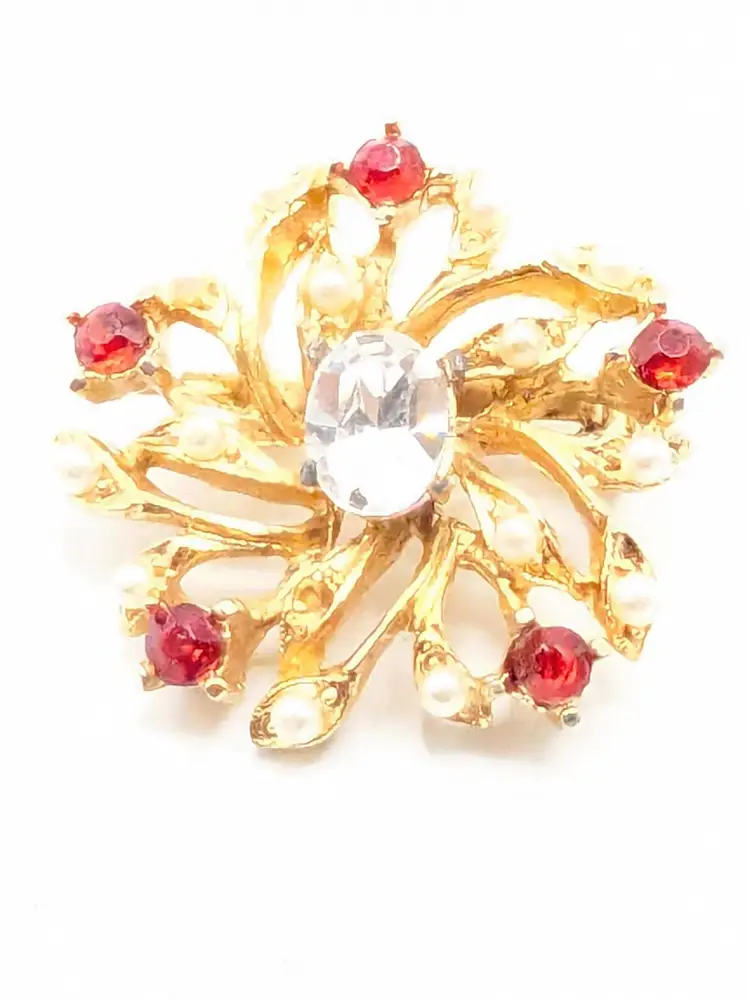 Good condition. Features a gold tone floral design with red and clear rhinestones. Measures 1 inches in diameter. (EN1)