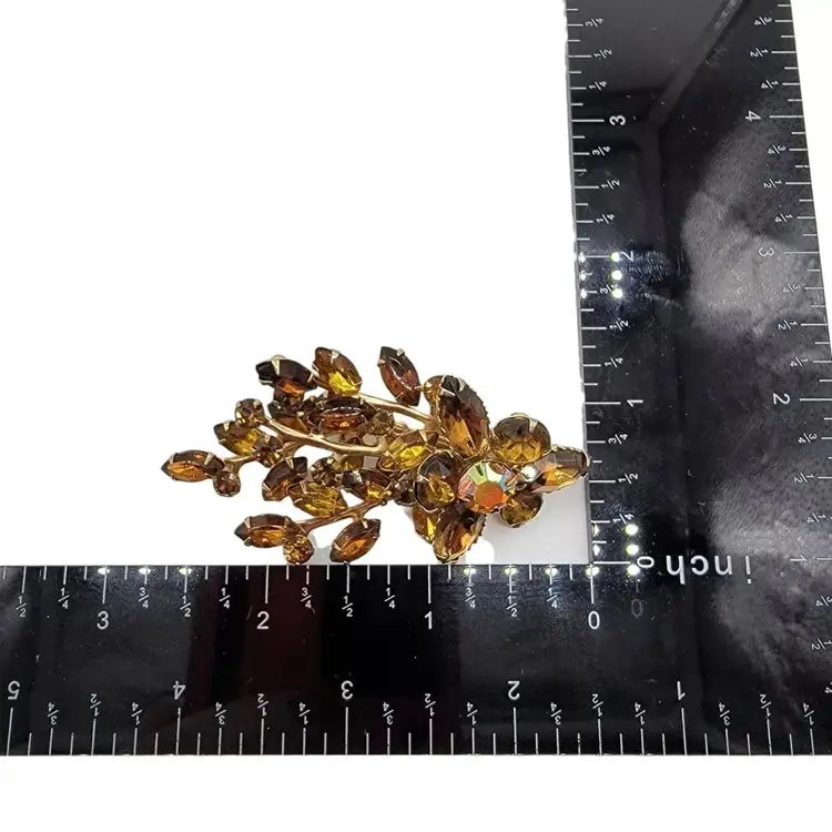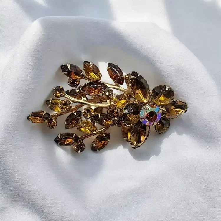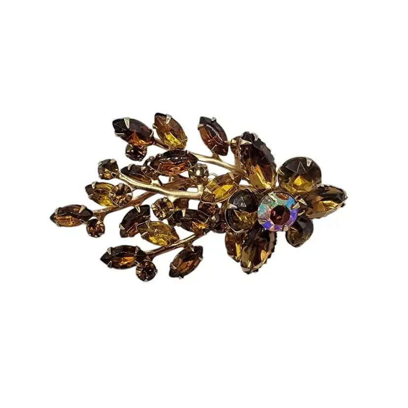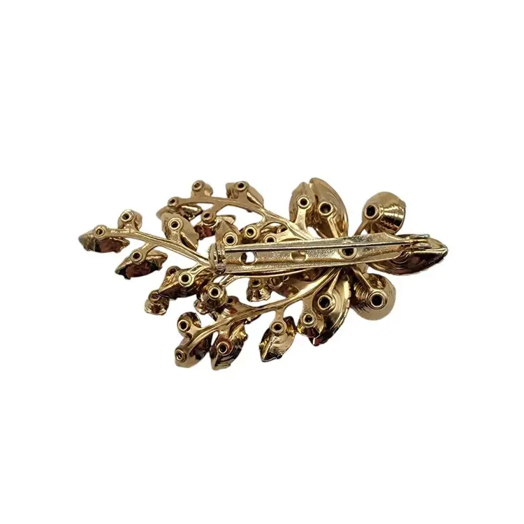 This vintage brooch features a gold-tone floral design with sparkling rhinestones. Ideal for adding a touch of elegance to any outfit.