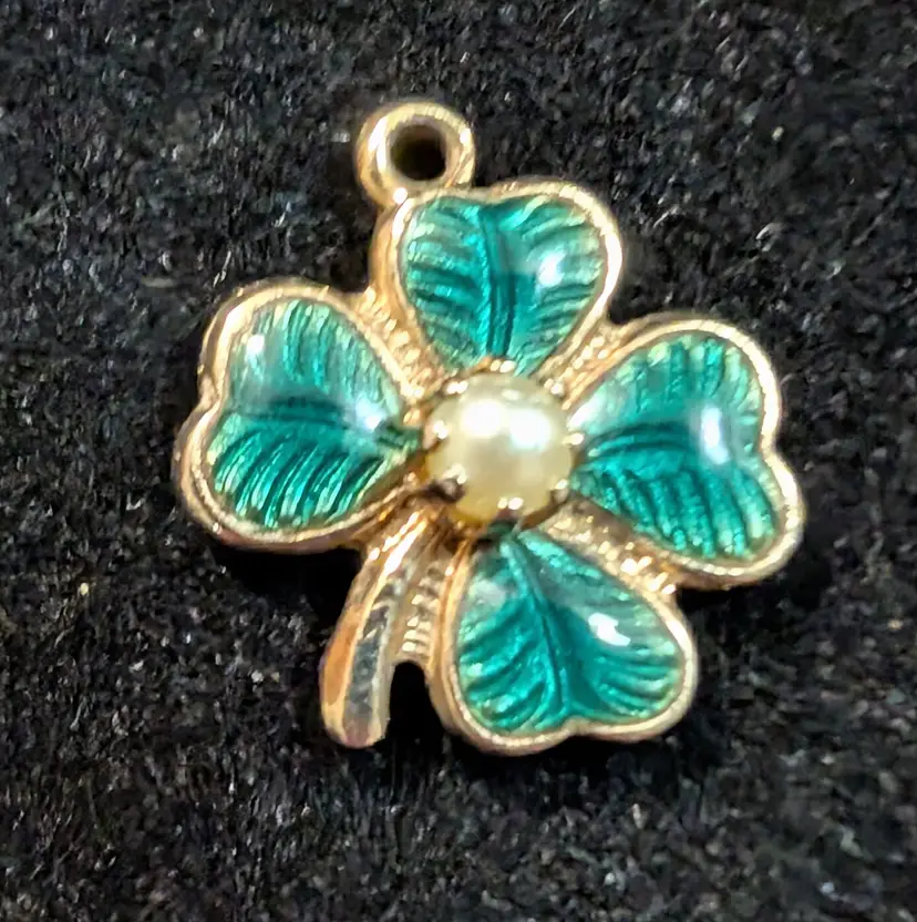 Vintage gold tone four-leaf clover with green enamel leaves and pearl Center Stone charm. Charm is in excellent condition with no scratches or scuffs and has a bright shine to it. Beautiful green enamel leaves with a pearl looking stone in the center. Piece is approximately less than 1 in diameter. Very nice looking charm.