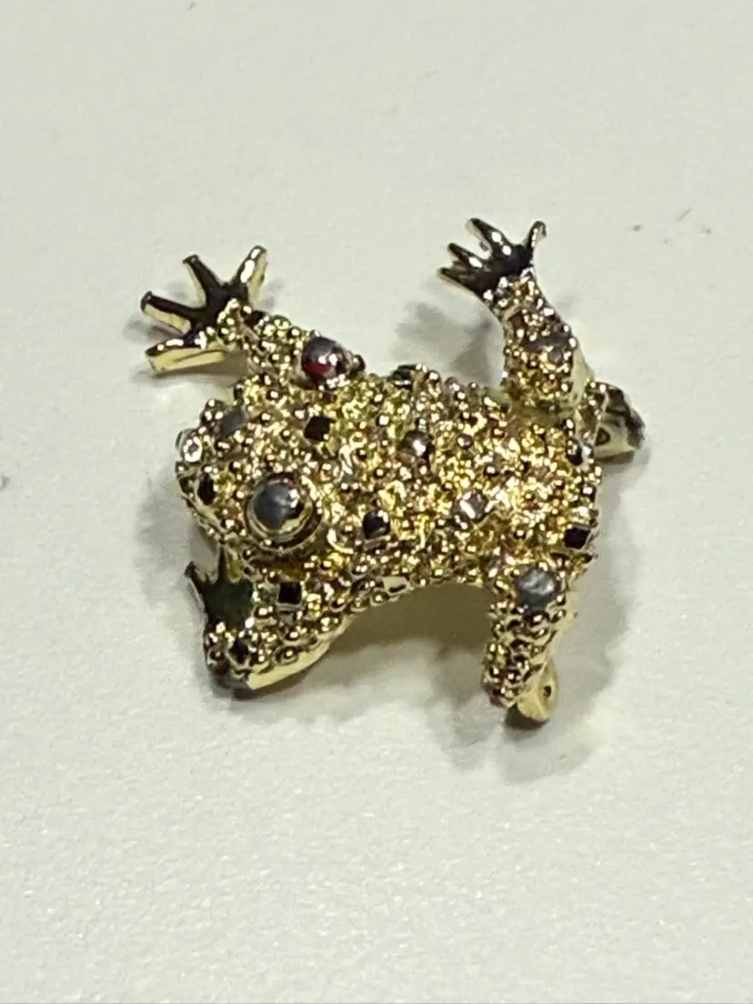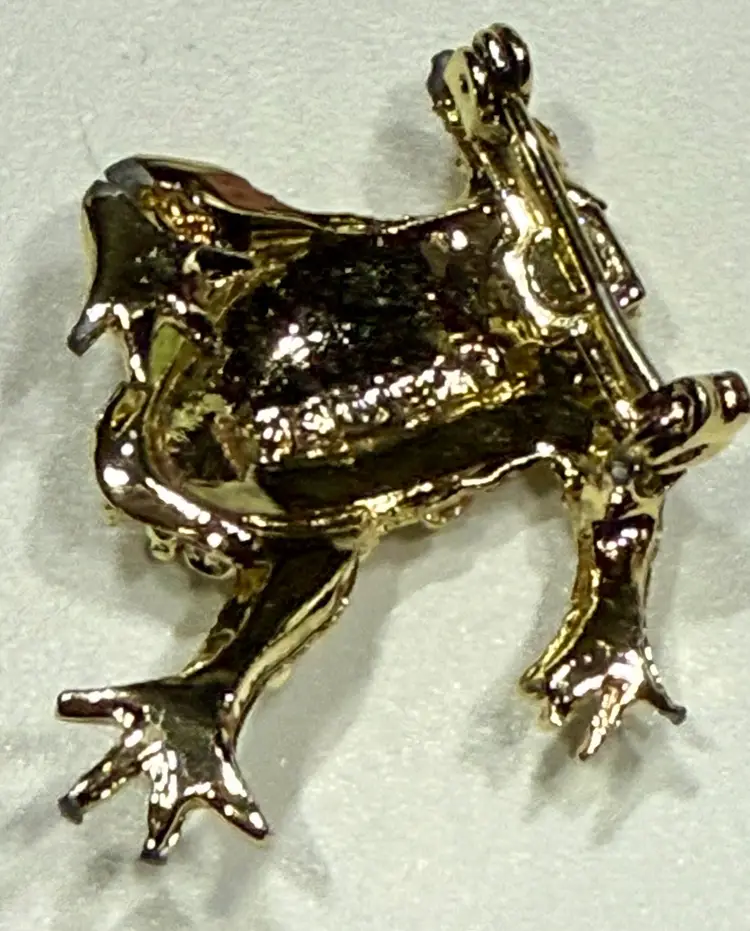 This brooch is versatile and can be worn on a jacket, scarf, handbag, or hat, making it a wonderful accessory for everyday wear or special occasions. • Style: Frog brooch / Animal pin / Amphibian jewelry • Material: Gold-tone metal with crystal-style detailing • Design: Textured surface with jewel-like accents • Condition: Excellent vintage condition with secure clasp