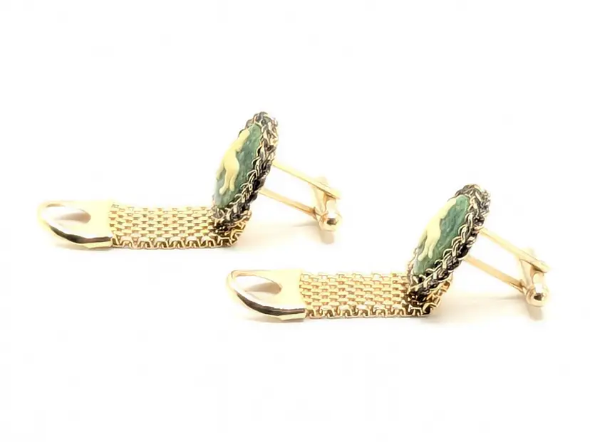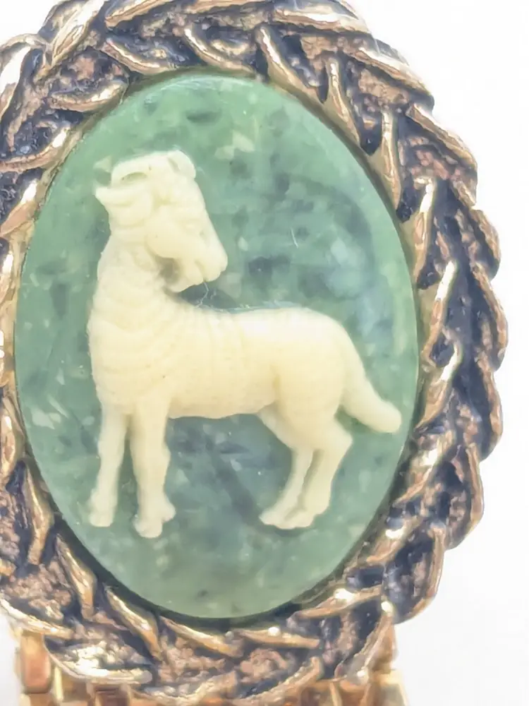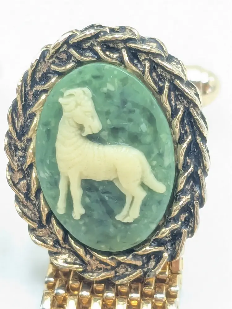GOAT: Give this to your greatest of all time! Good condition. Gold tone is bright and shiny with no color loss. Cameo background is green and goat is white. Unmarked. Mesh measures 1 1/2" length and 1/2" wide. Cameo is 7/8" length and 3/4" wide. EN2