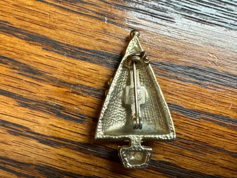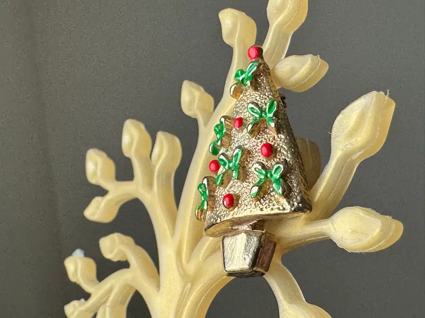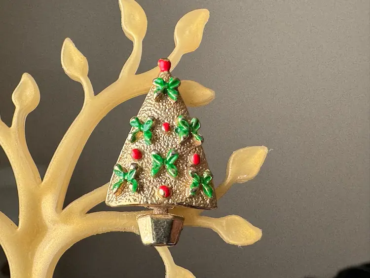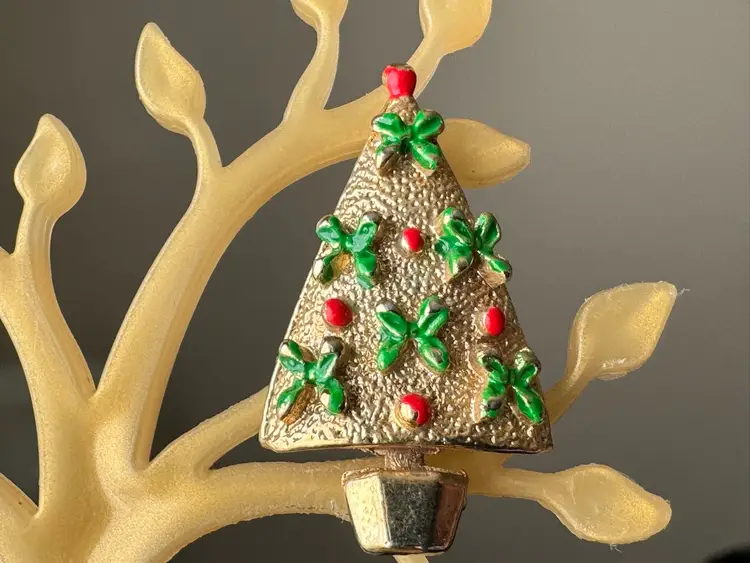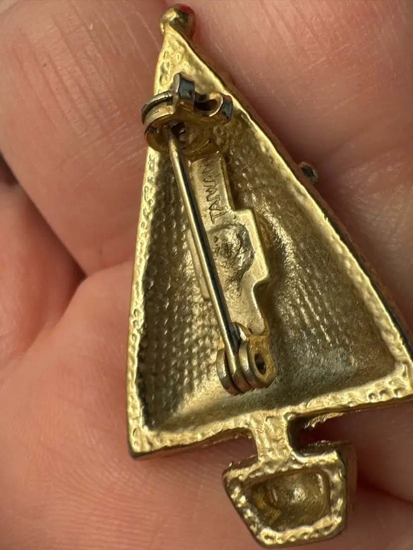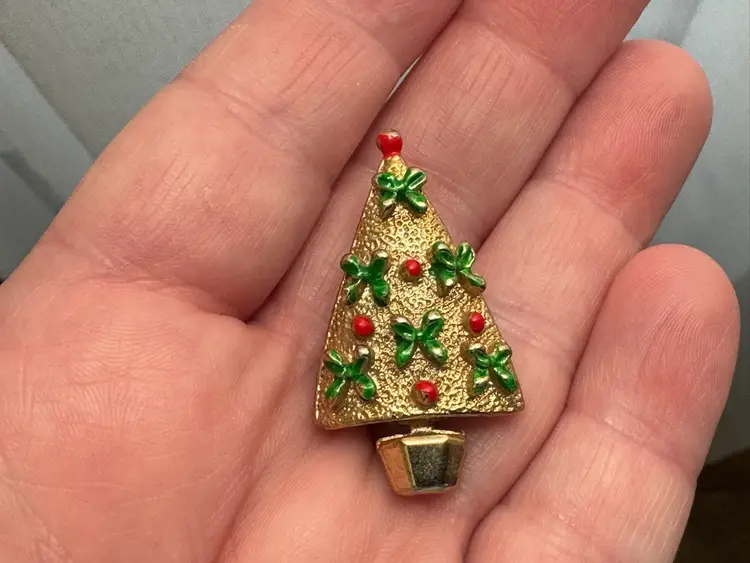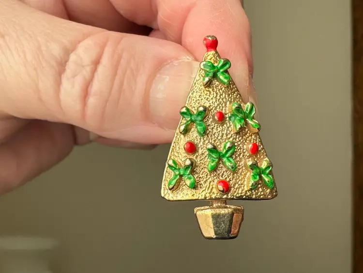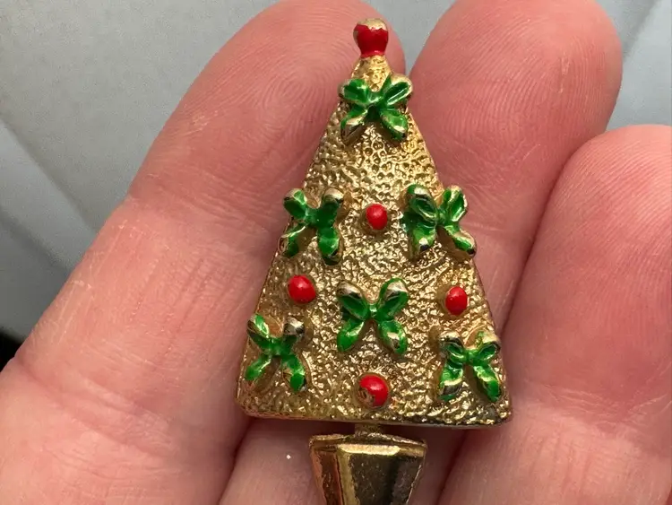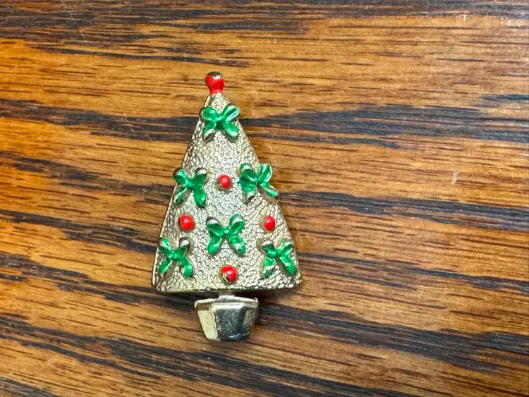 Vintage gold tone metal & green and red enamel Christmas tree brooch pen costume jewelry