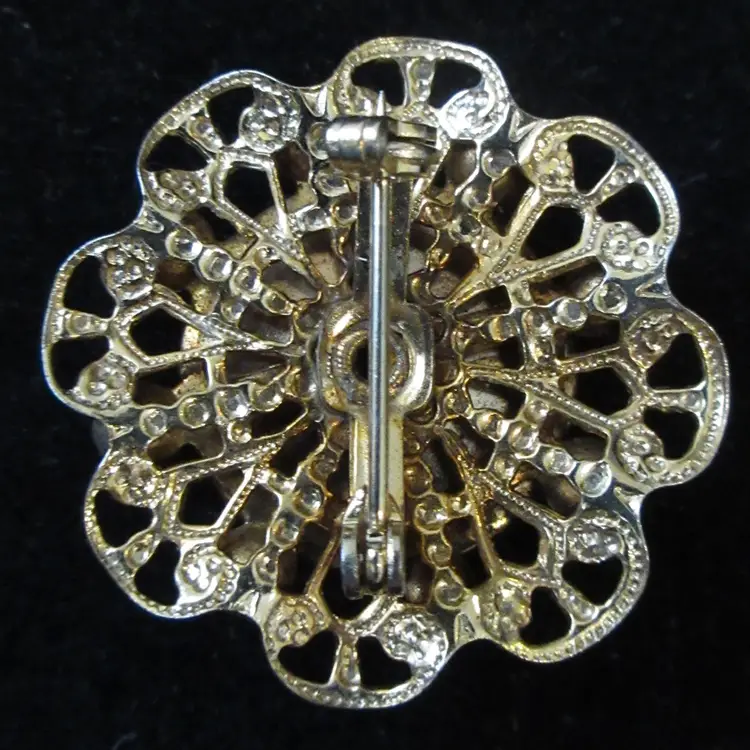 This is a BEAUTIFUL vintage black and white cameo brooch. The brooch is made of a gold tone filigree with 8 clear glass rhinestones around a central cameo. The cameo is made of black and white lucite. This brooch is 1.25 inches in diameter and has a pin back with a sliding C closure.