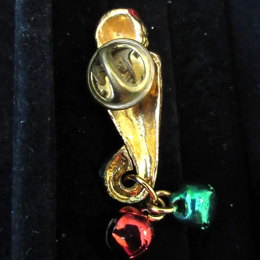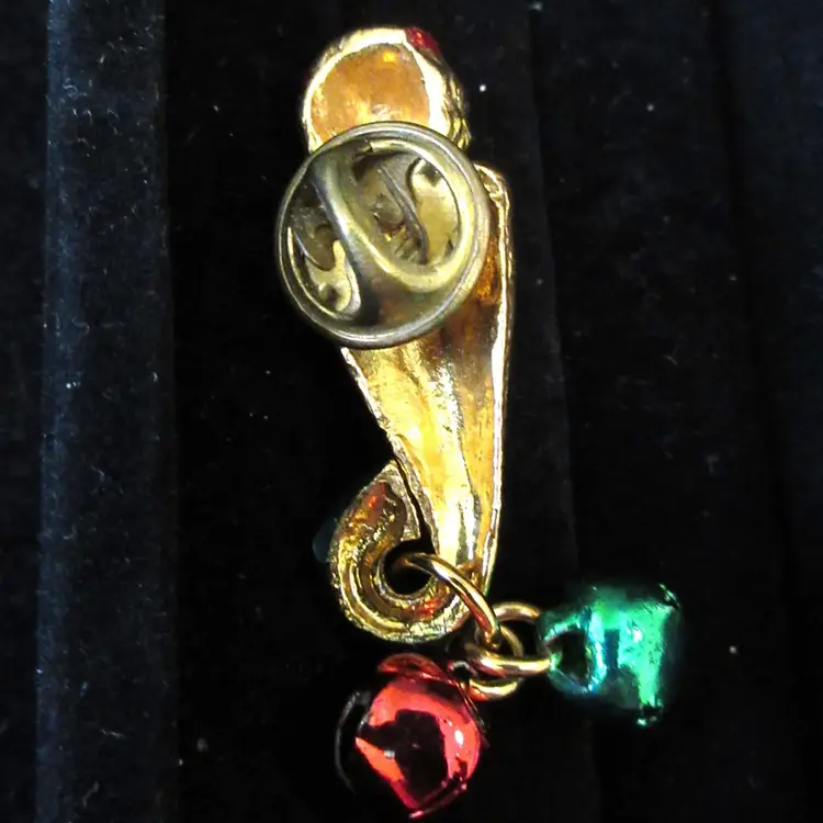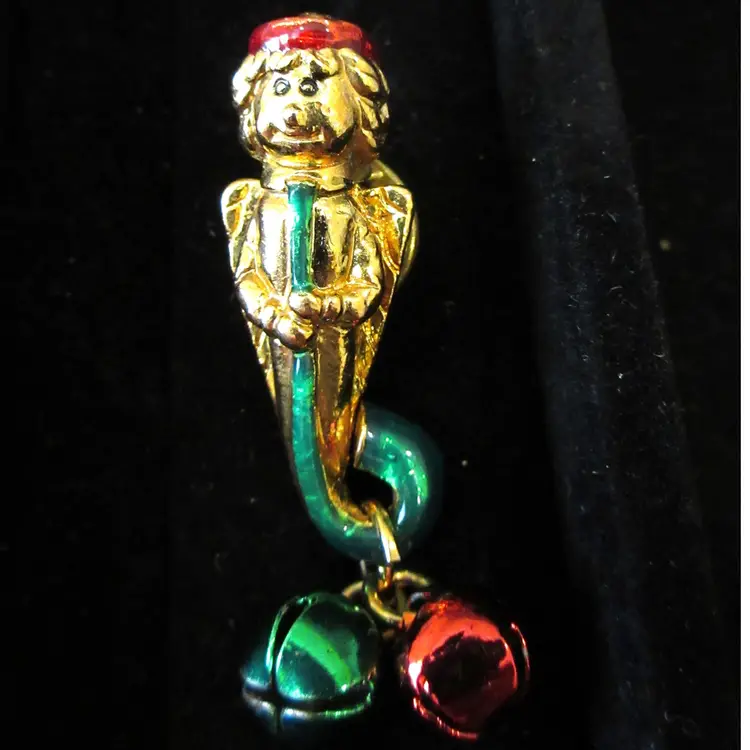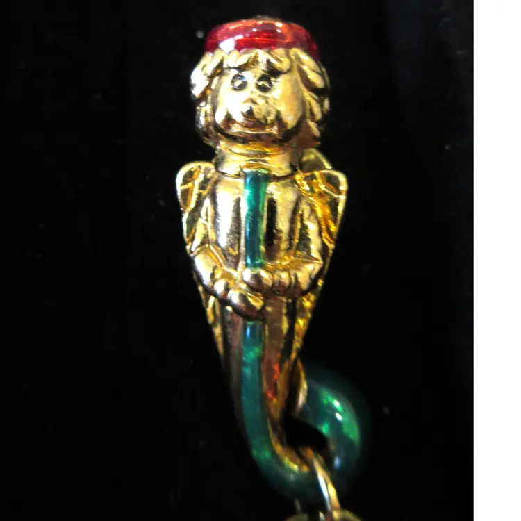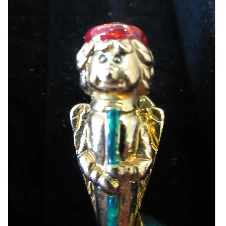 This is an ADORABLE VINTAGE gold tone metal Christmas angle pin/tie tack. The angel is colored with red and green enamel and is holding a long horn. He has a very expressive face, which is amazingly detailed for something so small. He almost looks like a Dr. Seuss character. The angel has red and green jingle bells attached to the bottom of the horn. This pin is 1.75 inches tall and has a stick back with a butterfly clamp.