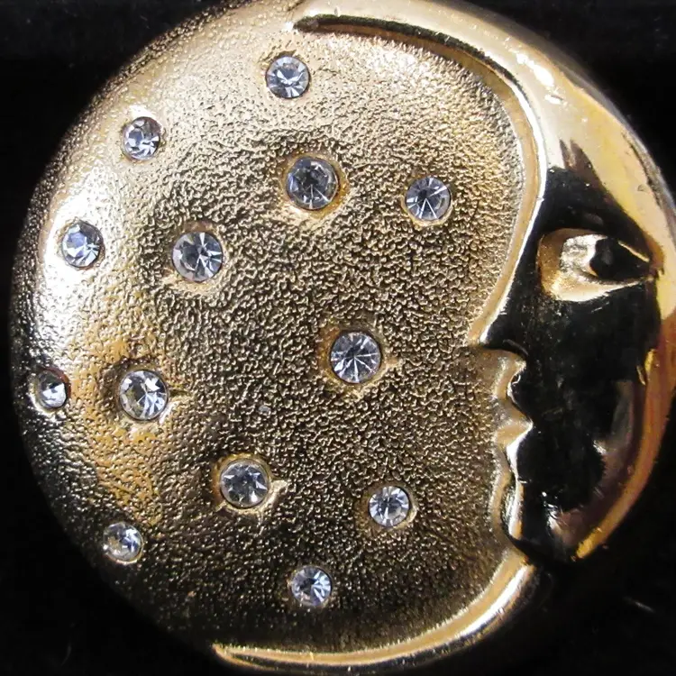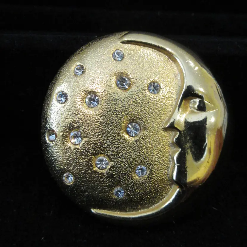This is a BEAUTIFUL vintage gold tone metal brooch from the 1980s. The brooch is shaped like a crescent moon in a night sky full of stars. The stars are made of deep set crystal clear rhinestones. It's a nice chunky brooch! It is 1.5 inches in diameter and has a pin back with a sliding C closure.