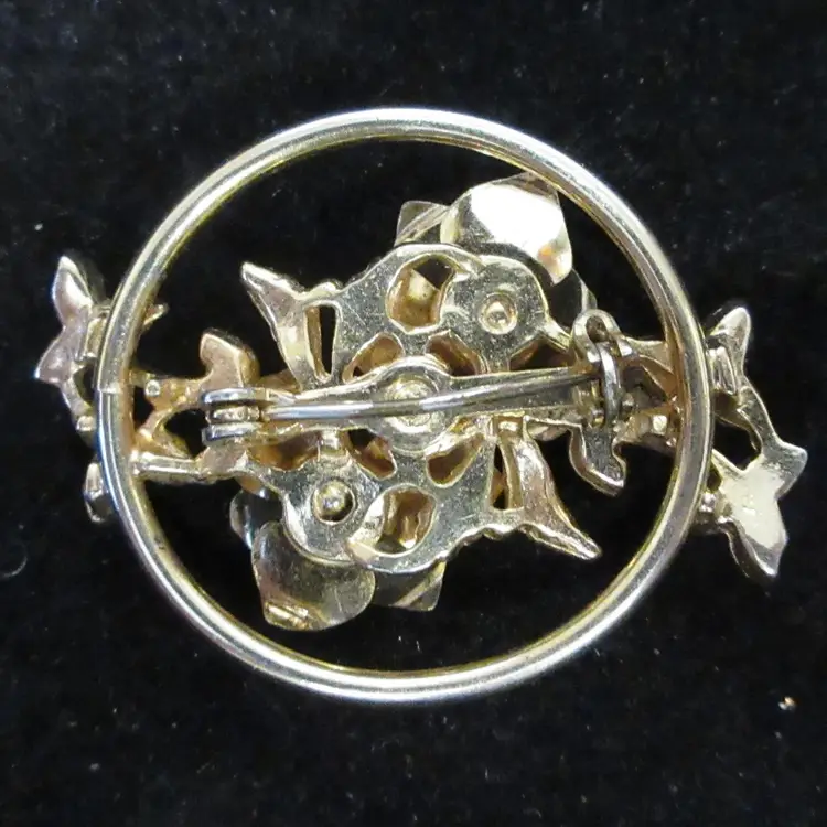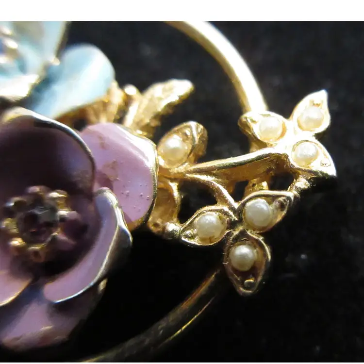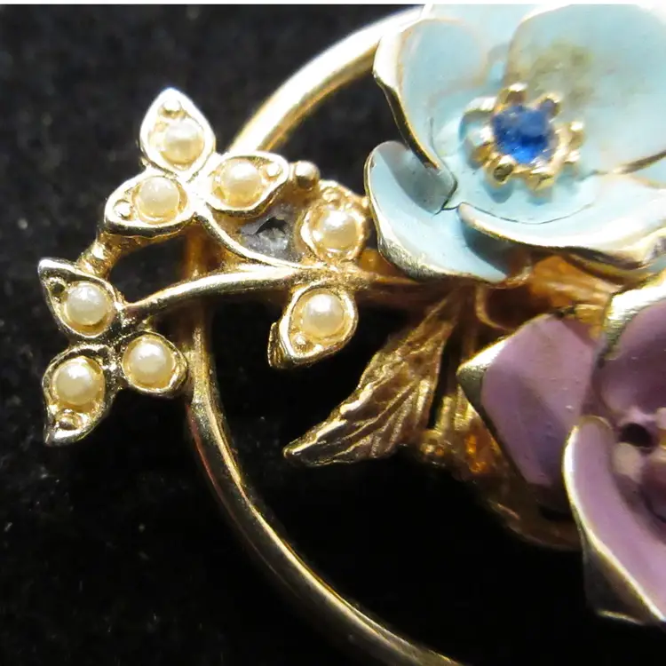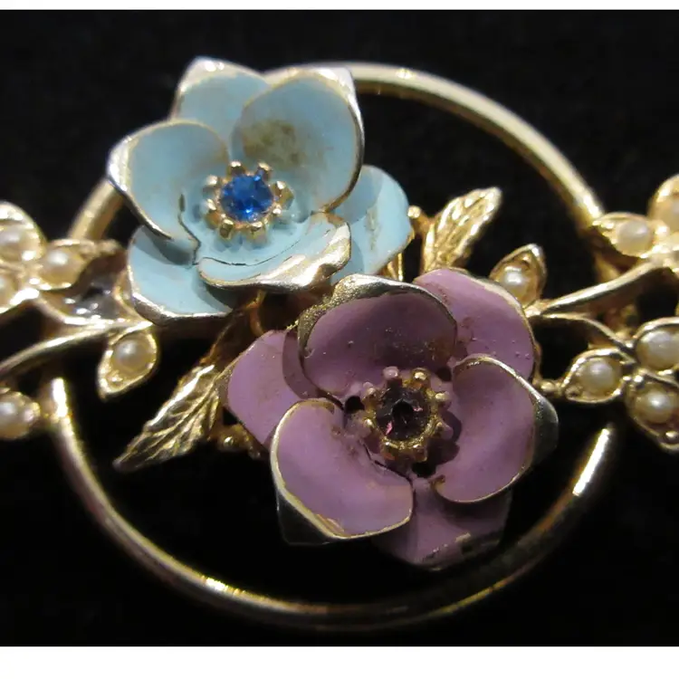 This is a beautiful VINTAGE gold tone metal brooch featuring 2 enamel flowers and branches with leaves. The flowers are enameled with light blue and lavender. Their centers have rhinestones that match their colors. The leaves are adorned with tiny faux pearls that make them glisten in the light. The flowers are framed with a thin gold tone metal circle. This brooch is 1.5 inches long and has a pin back with a sliding C closure.