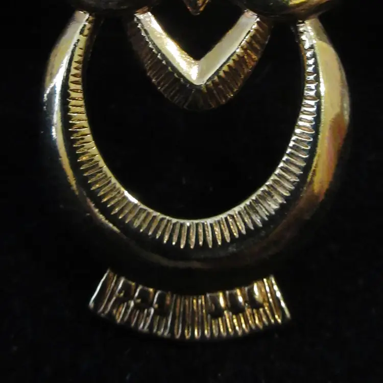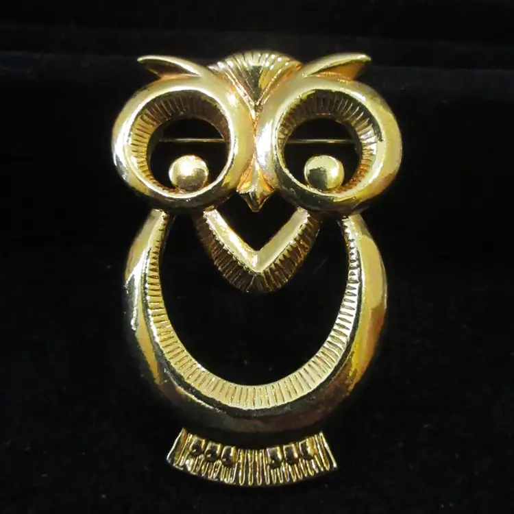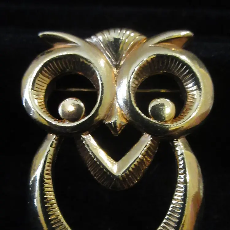 This is an AMAZING vintage gold tone metal brooch/pin shaped like an owl. The pin is from the 1970s and is perfectly kitschy. It is made of a pressed gold tone metal and is about 1.75 inches tall and 1.25 inches wide. It has a pin back with a sliding C closure.