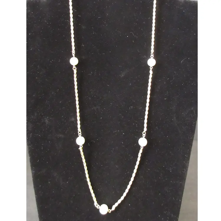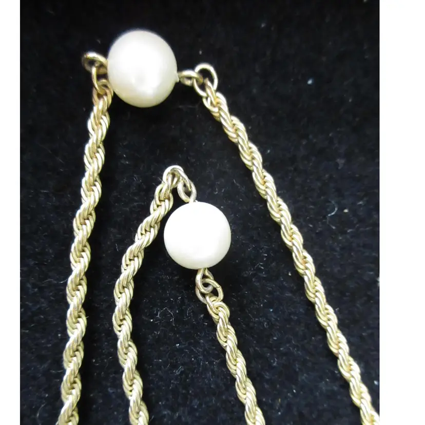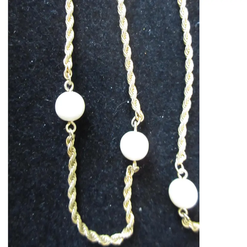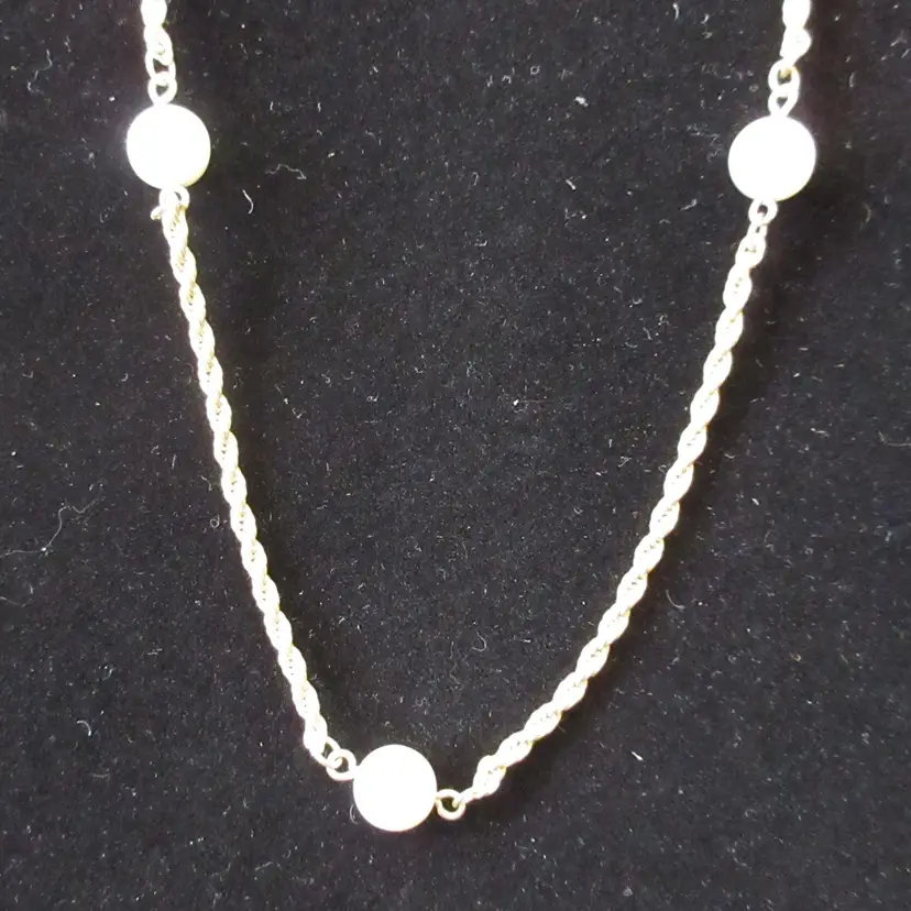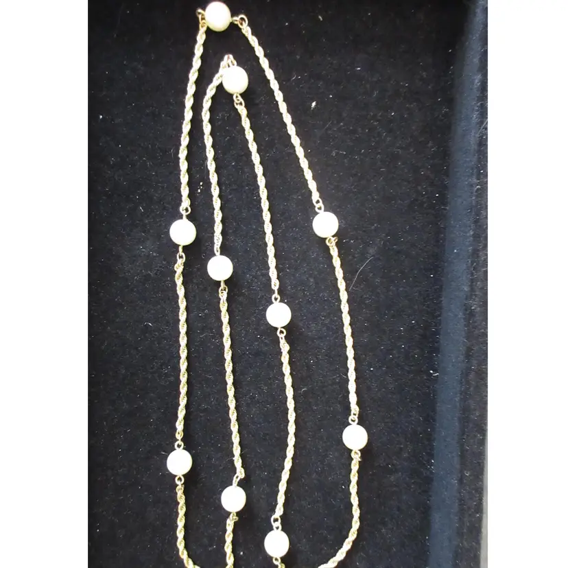 This is a BEAUTIFUL VINTAGE gold tone metal rope chain continuous (no closure) necklace with floating faux pearls. It's not quite a station necklace, but the pearl beads are uniformly distributed along the rope chain. This is a continuous necklace, which means it's meant to be place over the head, without a closure. It is 28 inches long.