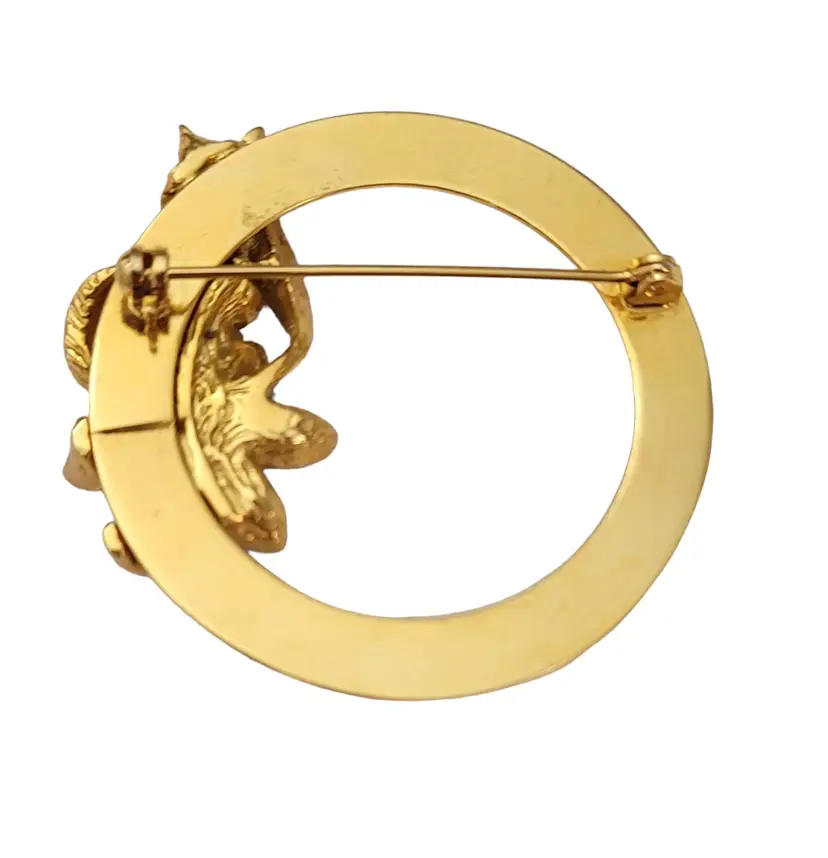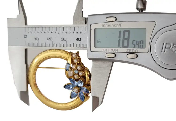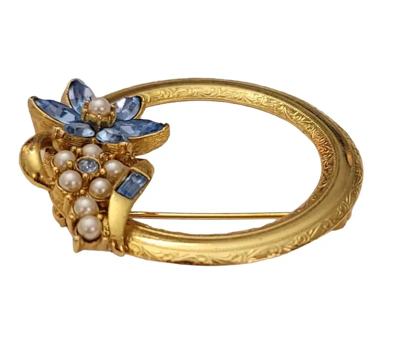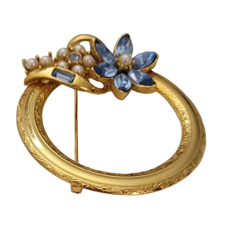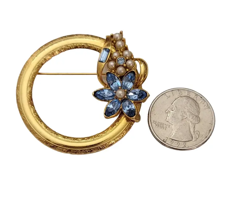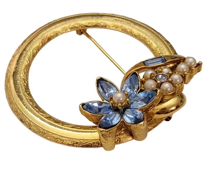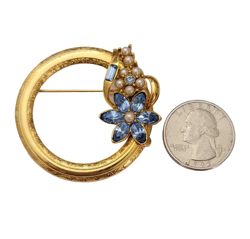 Add a touch of vintage-style glamour to your ensemble with this stunning brooch. It features an open-round pin in radiant gold tone with engraved detailing, decorated with a floral motif, exquisitely embellished with blue marquise-shaped faceted rhinestones and faux pearls. It measures approximately 1.8 inches in diameter. Secured with a locking pin clasp at the back, that functions properly and is in good vintage condition.