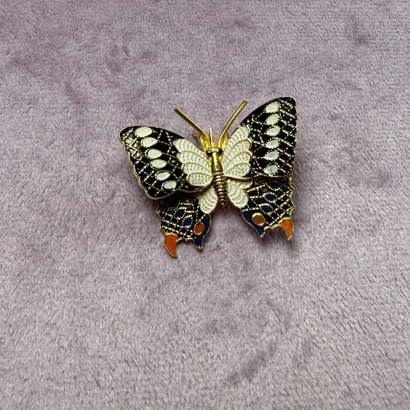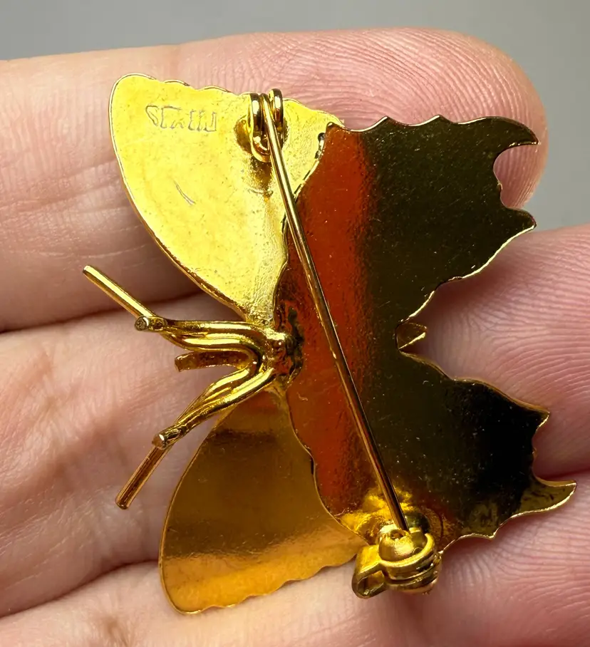 Vintage Gold Tone Orange Tail Damascene Butterfly Brooch Pin Marked Spain Enamel. 1" long x 1.5" across. Excellent condition. Signed Spain on back.