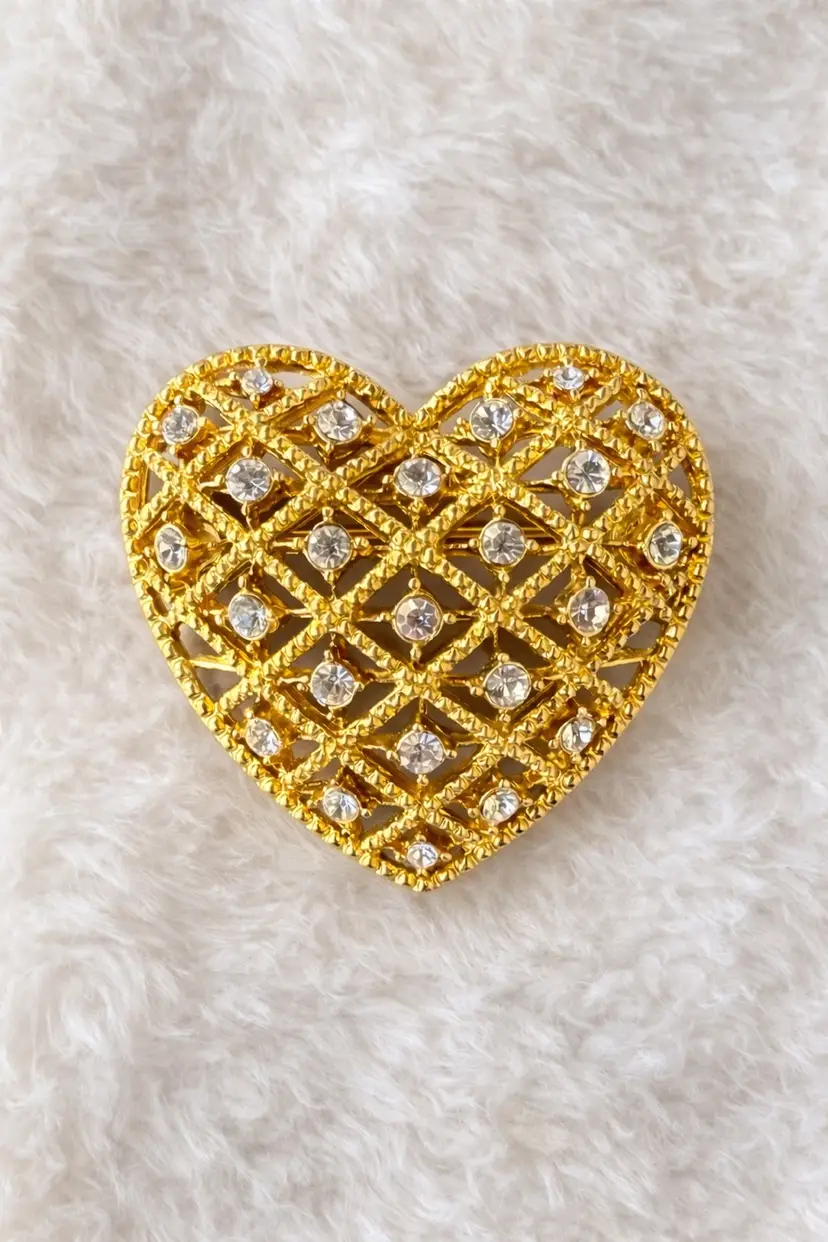 Vintage gold tone heart brooch featuring an intricate lattice / filigree design set with sparkling clear rhinestones.