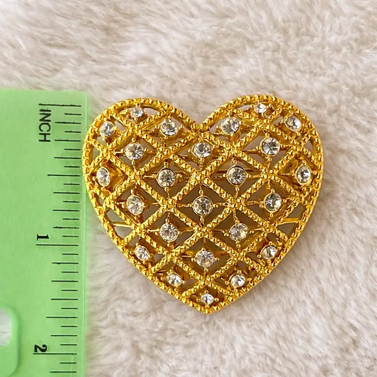 Details • Heart shaped gold tone brooch • Clear rhinestone accents • Intricate lattice / filigree design • Secure pin clasp on back • Approx. 1.5 inches (see ruler photo for scale) • Good pre-owned condition