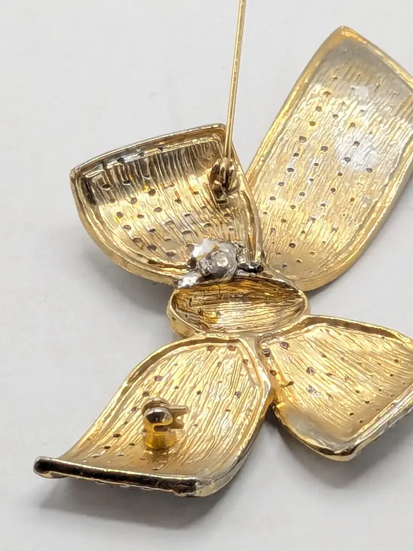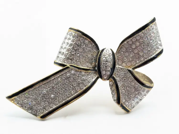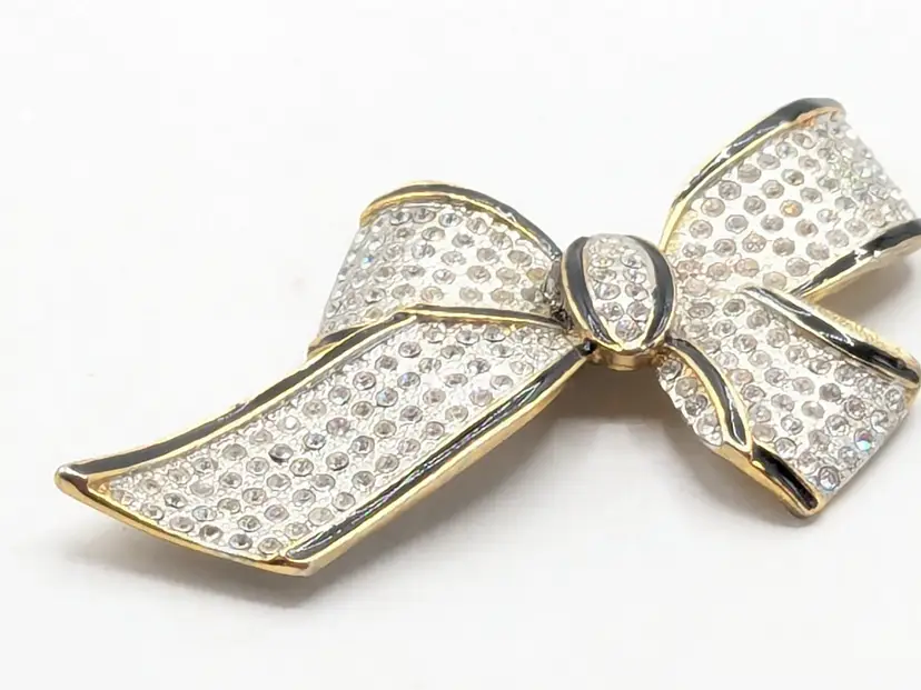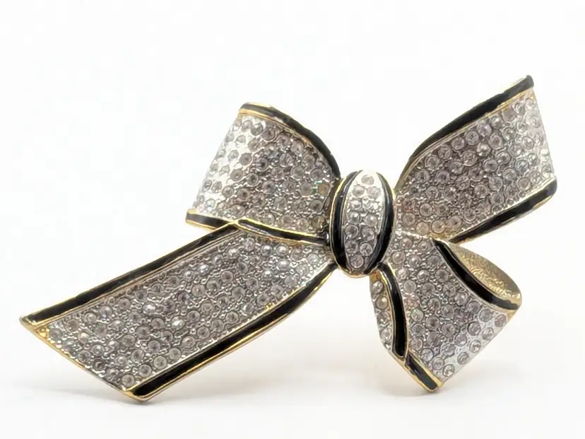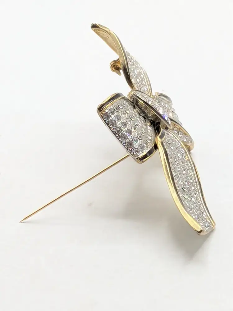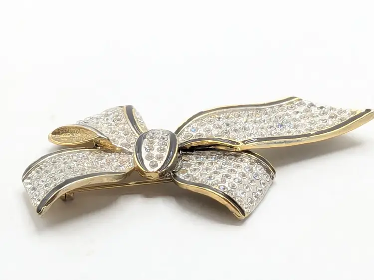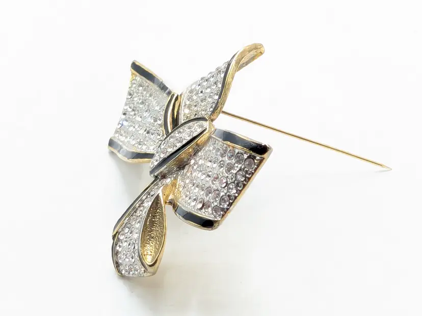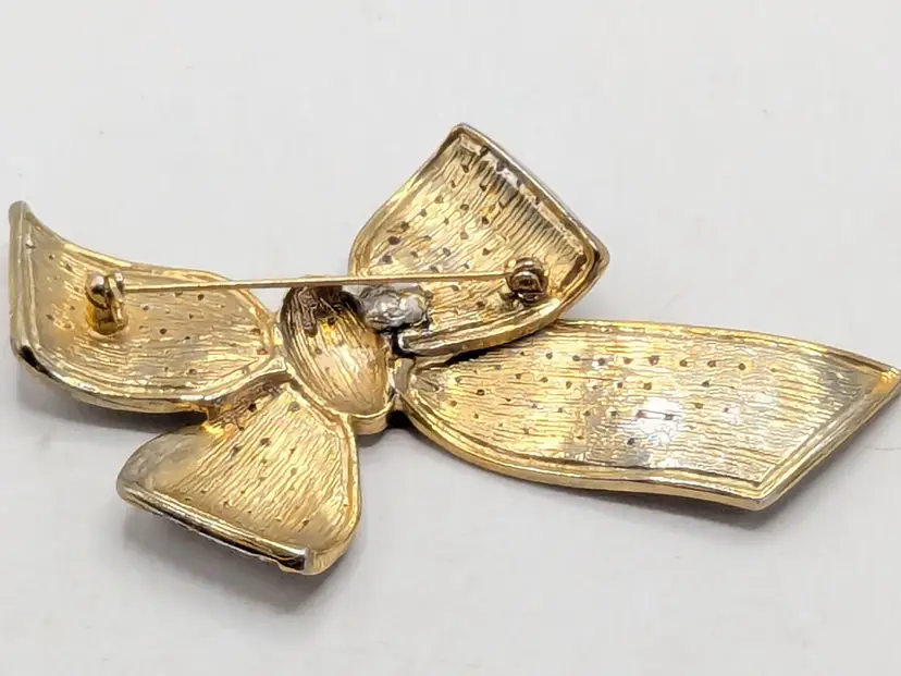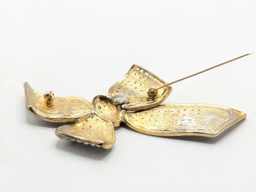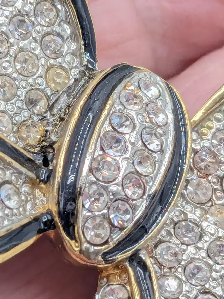 Good condition. Missing one stone located on the left on the tail of bow, 4th from top. Very hard to notice it's missing. Easy fix. Gold tone is bright and shiny with no color loss. Black enameling. Measures 2 1/8" in length and 3 3/4" wide. wen