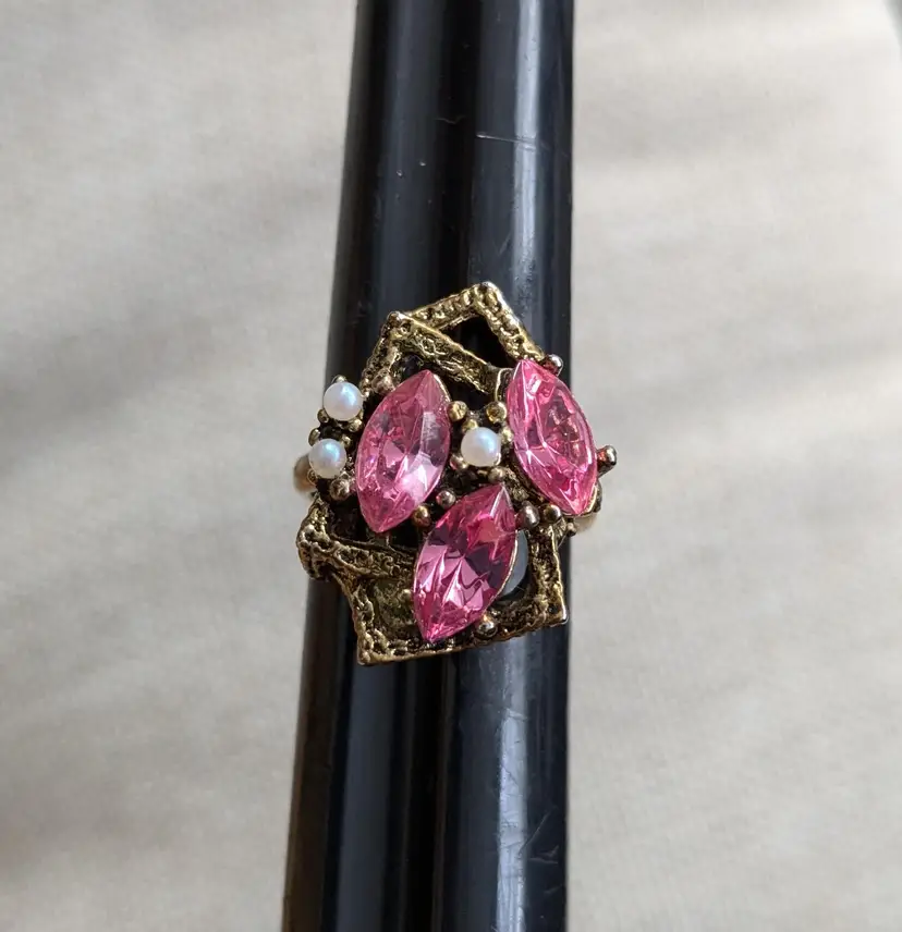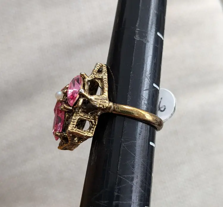 The face of the ring is 1 inch long. Unmarked. Some wear on the band. Adjustable, currently a size 6.5.