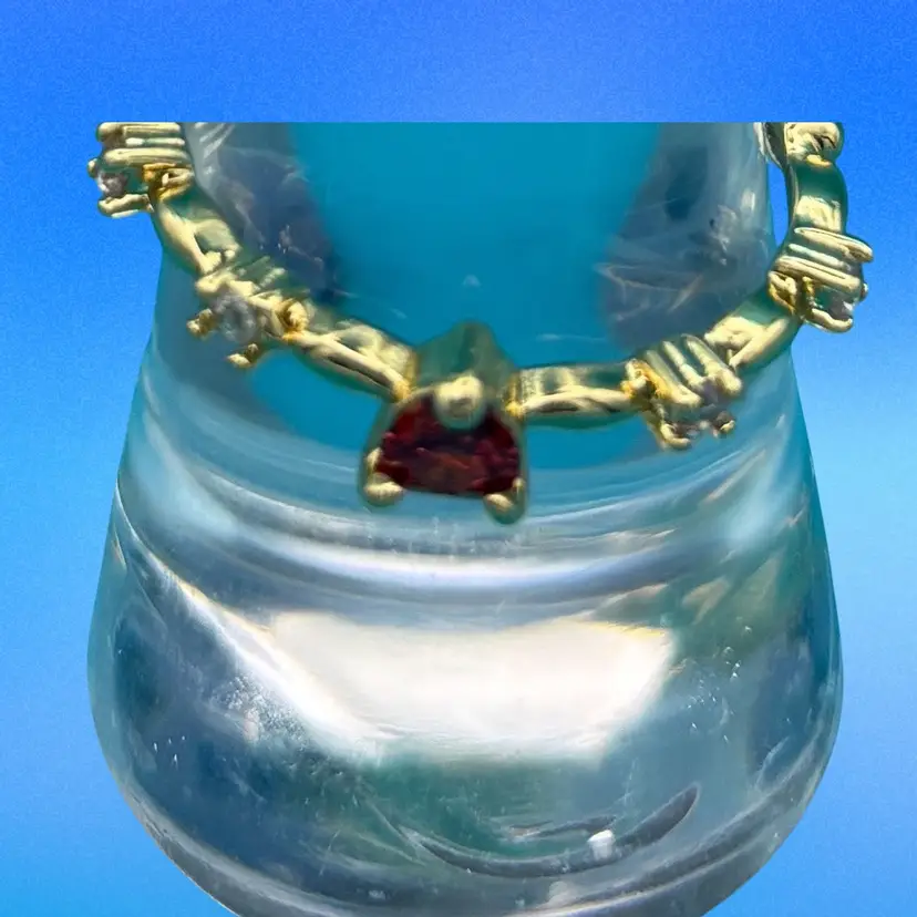 Elegant vintage-inspired ring featuring a striking trillion-cut deep red stone at the center, accented with sparkling clear rhinestones along a gold-tone band. The bold triangular setting gives it a modern yet timeless appeal. Ring size 8.5 – perfect for evening wear, special occasions, or adding a pop of color to your everyday look.