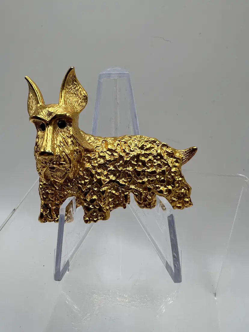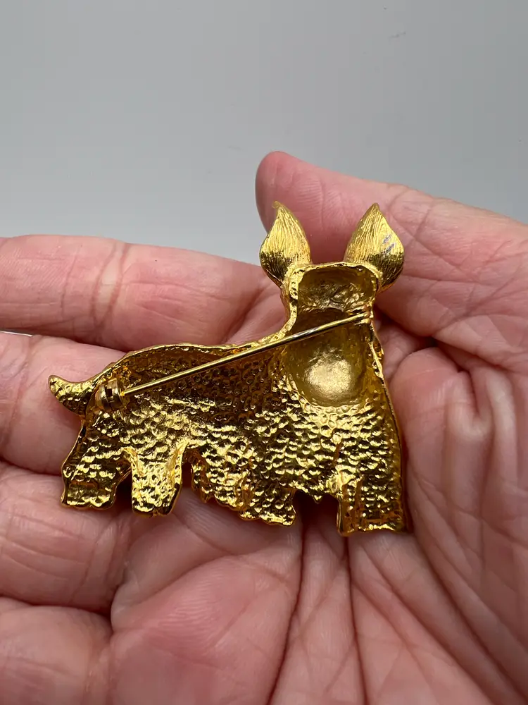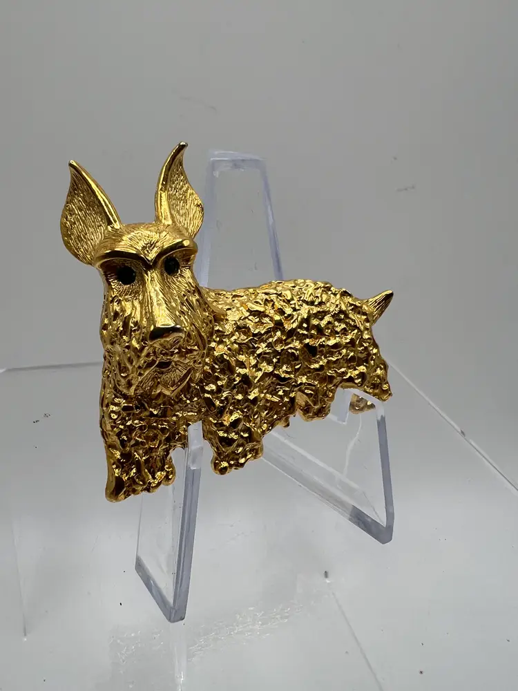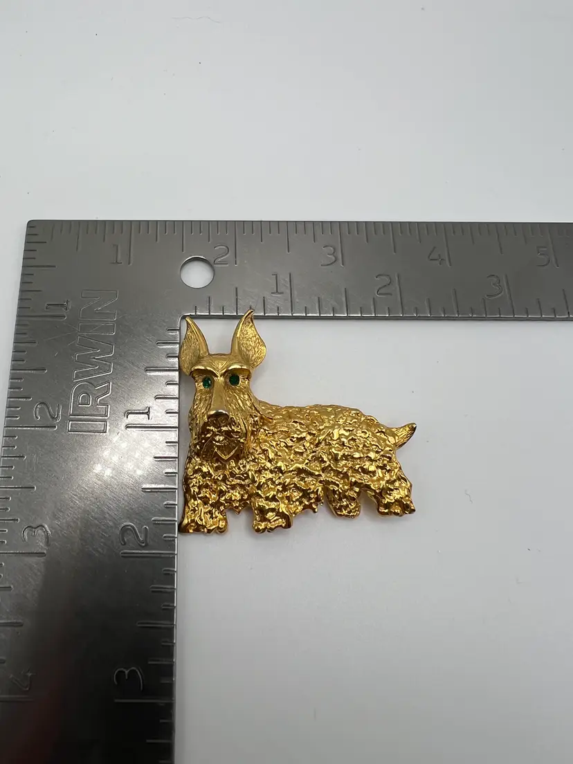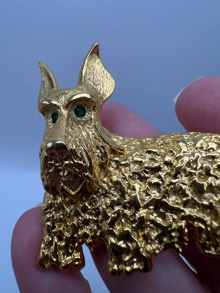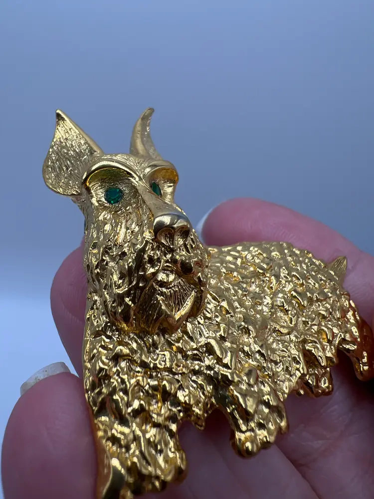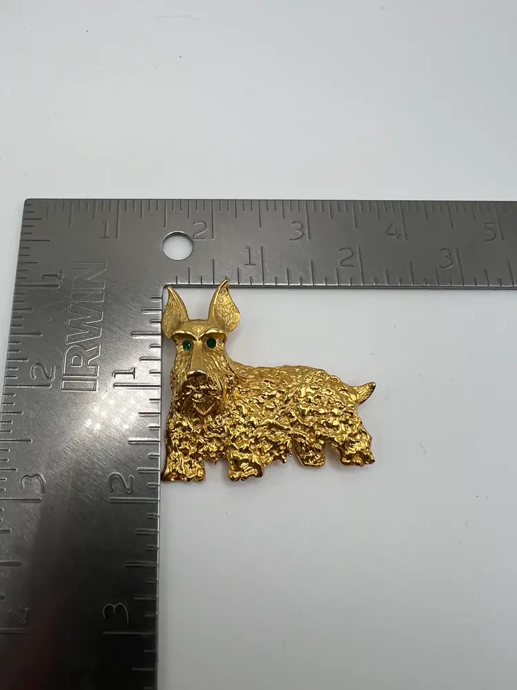 Vintage gold tone Scottish Terrier (Scotty dog) brooch featuring a heavily textured coat and vivid green rhinestone eyes. This piece has strong character and charm, with a dimensional design that stands out when worn.