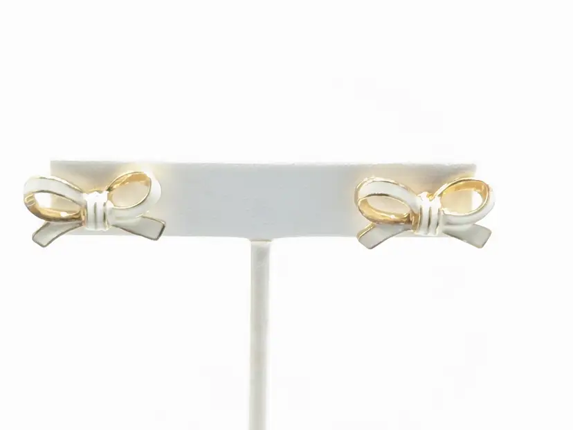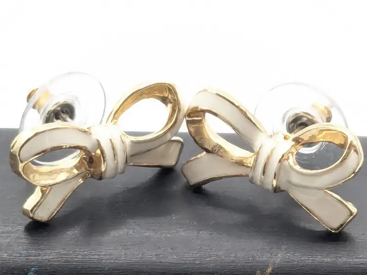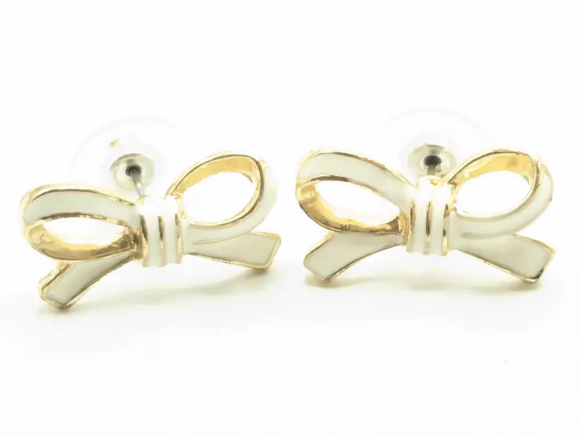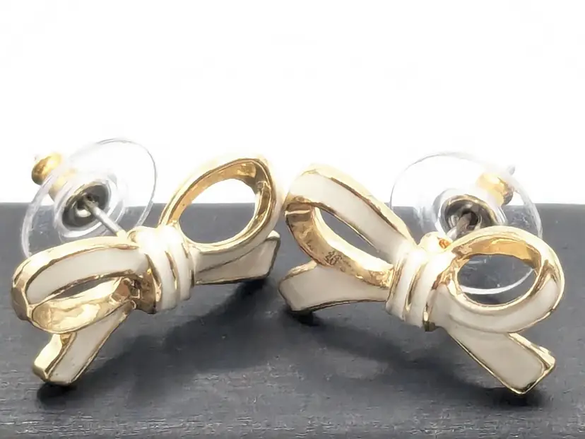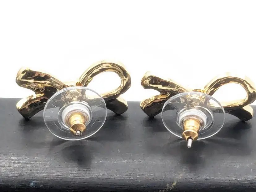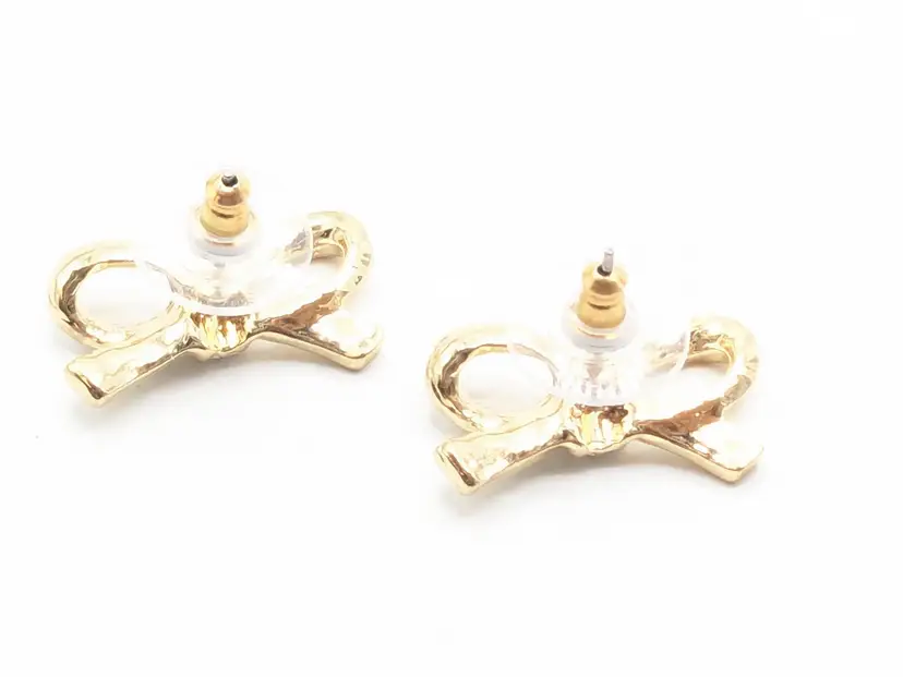 Good condition. Elegant gold tone bow design. Perfect for adding a touch of charm to any outfit. Measures 3/4" length and 3/8" height. (EN1)