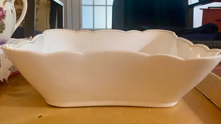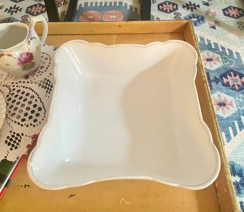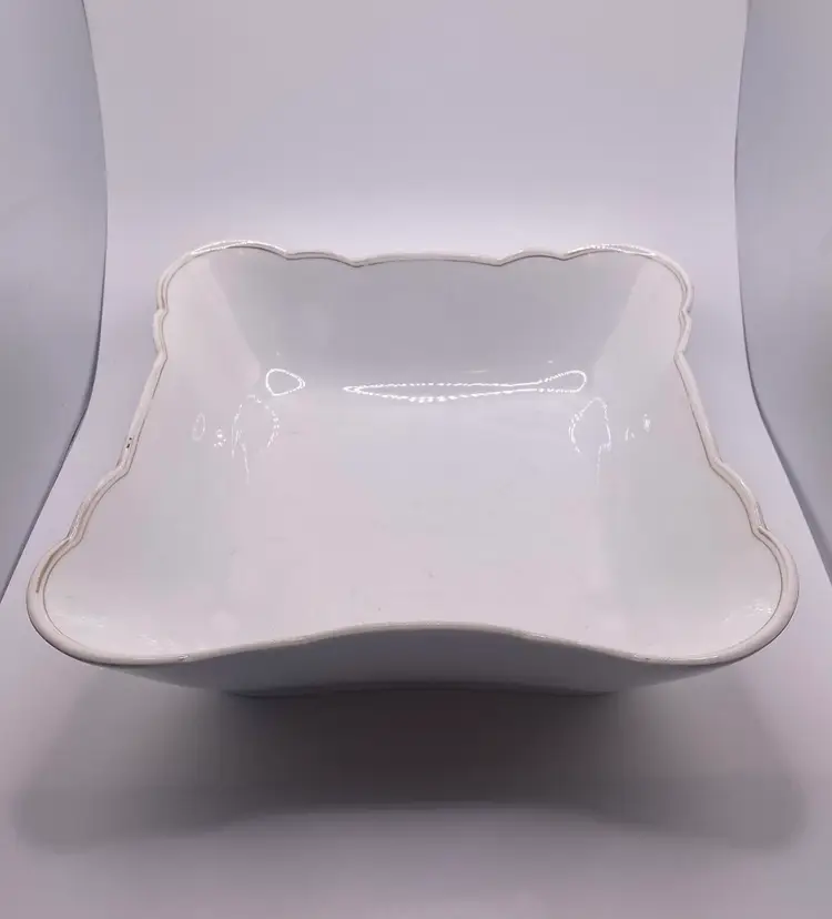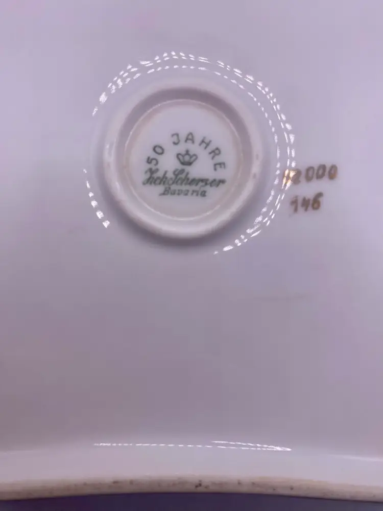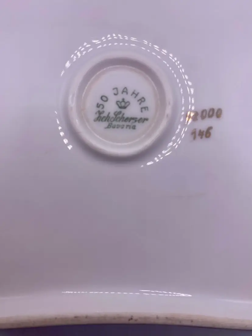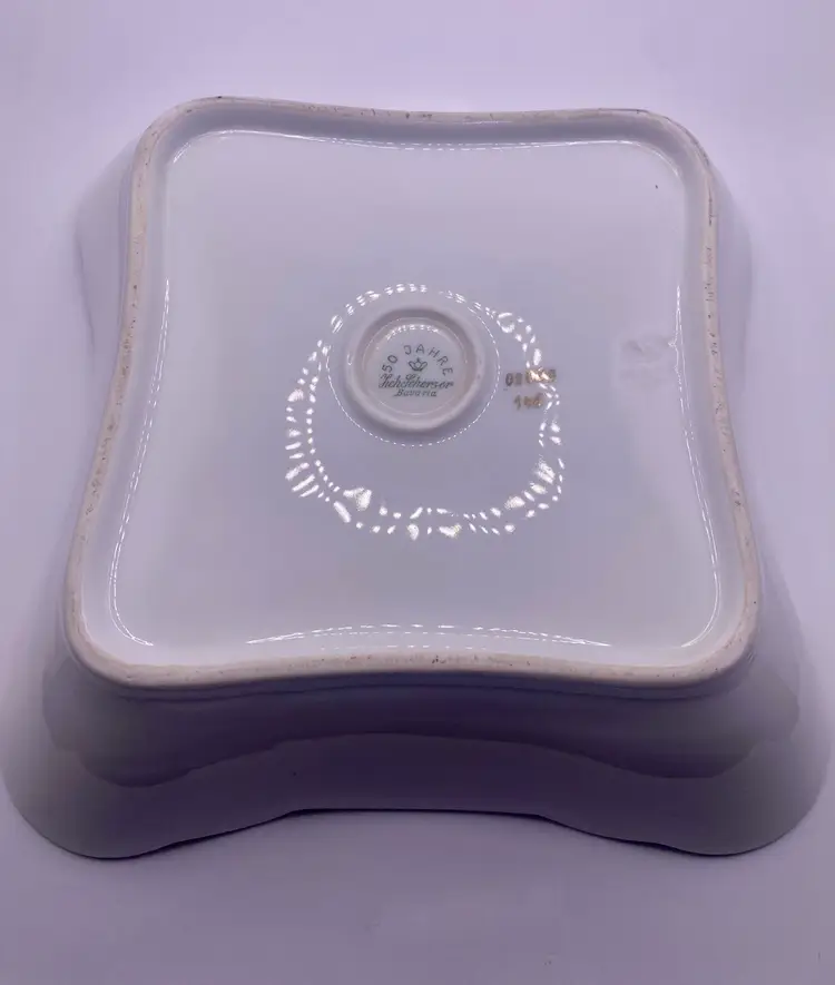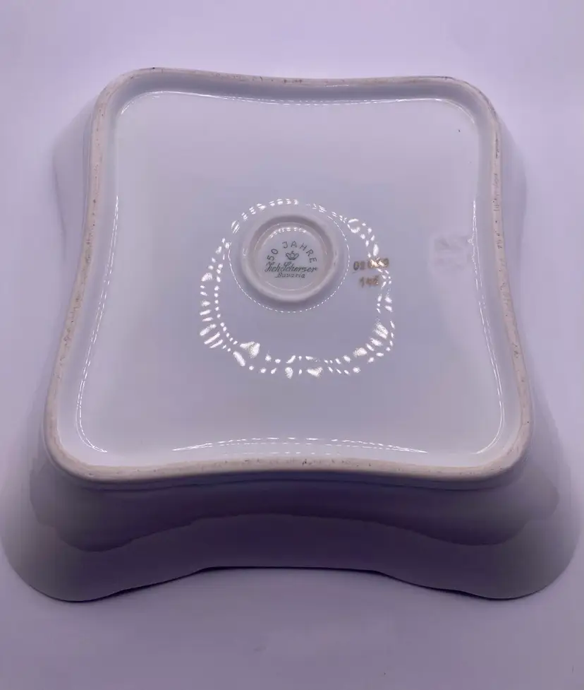 The phrase "50 Jahre" translates to "50 years," which could indicate a special edition piece celebrating an anniversary of the manufacturer, Zeh Scherzer. The bowl is likely made of porcelain and produced in Bavaria, Germany. It has a squared shape with scalloped edges and appears to have a subtle iridescence to the white glaze. It also has a gold trim around the rim, although it may be partially worn or obscured in the image. The original description mentions a "50 Jahre" mark on the bottom, indicating a 1930 production year.
