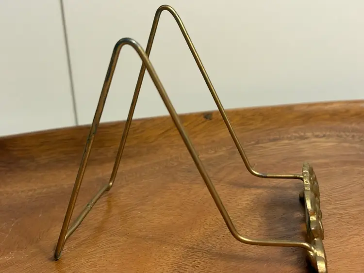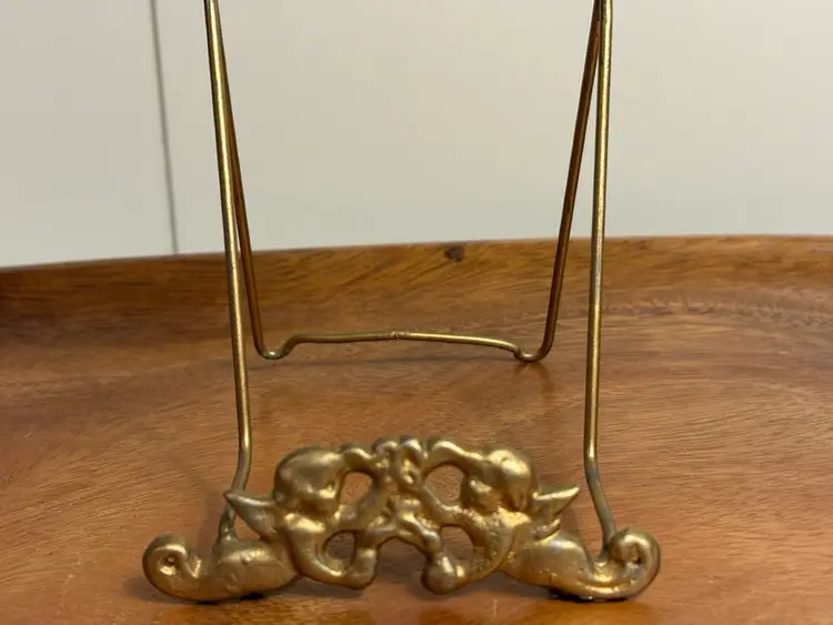 The Vintage Gold Wire Cherub Easel Plate Stand is a decorative accessory designed for displaying pictures, art, or books. Made of metal in a beautiful gold color, this free-standing easel features a charming cherub design that adds a touch of vintage elegance to any space. Its sturdy construction and unique style make it a versatile piece for showcasing your favorite items in a visually appealing way. Perfect for home décor, this plate stand is sure to enhance the look of any room with its timeless and classic design.