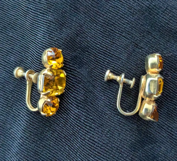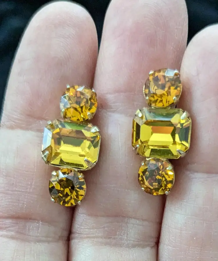 The color of these is so vibrant and unusual that the closest description I can think of is marigold. 7/8" long, prong-set stones, unmarked, screw back