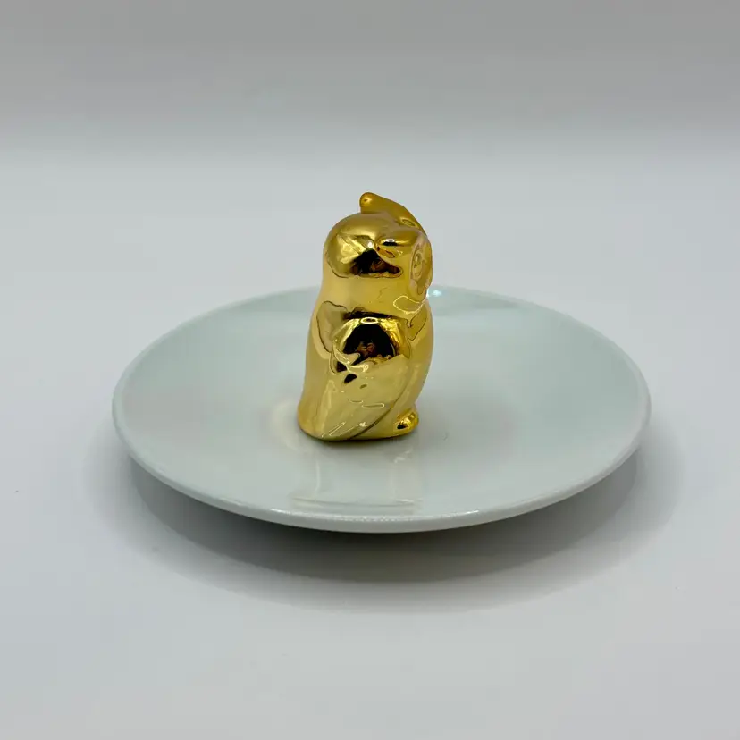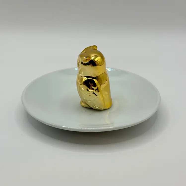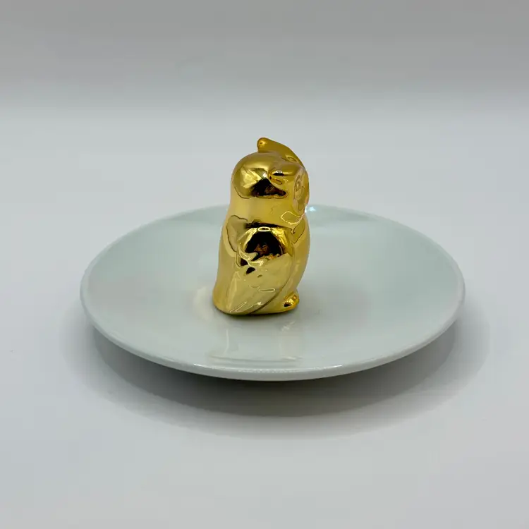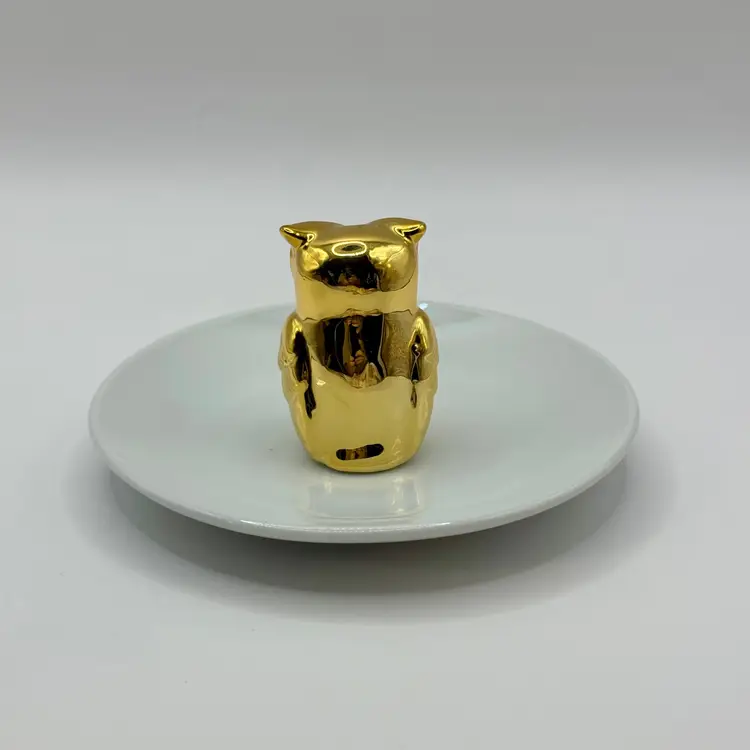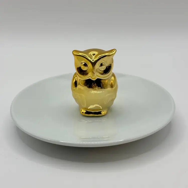 Add a touch of mid-century charm to your decor with this vintage golden owl figurine perched on a simple ceramic plate. Perfect for owl enthusiasts or as a unique accent piece in any room. In great condition, ready to adorn your space with a bit of retro flair. Measures 5.25x3.5x3. Weighs 1lb.